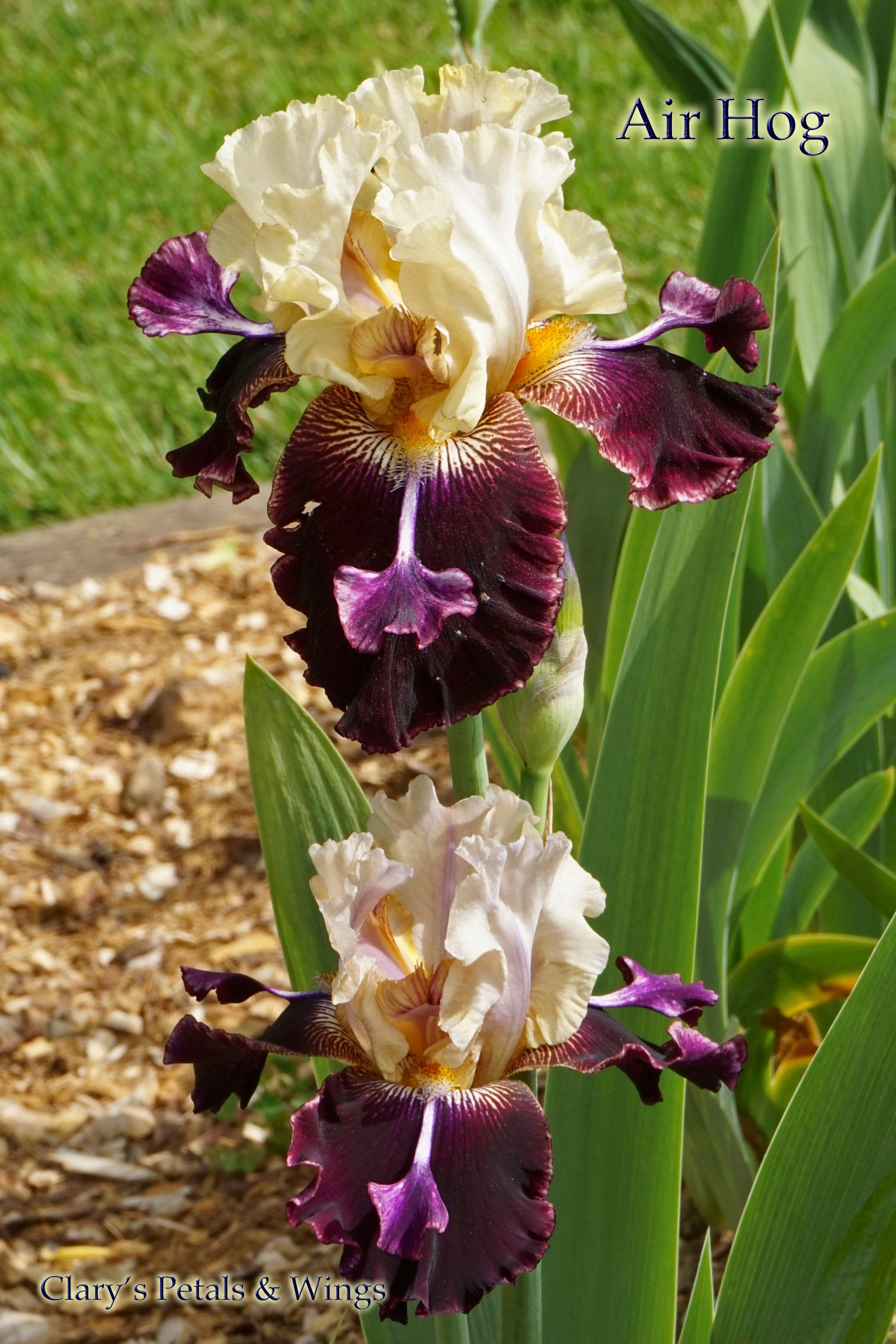 Cream yellow standards. Burgundy falls with lighter edges. Bronze beards have large uplifting burgundy spoons. Ruffled and has a spicy fragrance. Blooms mid to late season 36 inches tall.