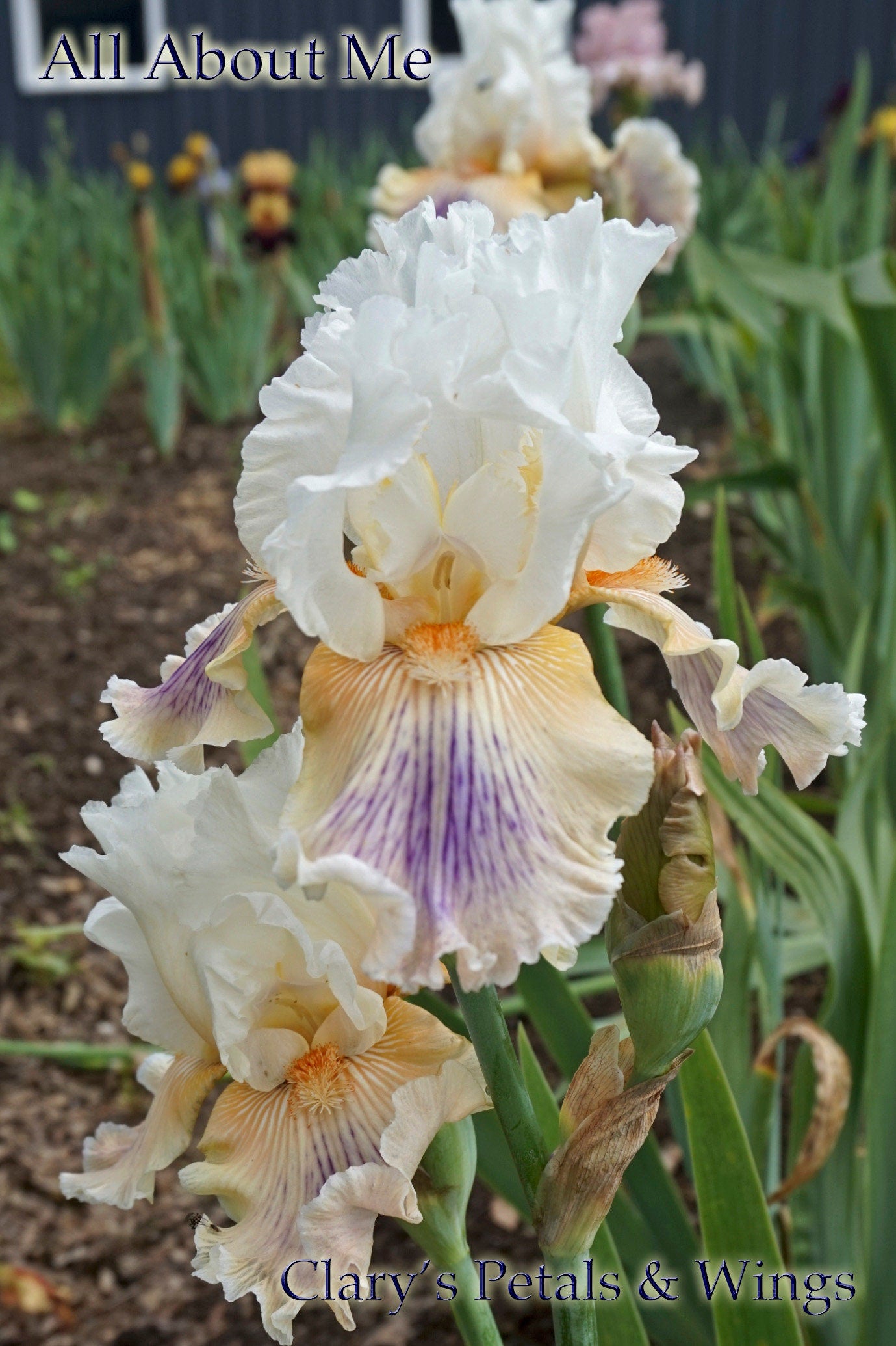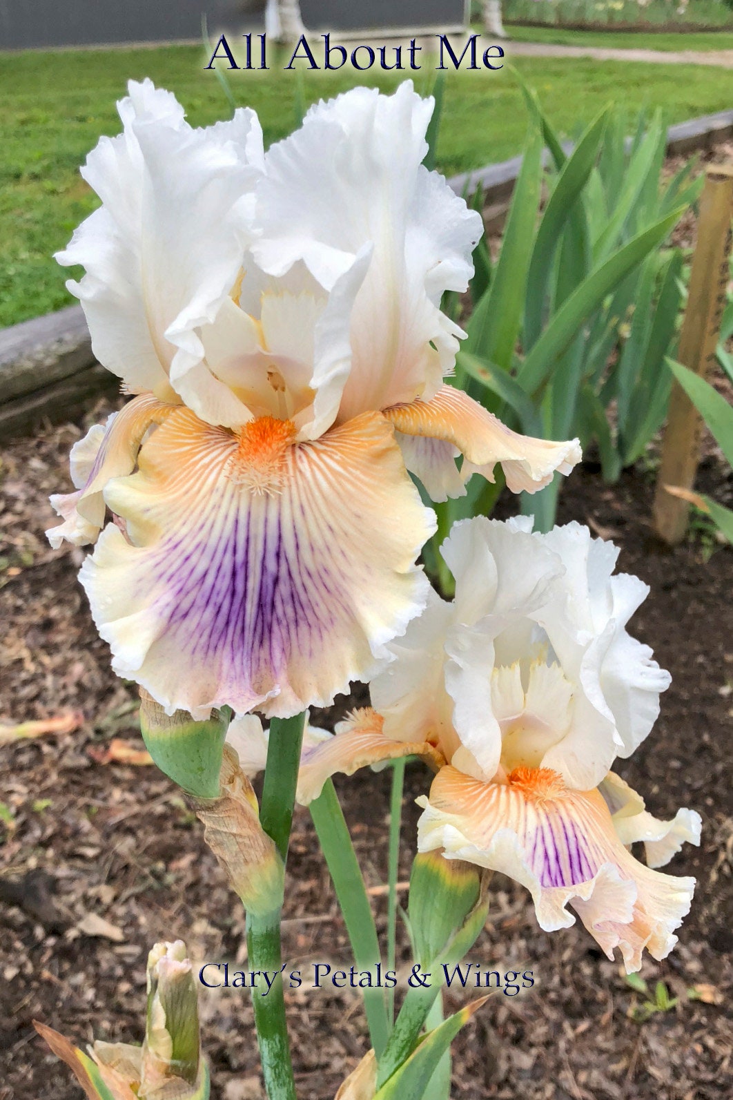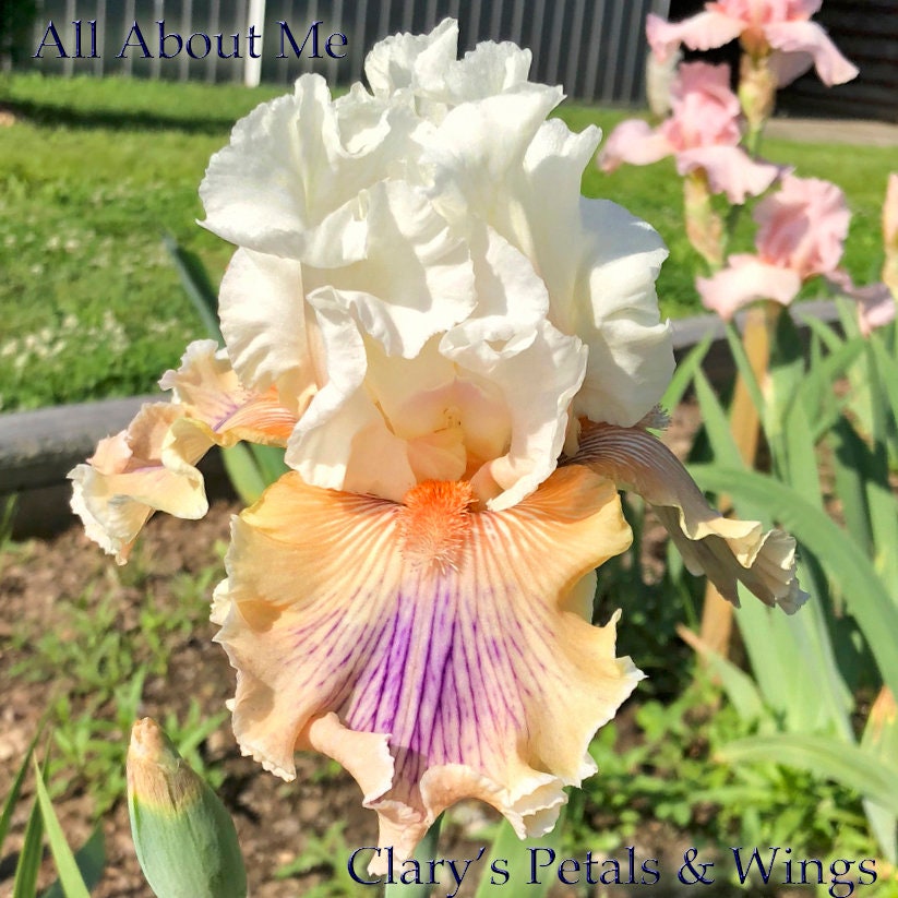Ruffled standards are white flushed pink. Mid to light peach falls are lightly laced. Hafts are darker peach and centers veined and washed mid purple. Beards are frosted orange and this beauty has a sweet fragrance.
