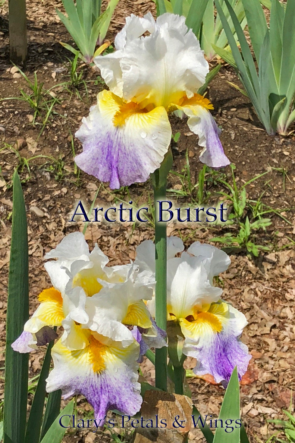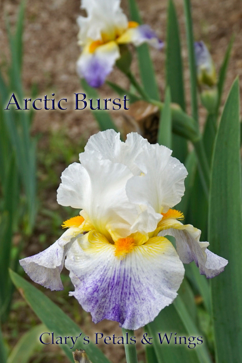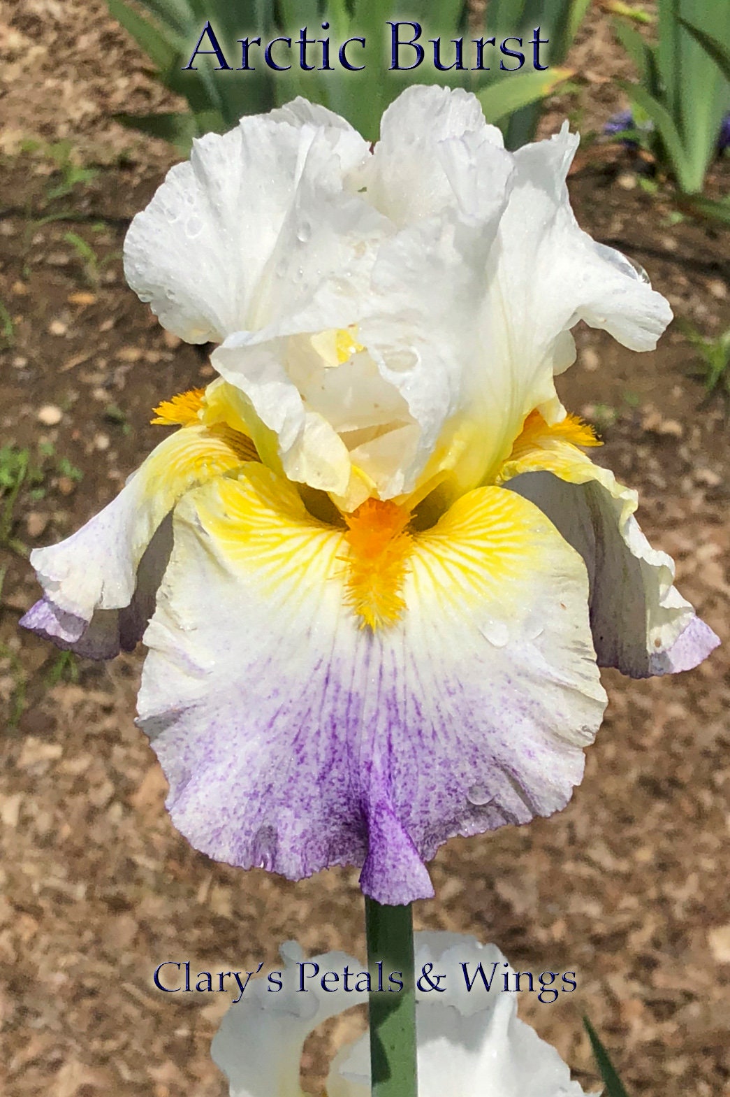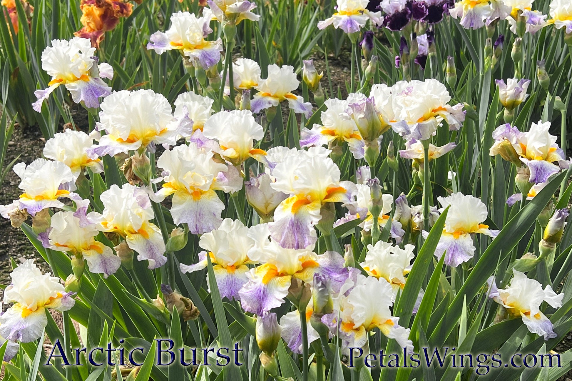 Cold white standards contrast nicely with the falls which are dusted violet, more pronounced on the bottom. Tangerine beards and gold haft marks maximize the magnetism of this incredibly floriferous beacon. Thick stems bear 3 branches and 12 slightly fragrant buds.
