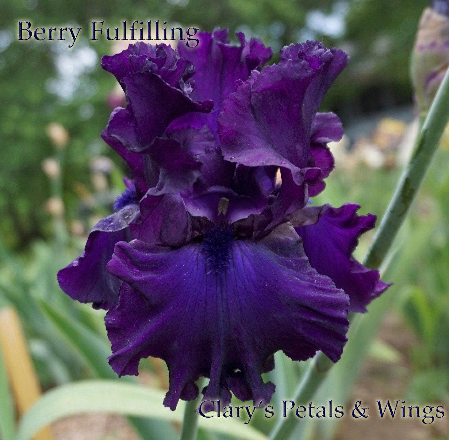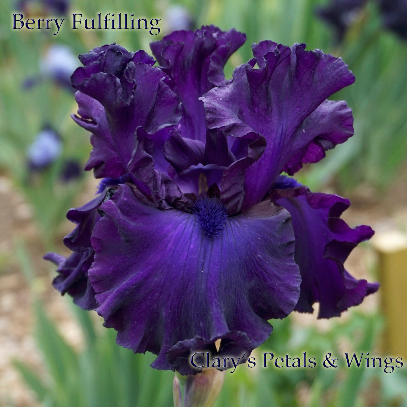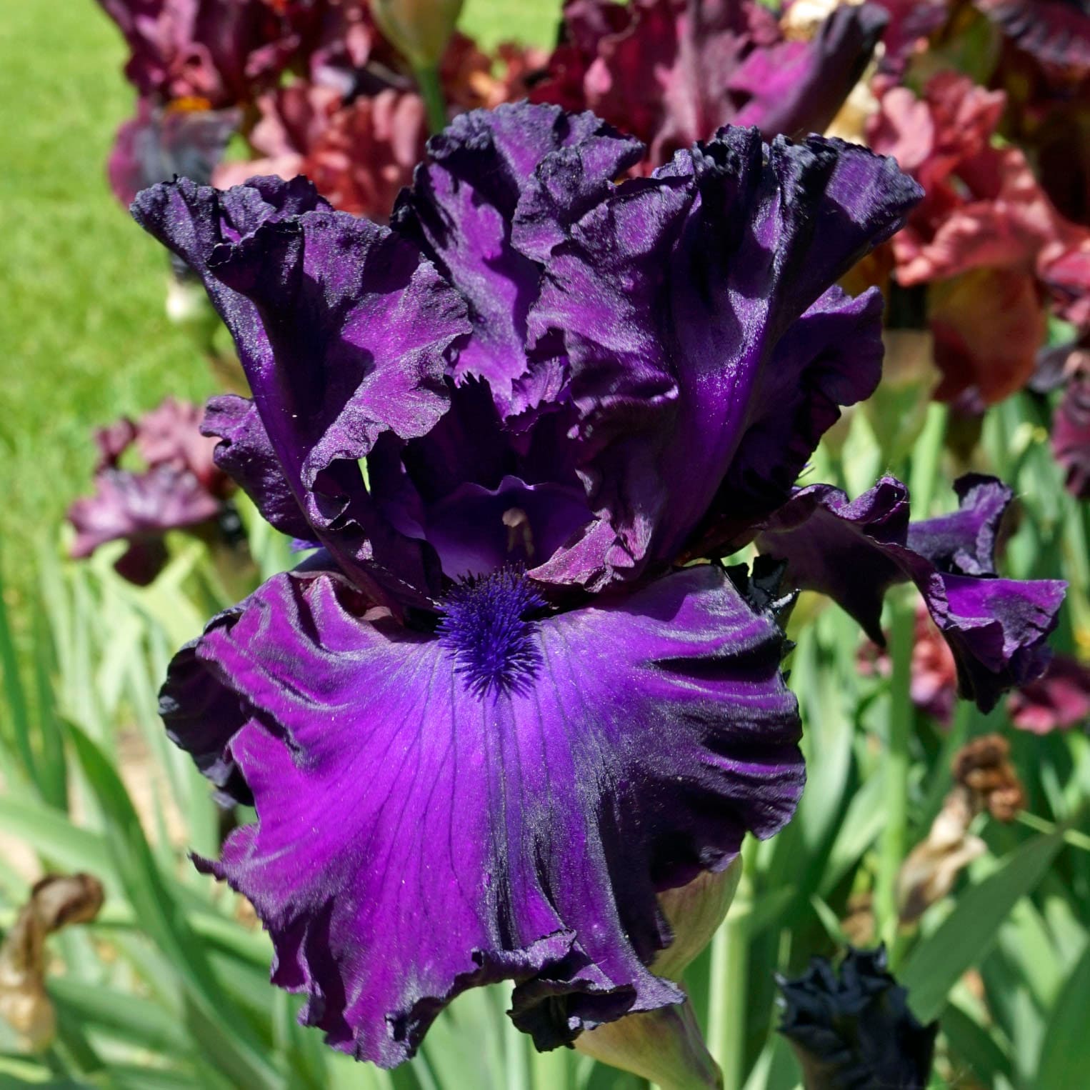 Arched standards, reddish-brown, set off the rich violet center of the wide falls. Blue on both the beard and the center of the falls. Large 6” x 6” flowers, 41” stalks and 8 blossoms per stem, blooms mid to late season.