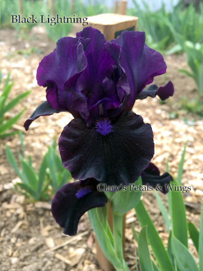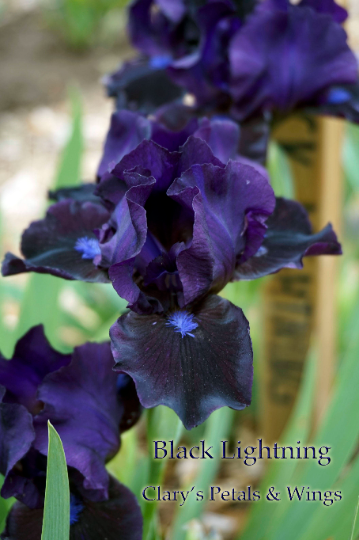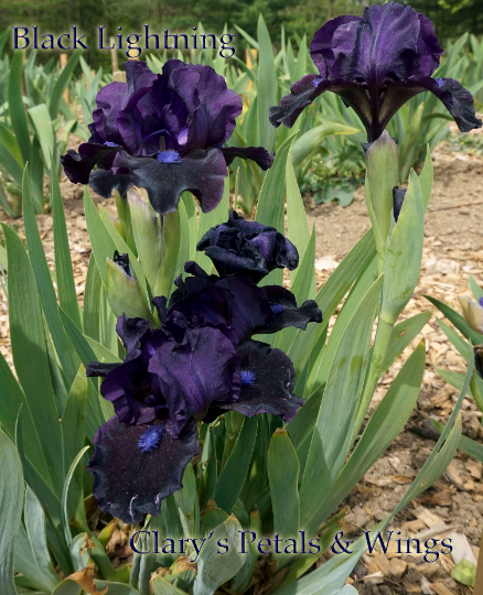 A gorgeous and hardy ruffled black iris with a contrasting violet beard. It has four flowers per stalk and remains in bloom for a long time. Grows to 14.5', blooms early, reblooms and quickly forms clumps.