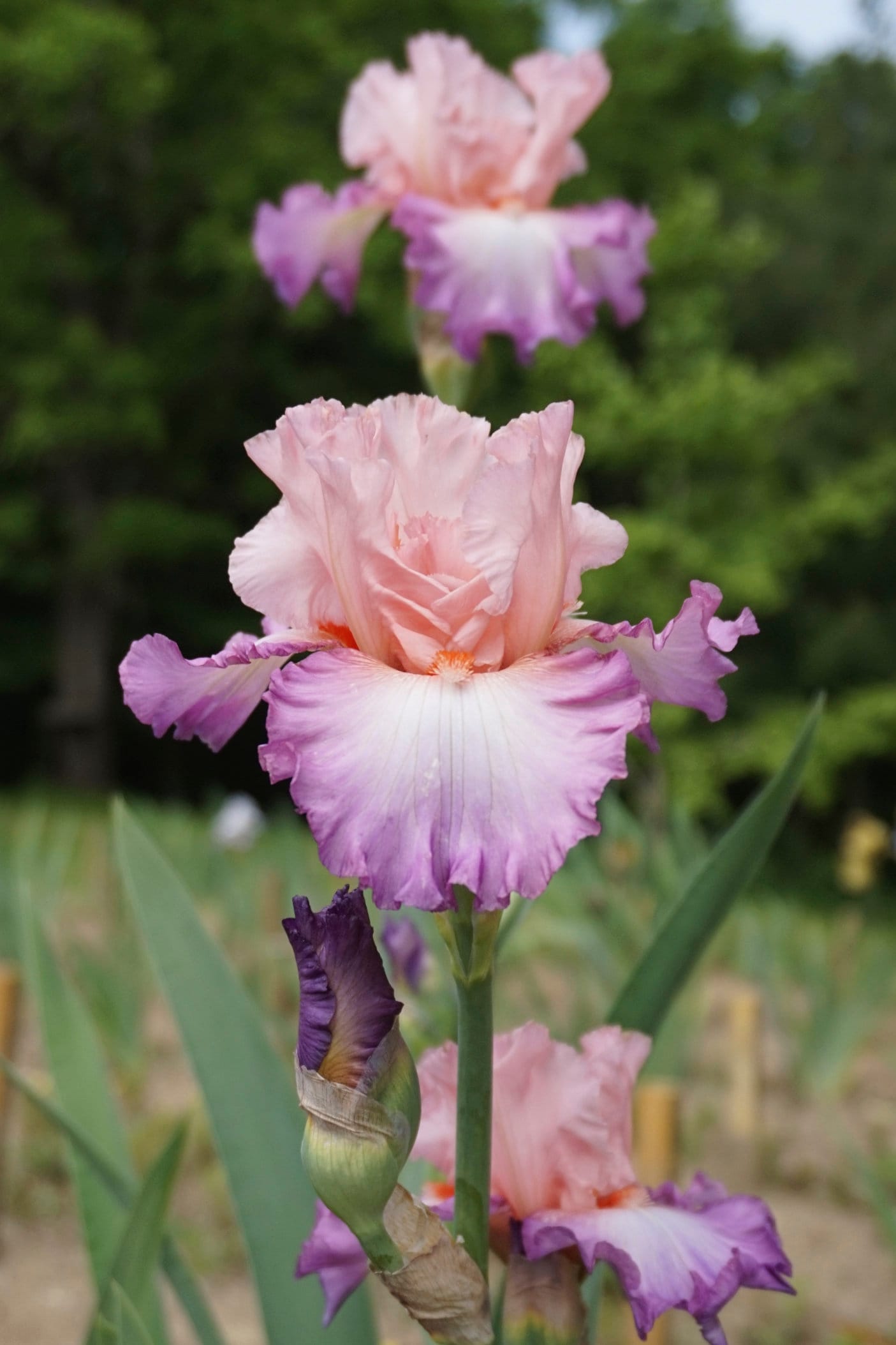 Ruffled and flaring form with orchid-pink falls lightening at the center, intensifying the effect of the bright coral beards. Blooms mid to late season on 40 inch stalks.