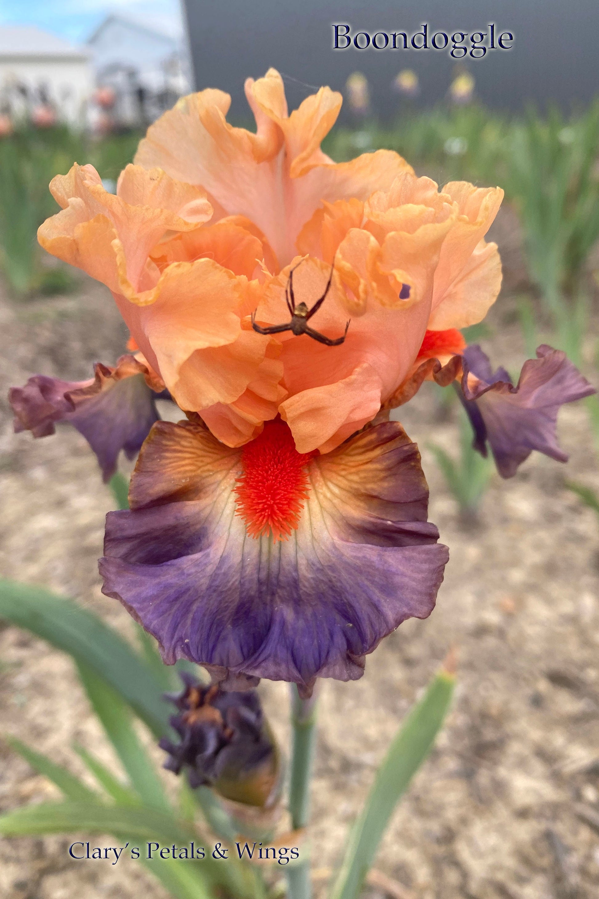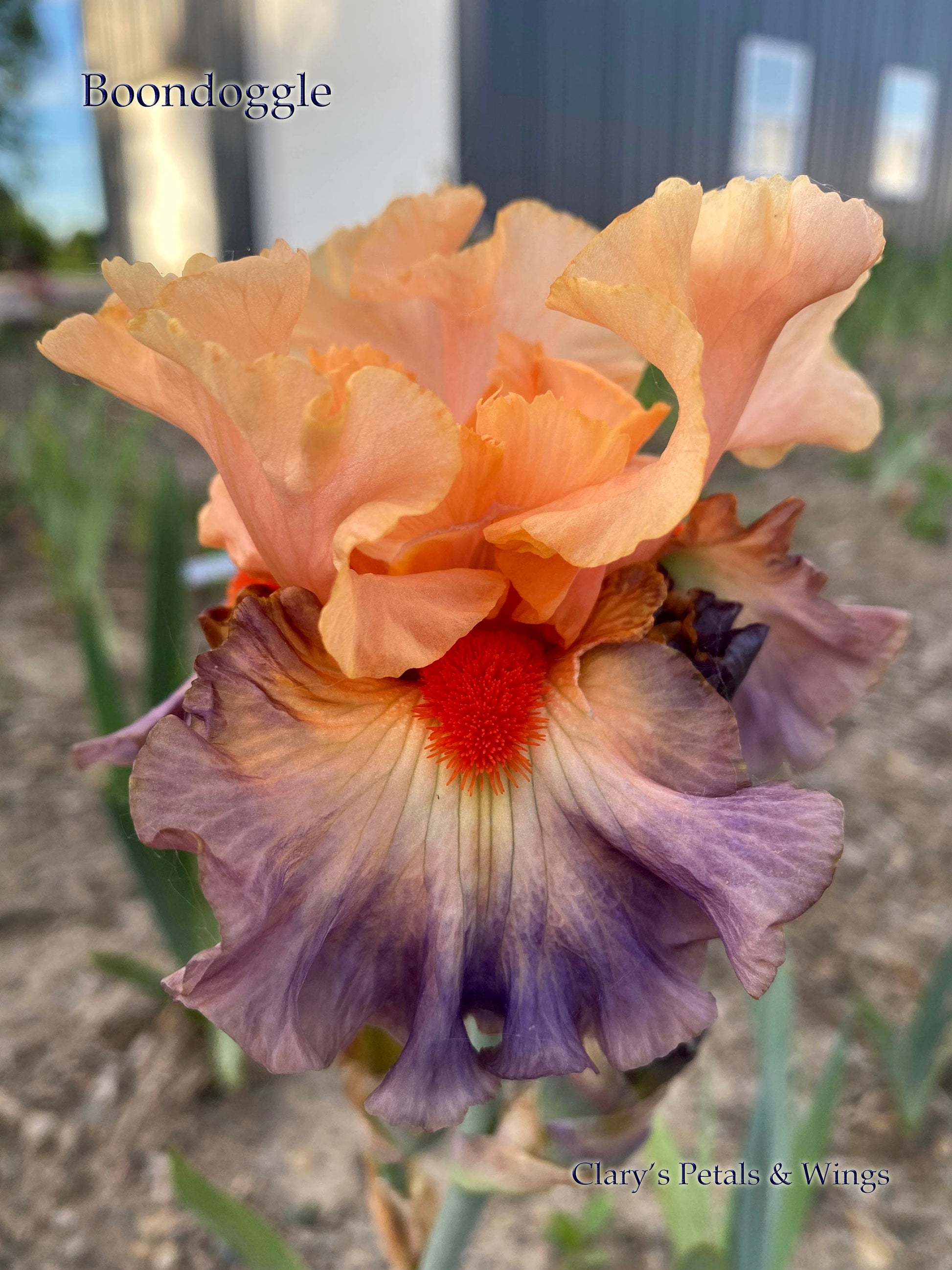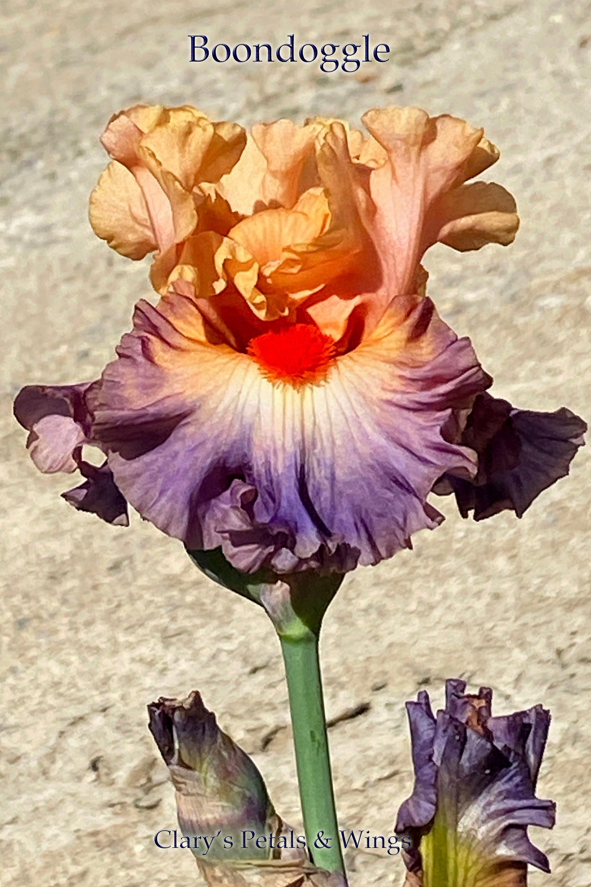 Beautiful and eye catching peach buff, falls with wide marginal band washed wistaria; prominent paprika red beards. Grows to 26 inches tall and blooms mid to late season.