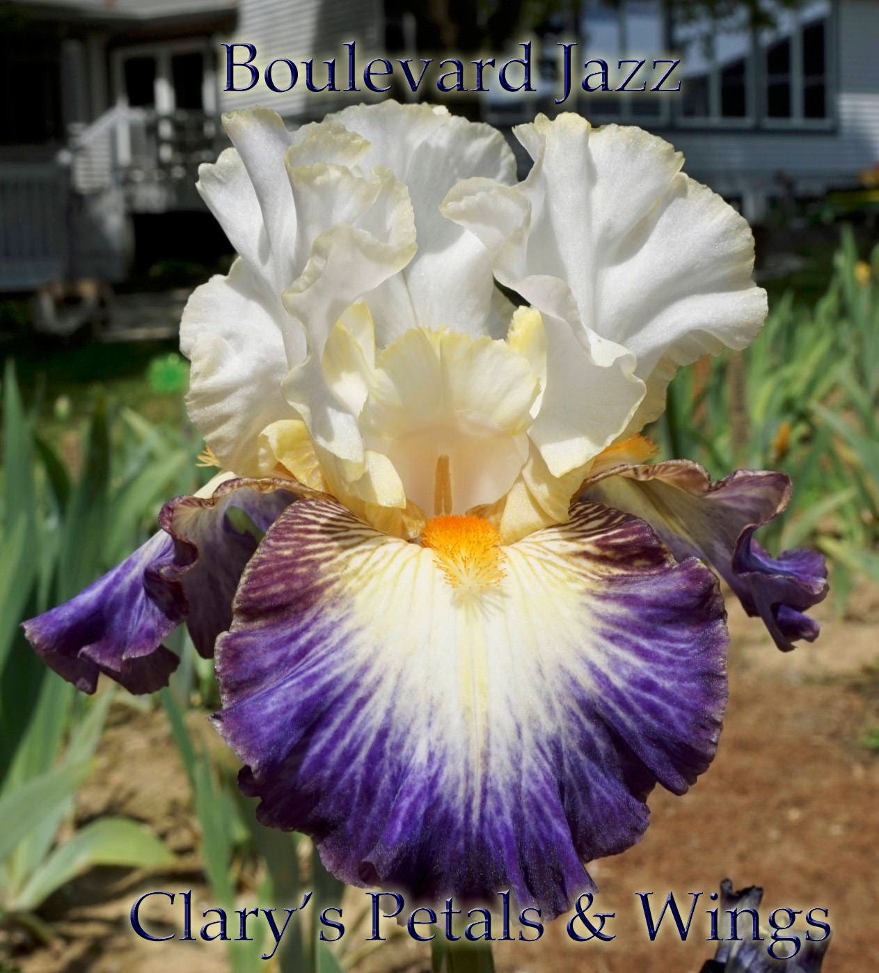 Standards are white with lemon wire edge, falls are white ground with thick flush of deep violet with buff to red-violet edging, beards are tangerine and lighter at ends. Ruffled and impressive. Grows to 35" and blooms midseasons