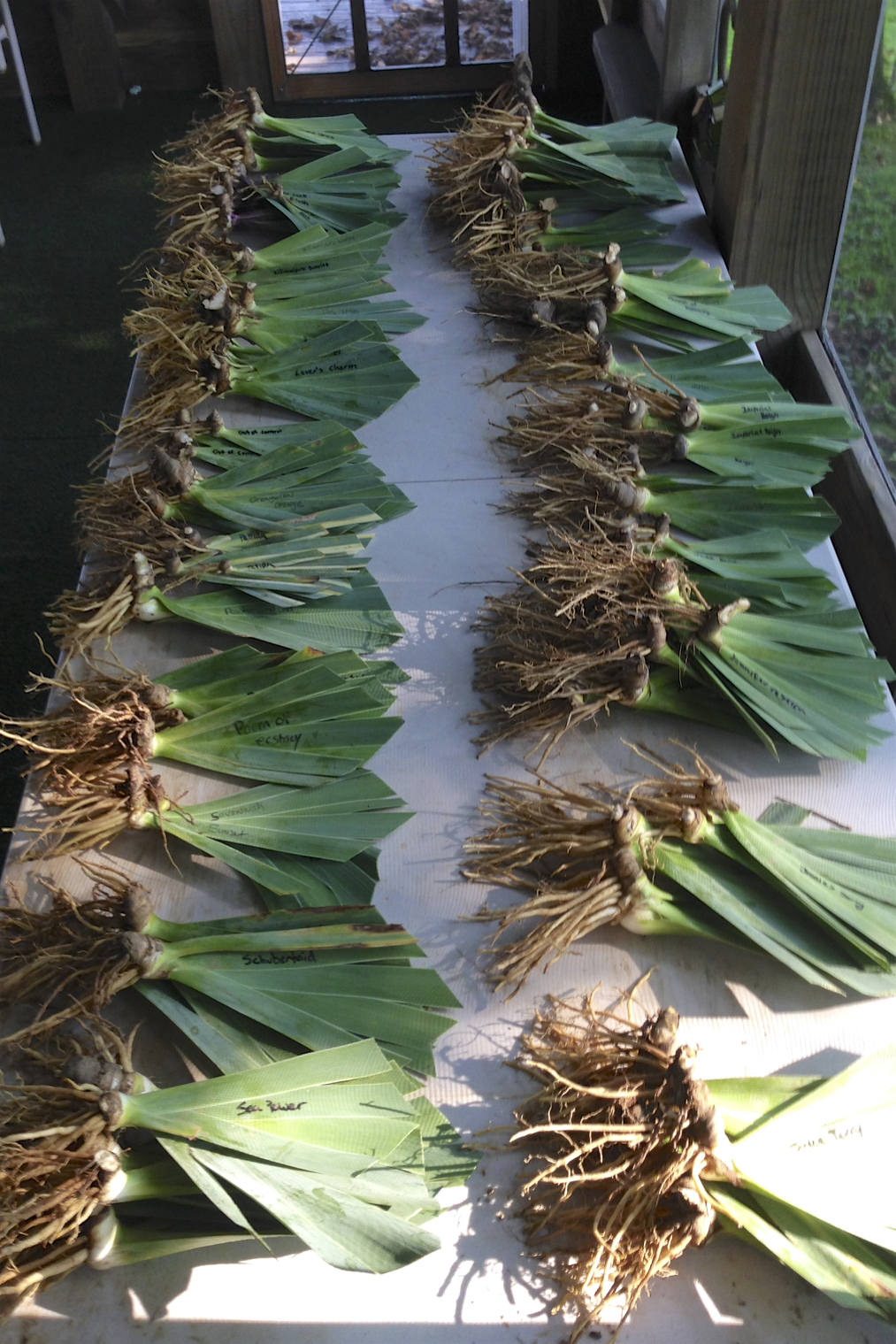 Iris rhizomes are best divided and transplanted after the plants finish blooming and have enough time to store nutrition in their roots. July through September is the best time to dig them up in Ohio. All Iris are grown on my farm and shipped from my home, bareroot with foliage and roots attached.