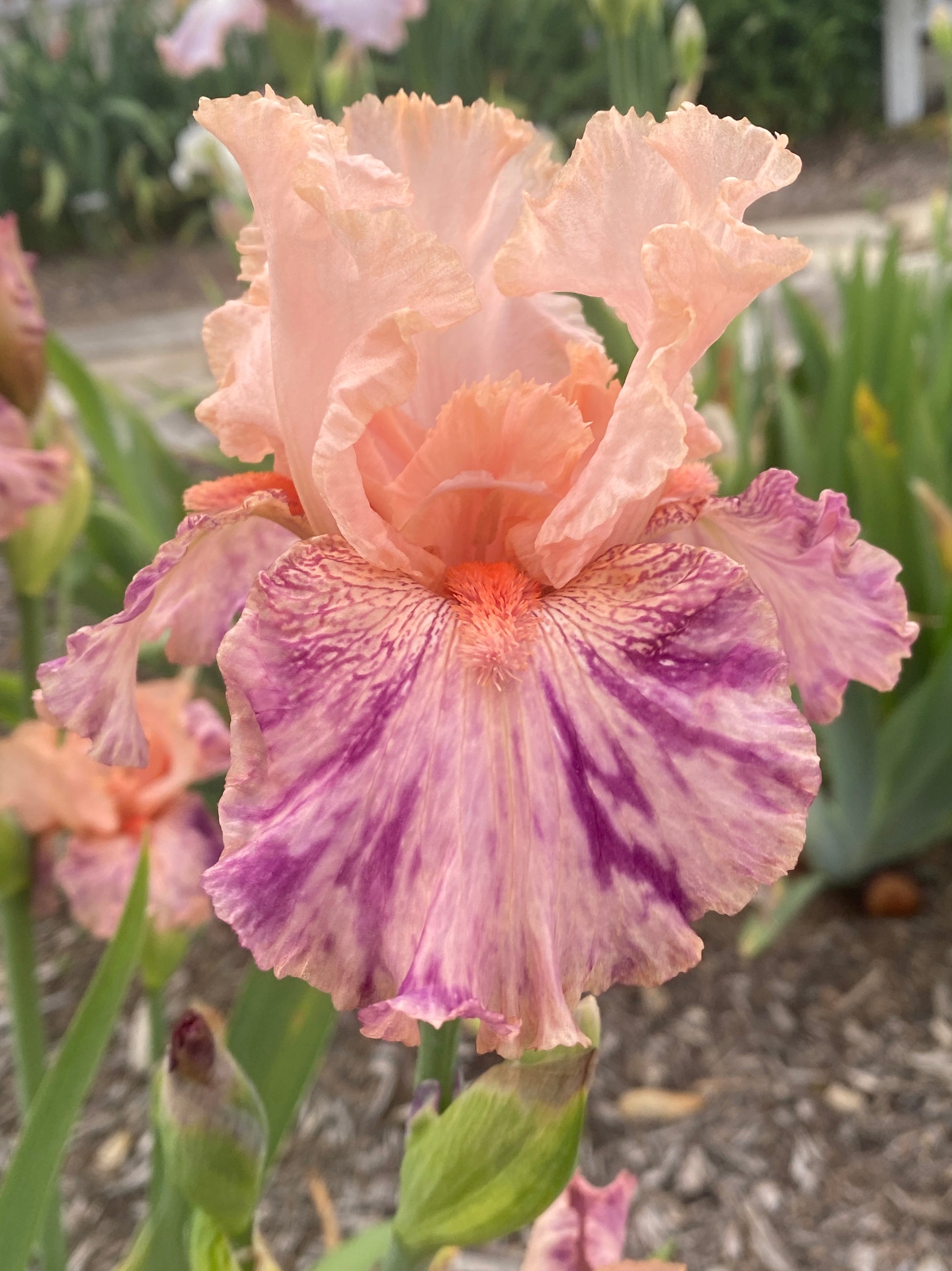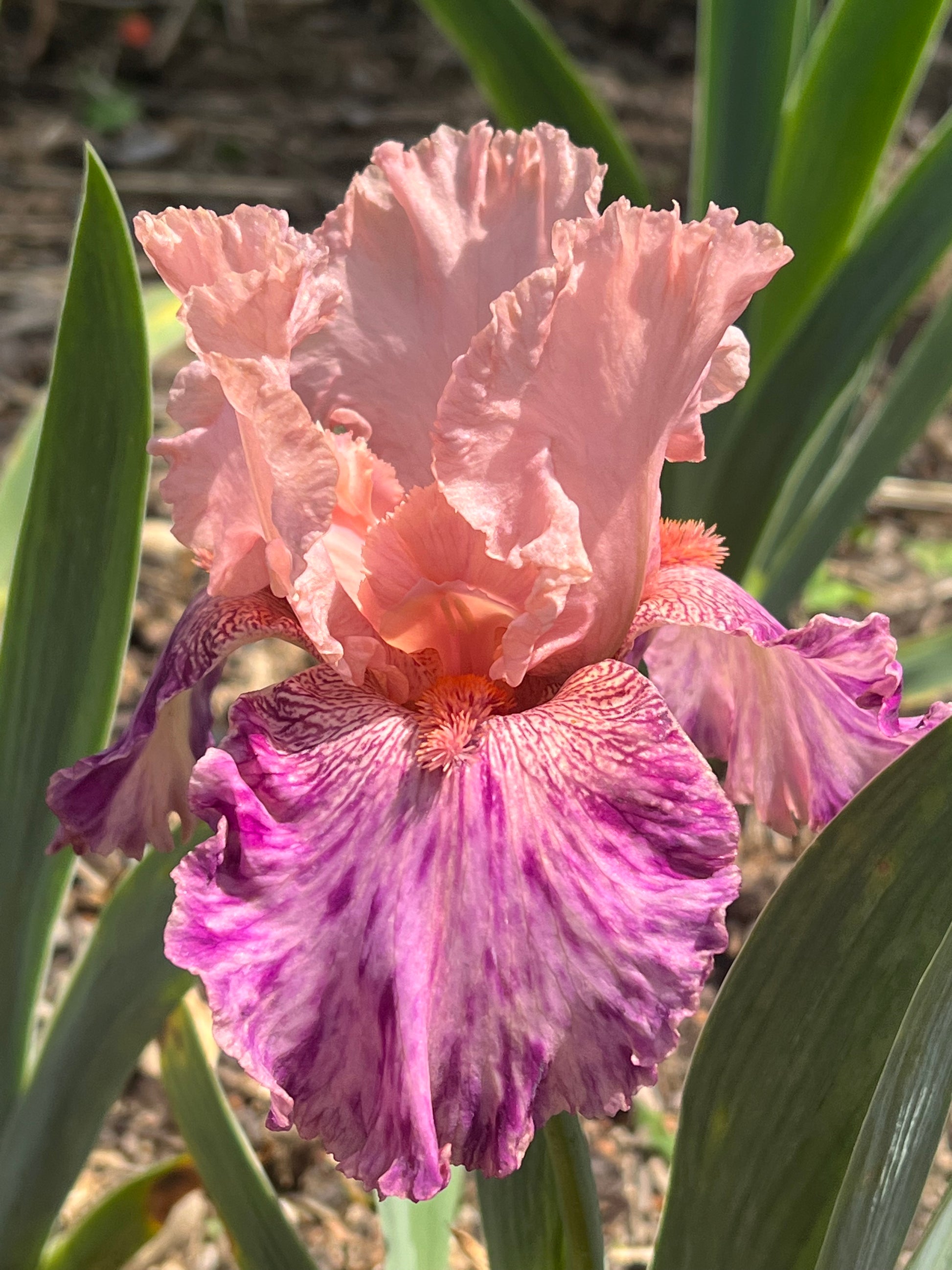 Standards peach pink, style arms peach; falls pink purple, purple violet splashes; beards tangerine-shrimp, occasional short, upturned fuzzy light pink horns; broken color pattern. Grows to 34 inches tall and blooms early to mid season and reblooms in zone 9.