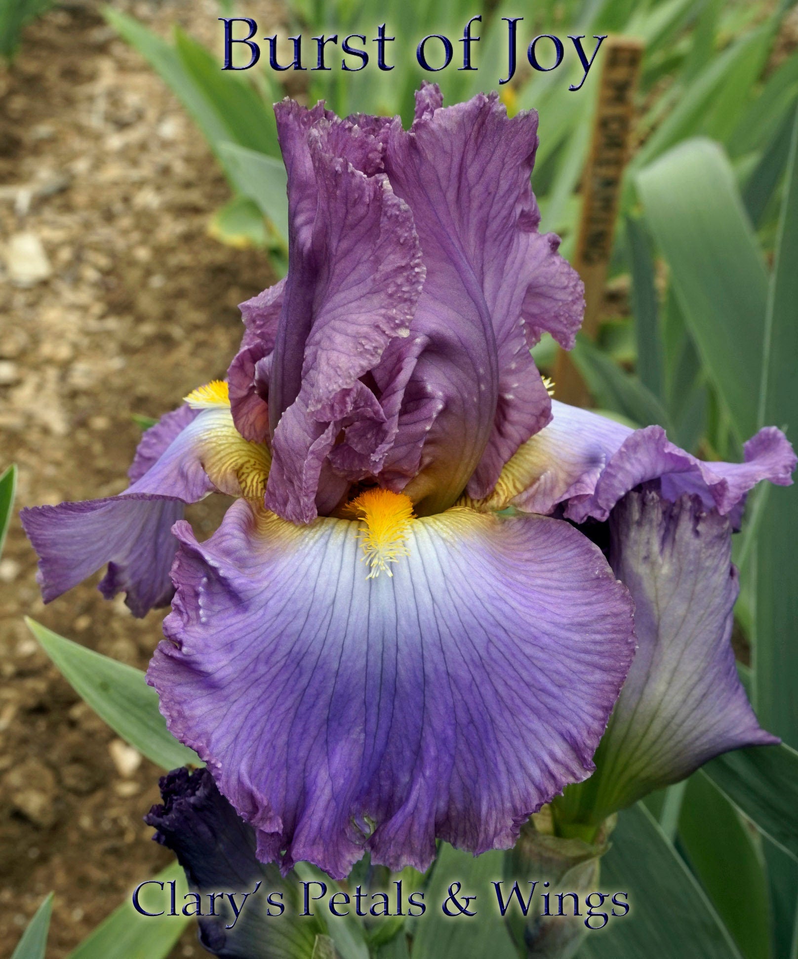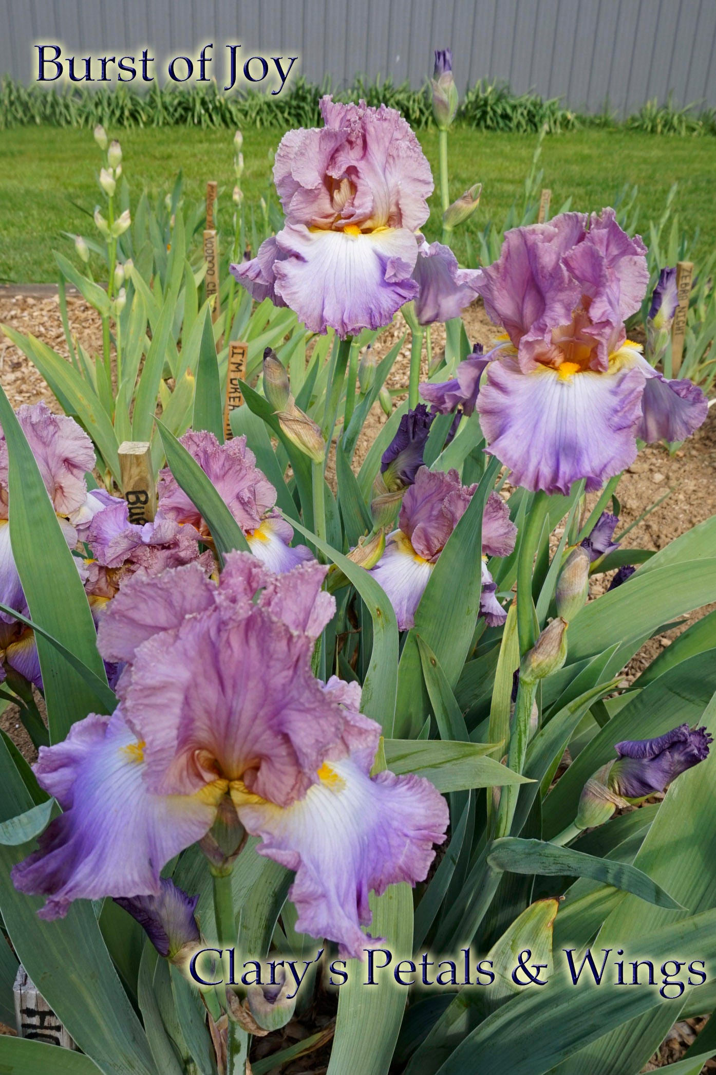 Rosy amethyst and overlain with a soft orchid sheen. Golden beards and shoulders washed in saffron yellow. Large and round 4" x 6" flowers
