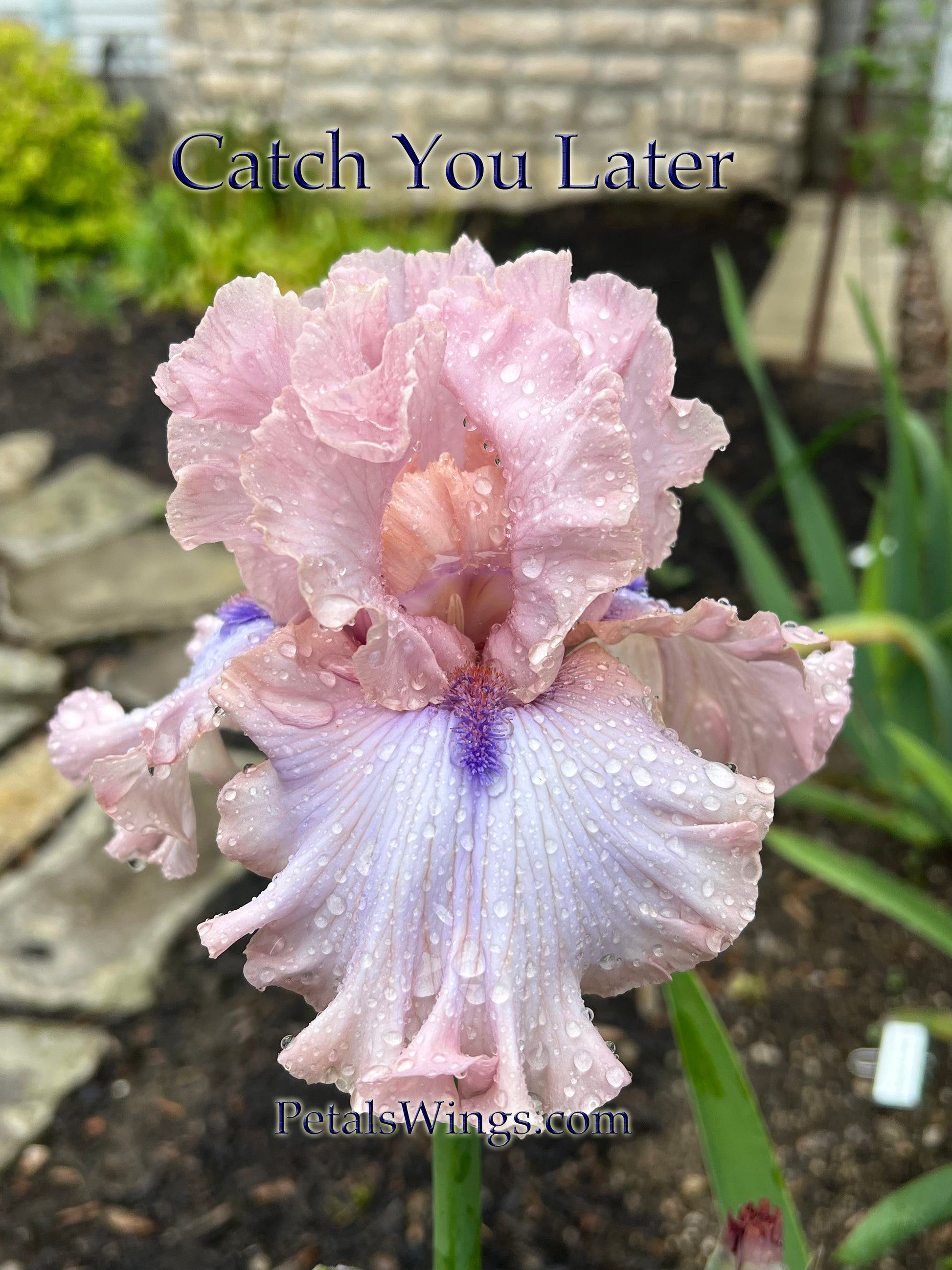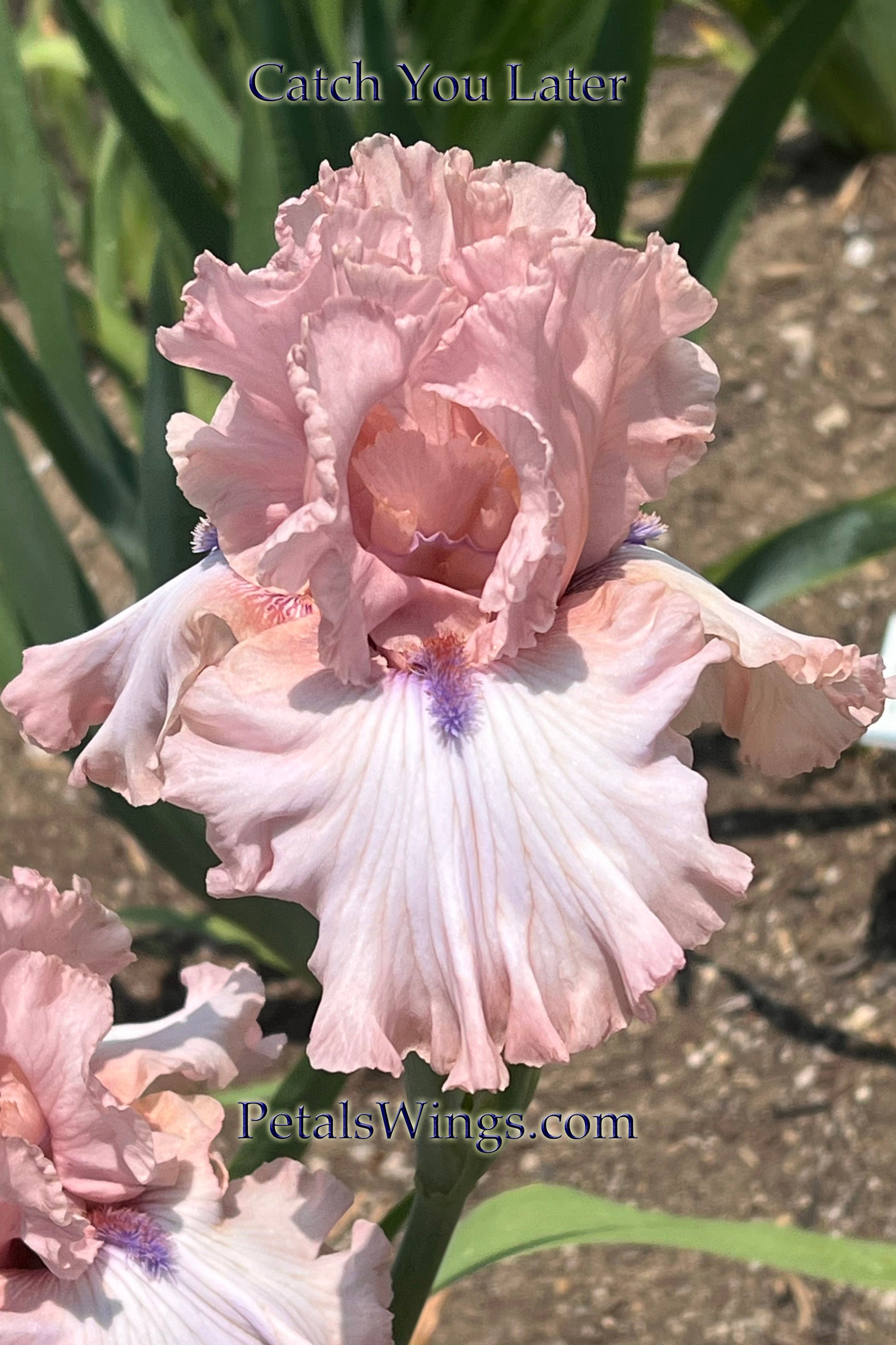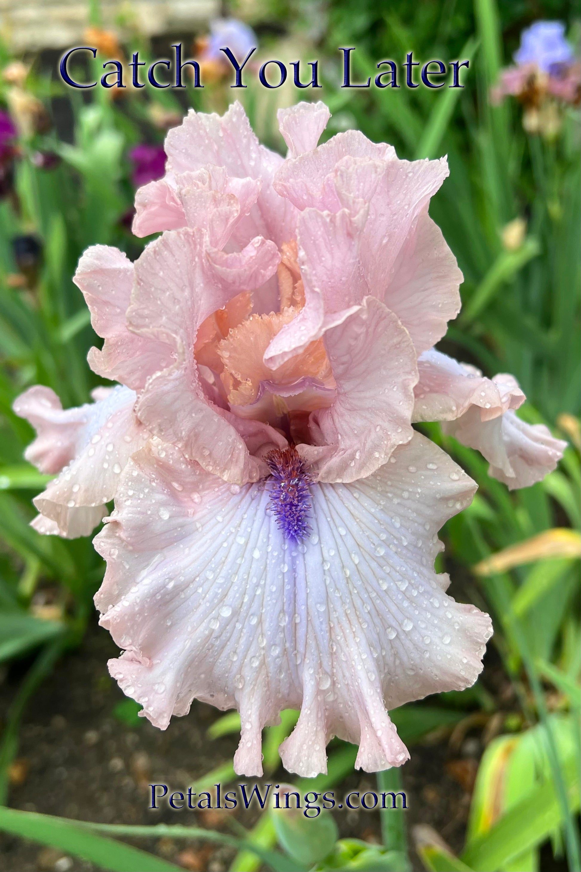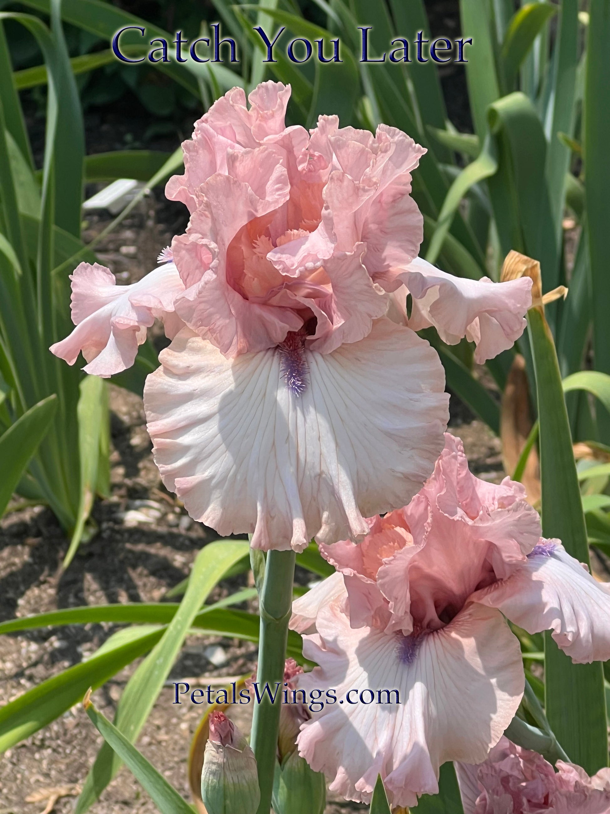 Medium pink standards. White falls are flushed pink, becoming deeper at the edges. Beards are a lovely violet blue with just a brushing of orange at the hair tips, giving a very pretty effect. Nicely branched and budded stems. Slight fragrance.