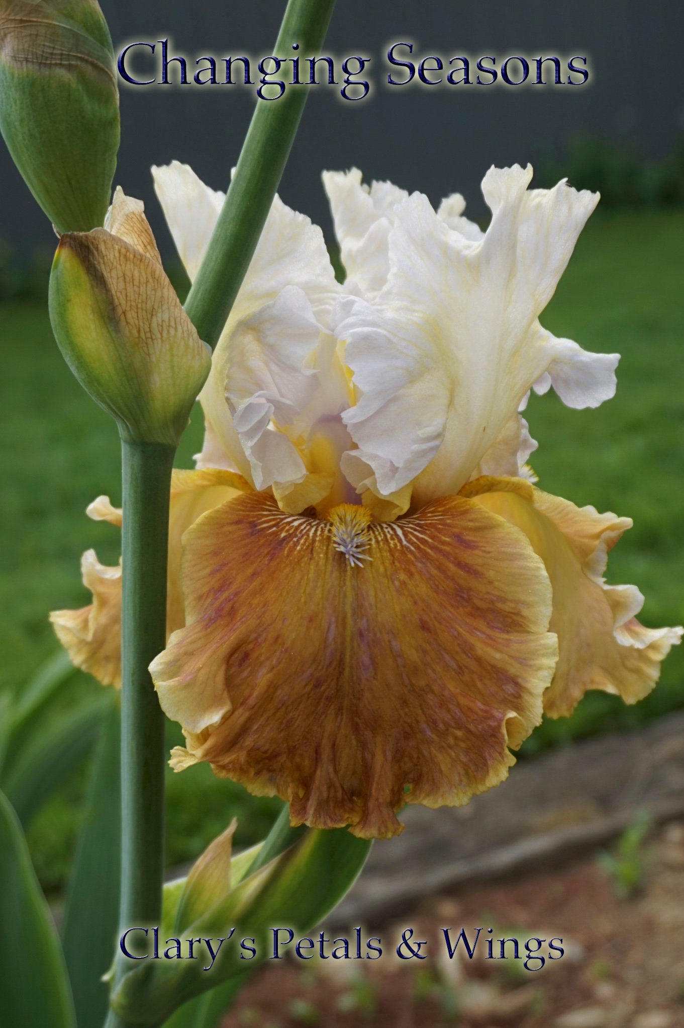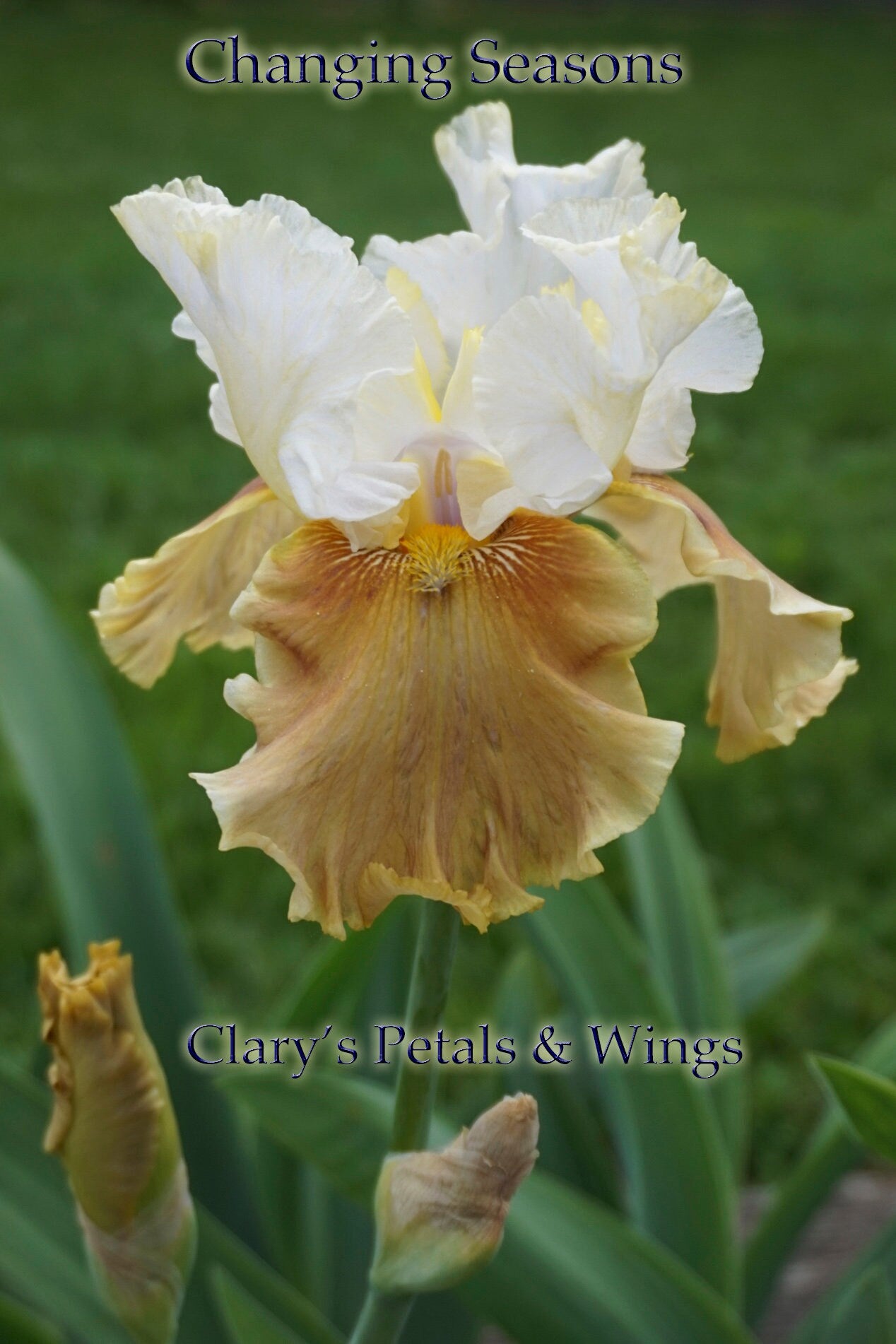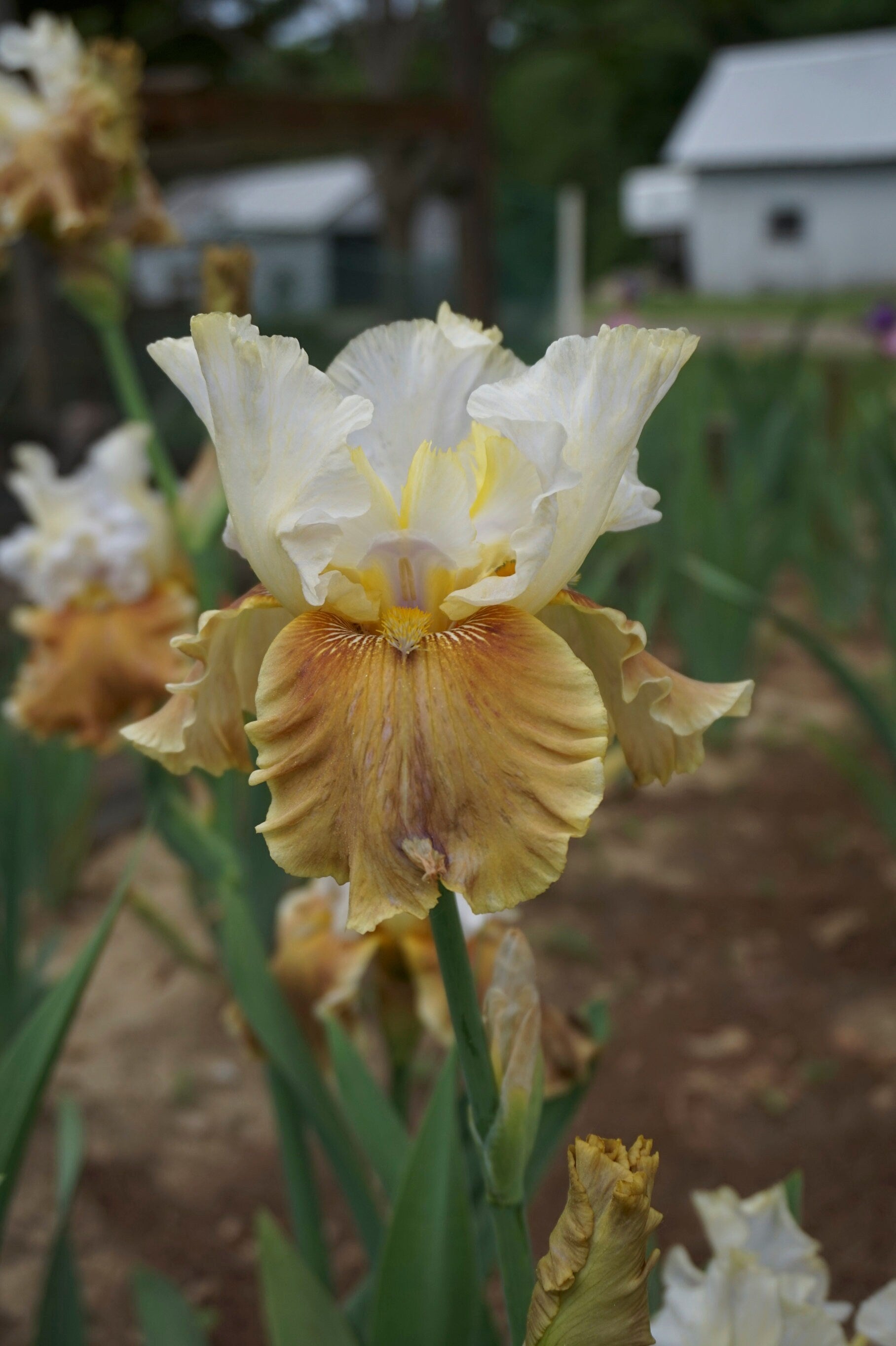 An absolute original. No other Iris has such a unique color combination of pristine white standards over a luminous blend of sunburst gold and tan-beige in the falls. This very late bloomer also produces gigantic 4 1/2" x 7" flowers with creamy yellow mid-ribs, style arms and beards. The stiff stem easily produces double-socketed buds, 8-9 flowers per stalk and will hold up in inclement weather. Grows to 37”, VERY LATE bloom season.