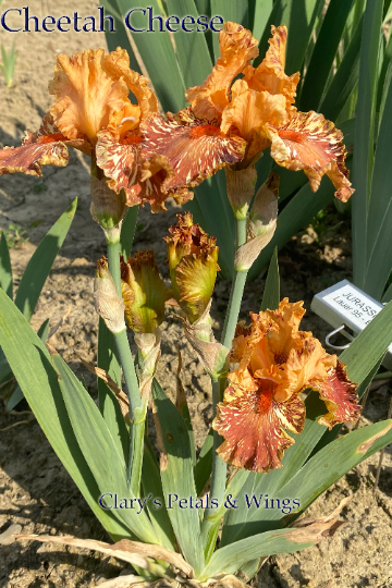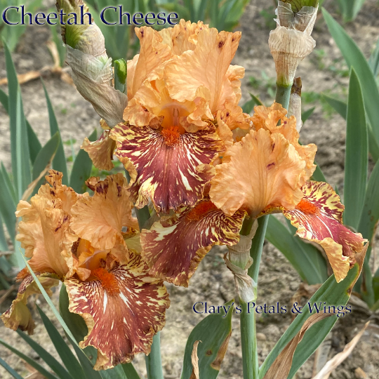 Burnt orange-apricot ruffled petals. Flaring falls overlaid with a deep garnet netting pattern and creamy streaks. Bright tangerine beards lend an exuberant spirit. Grows to 32 inches tall and blooms mid season.