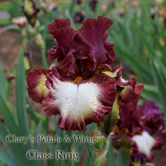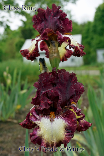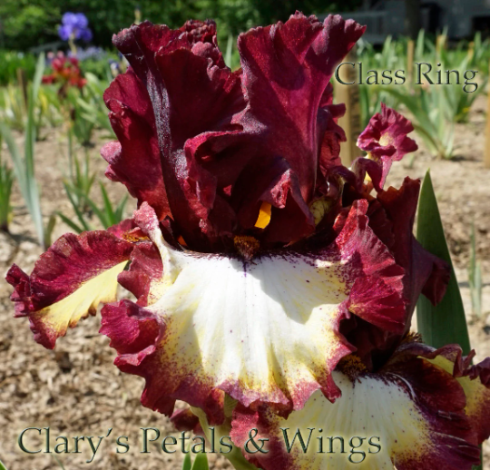 Hybridizer's Comment: "Solid dark russet wine standards, ruffled and closed, sit atop ruffled, semi-flaring ivory cream falis ringed by a classic half-inch band of color matching standards. Solid slightly browner hafts cover the upper fall as far as the tip of the golden orange and violet beards. Broad, rather blocky form overall, good stalks with three (or four) branches carrying up to eleven buds.