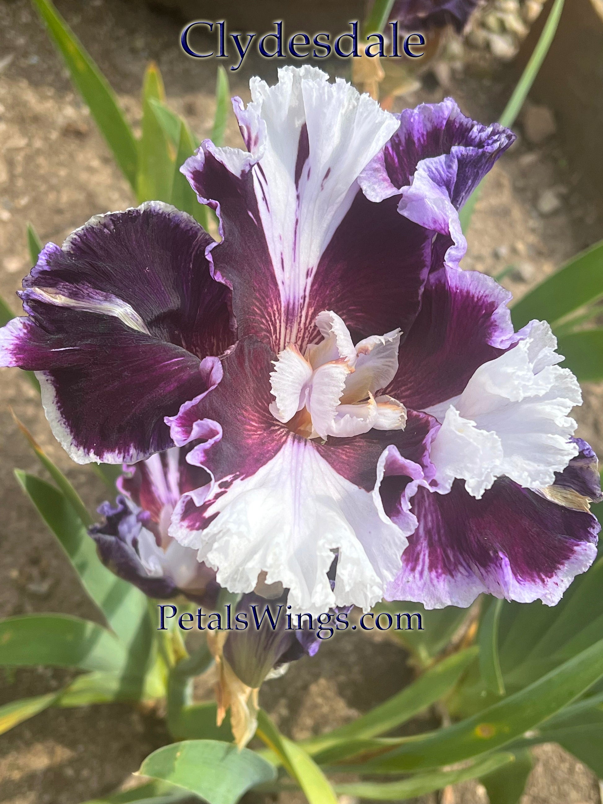 Purple/white broken color; opens flat in warm weather. Beards absent! Very unusual and popular!. Grows to 31 inches tall and blooms late to very late season.