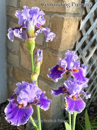 Emphasis here is on clump effect as well as classic flower form. Light lavender blue standard’s color is repeated in a band around mid-dark lavender blue blended falls. Pleasing mid orange beards add a bright touch to ‘Commanding Presence’. Its shorter stature is excellent for areas plagued by strong winds. Show stalks have 3 branches and 9-11 buds. Grows to 31" inches tall and blooms early to mid season.