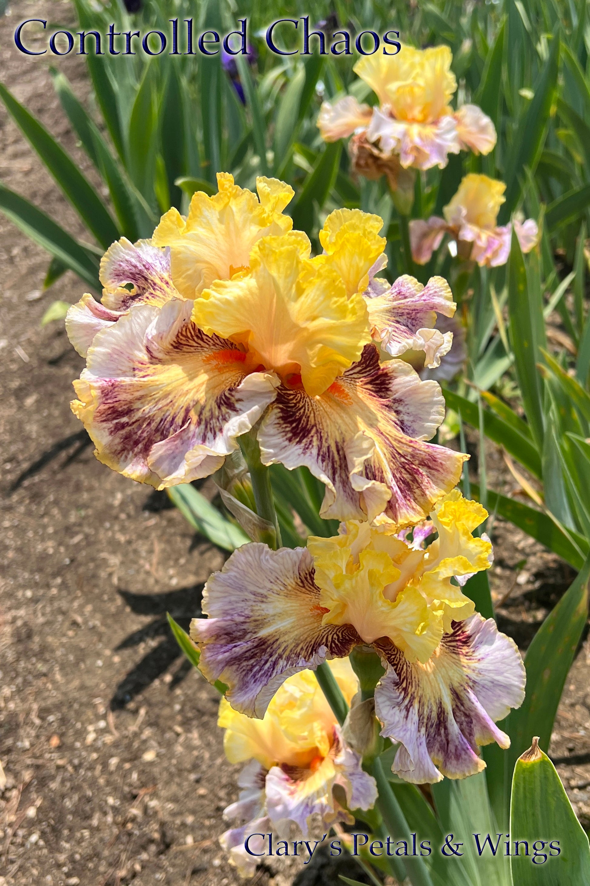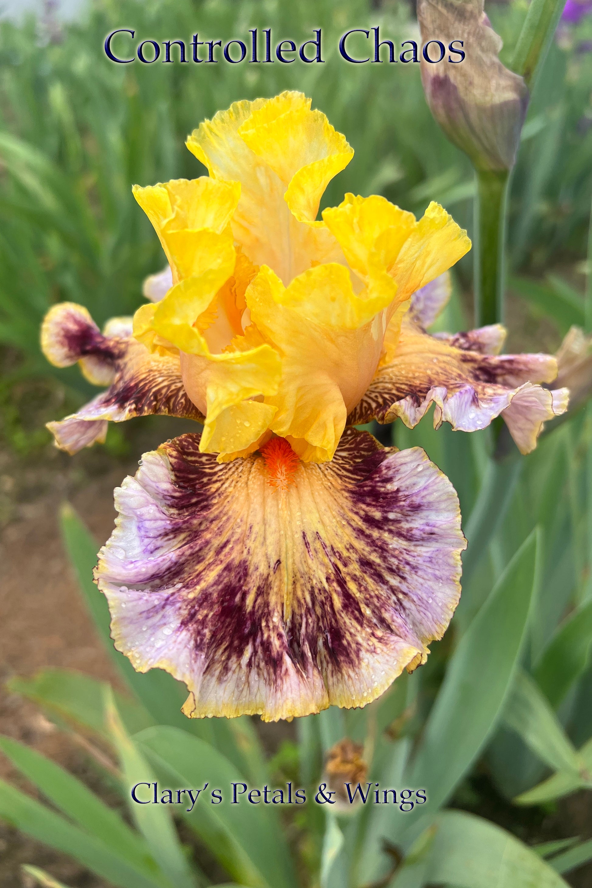 Crazy colors and pattern! Pale cream standards are heavily veined and edged yellow, faint pink flush up midribs. Amethyst violet falls are marbled violet-purple, thin yellow rim at the edge is bordered by a purple wire rim. Yellow orange zonal area radiates out from the orange beards. Slight sweet fragrance. Grows to 34 inches tall and blooms mid to late season.