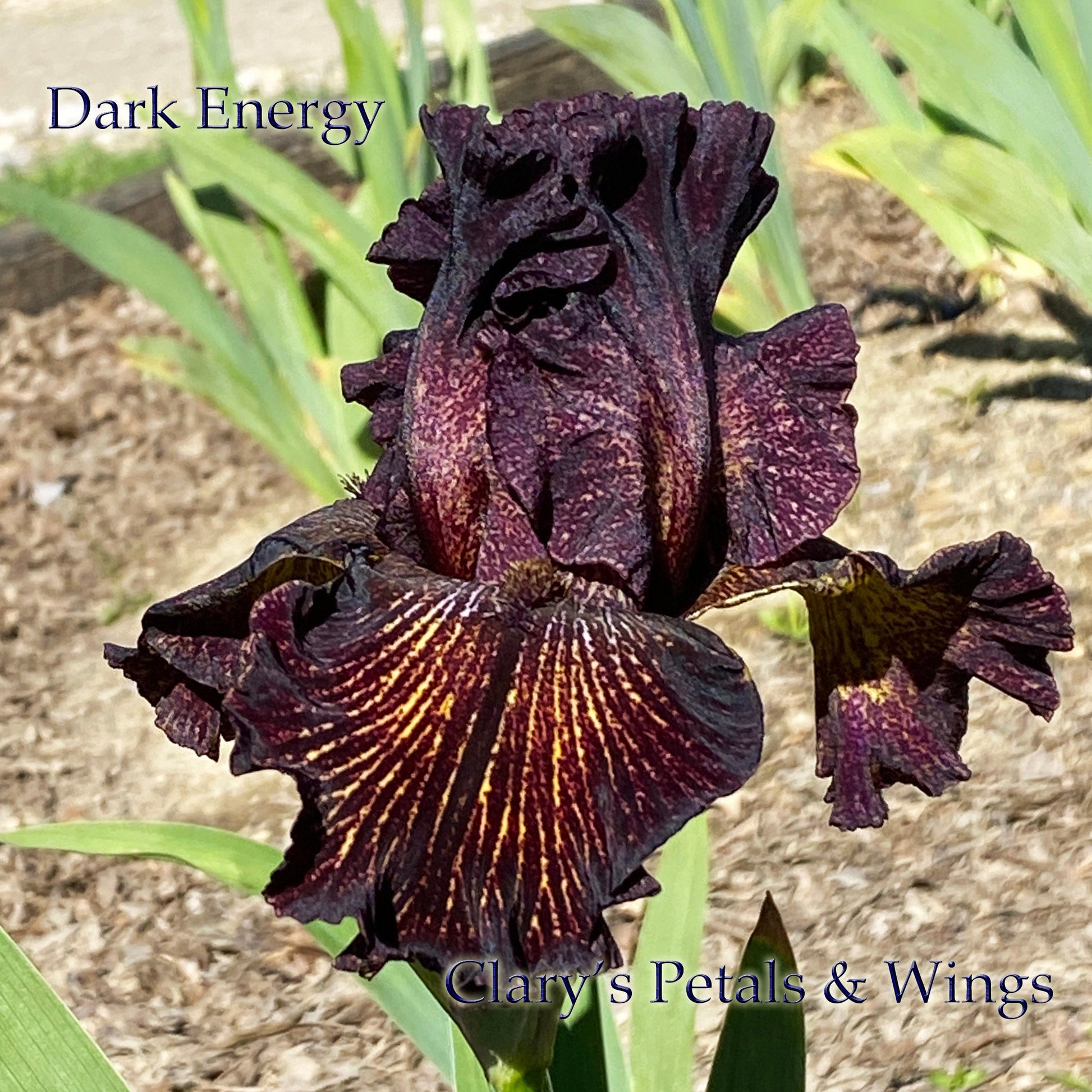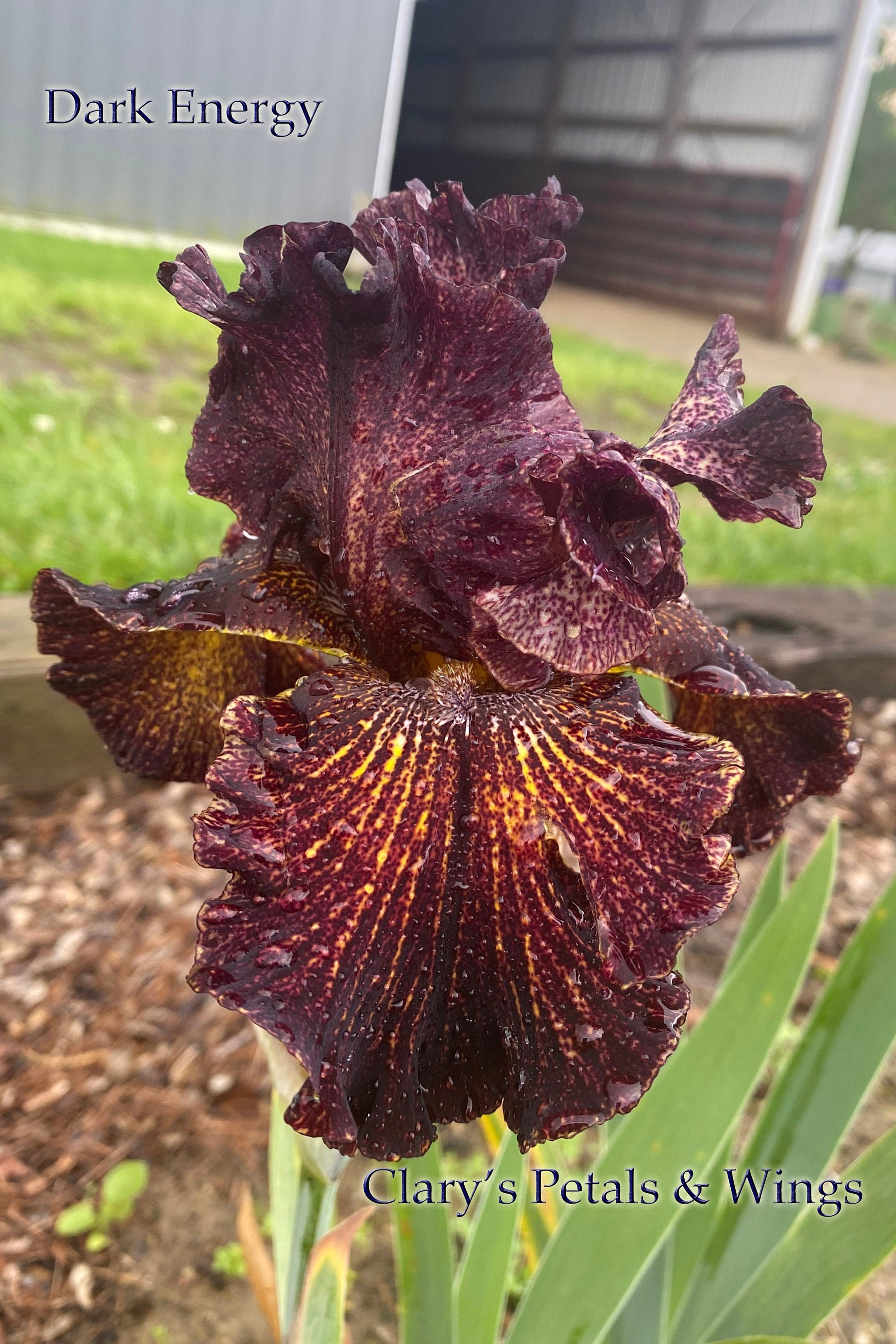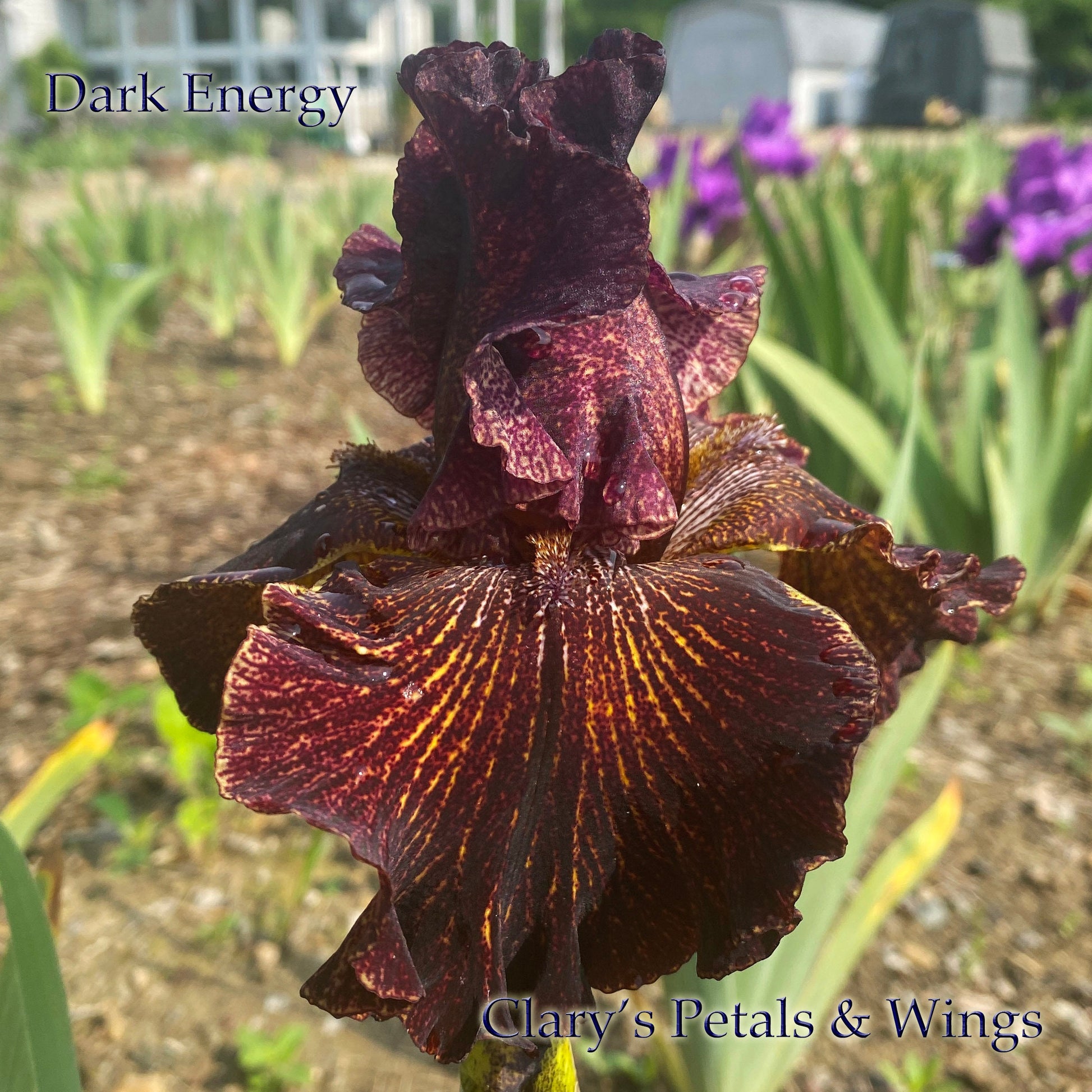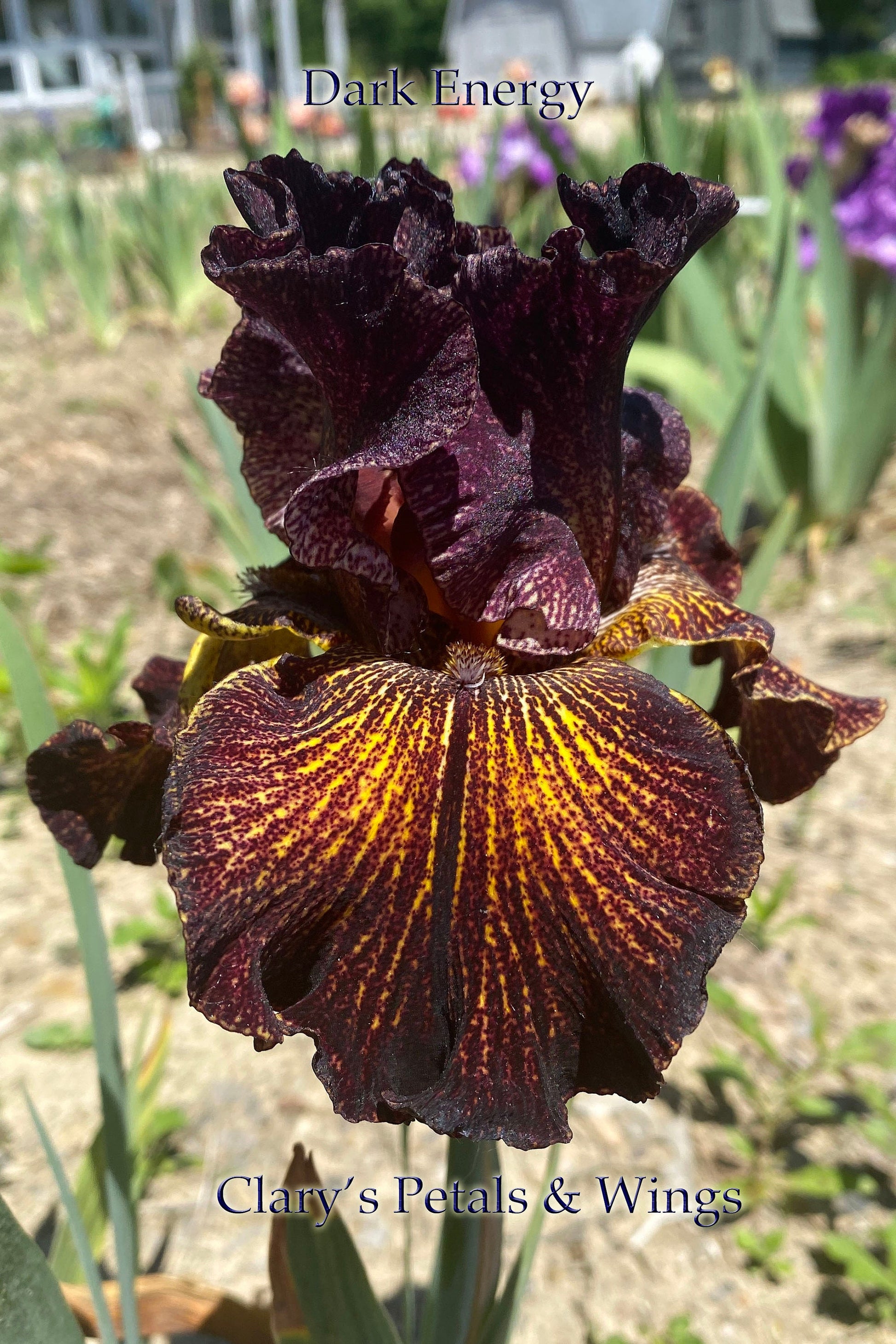 Dark purplish black to reddish brown plicata with high-energy golden yellow rays shining through the darkness of the falls. Inconspicuous violet to mustard beards, light ruffling. Grows to 35 inches tall and blooms mid season.