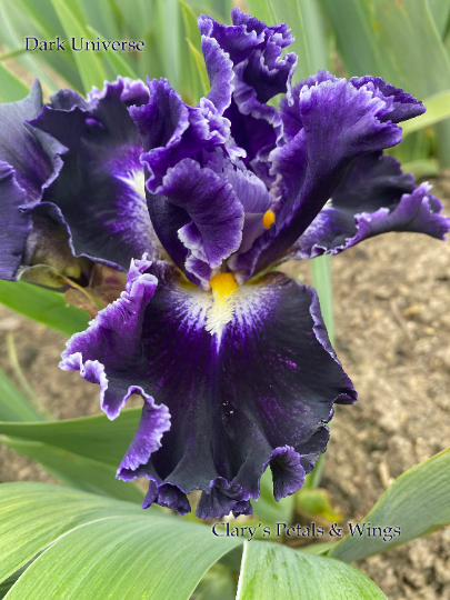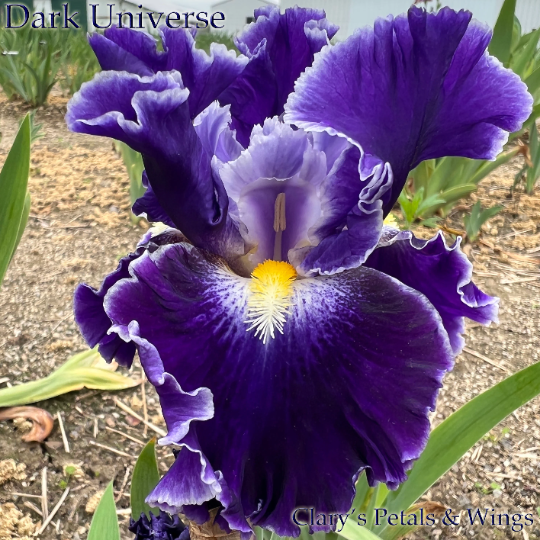 Near-solid variation on the luminata theme. Velvety dark grape purple falls, with slightly paler veining beginning to show as the flower ages, but never becoming obvious. Petals, including slightly lighter standards, have a narrow greyed blue-white rim. Pure white heart showcases the yellow beards for a bright flash in the darkness. Ruffled, of course, with about seven buds per stalk. Grows to 35 inches tall and blooms early season.