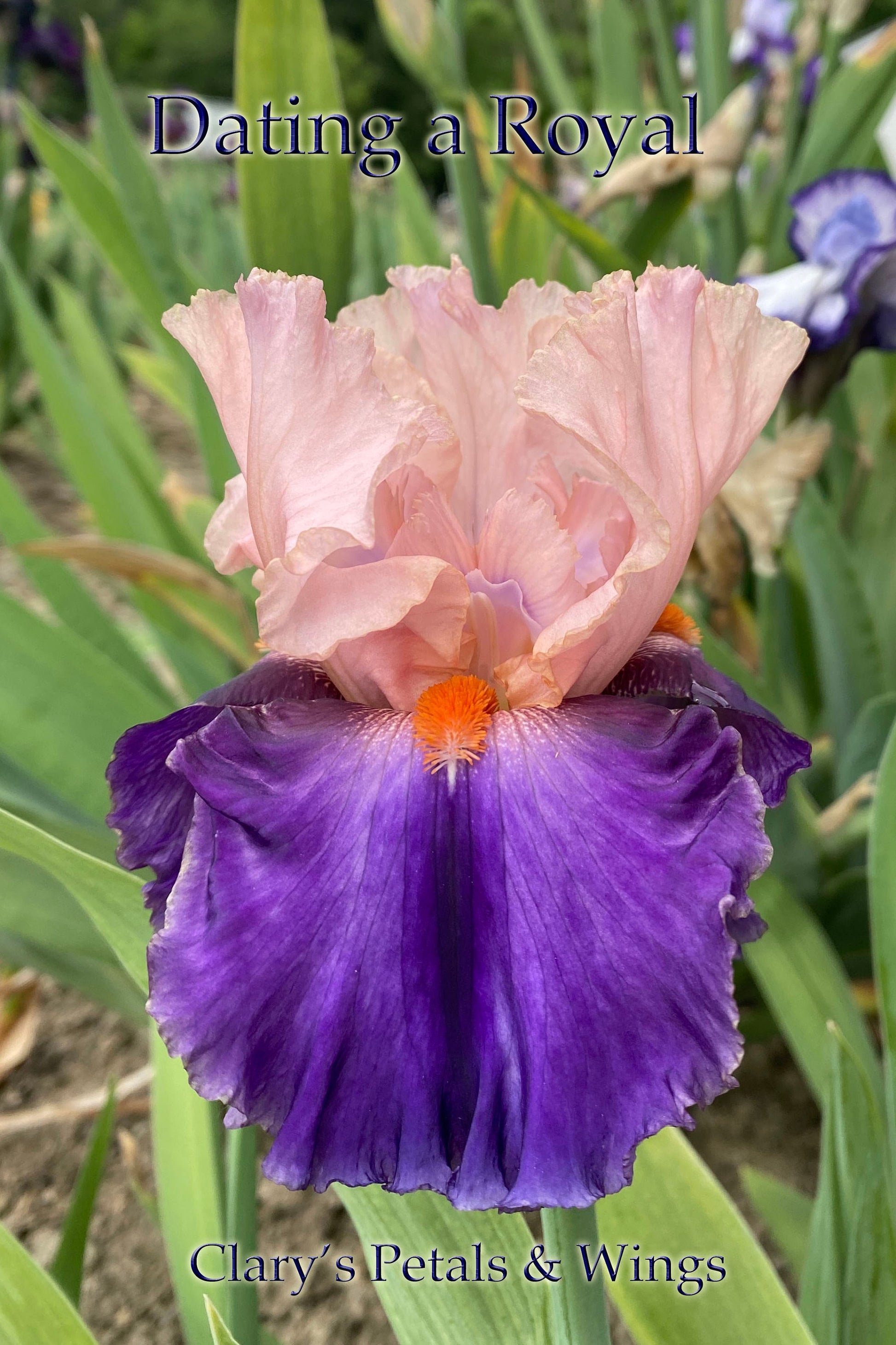 Your gaze zooms in on the bright orange beard, and doesn’t want to move. Pink-toned lavender standards help ease Dating A Royal into its own amoena category. The three colors combine intoxicatingly. Large, rounded falls have a light wire on the periphery. It’s a stunning package -- white eyelashes setting off the orange beard, nesting in a rich field of royal blue violet. Grows to 36" and blooms mid to late season.