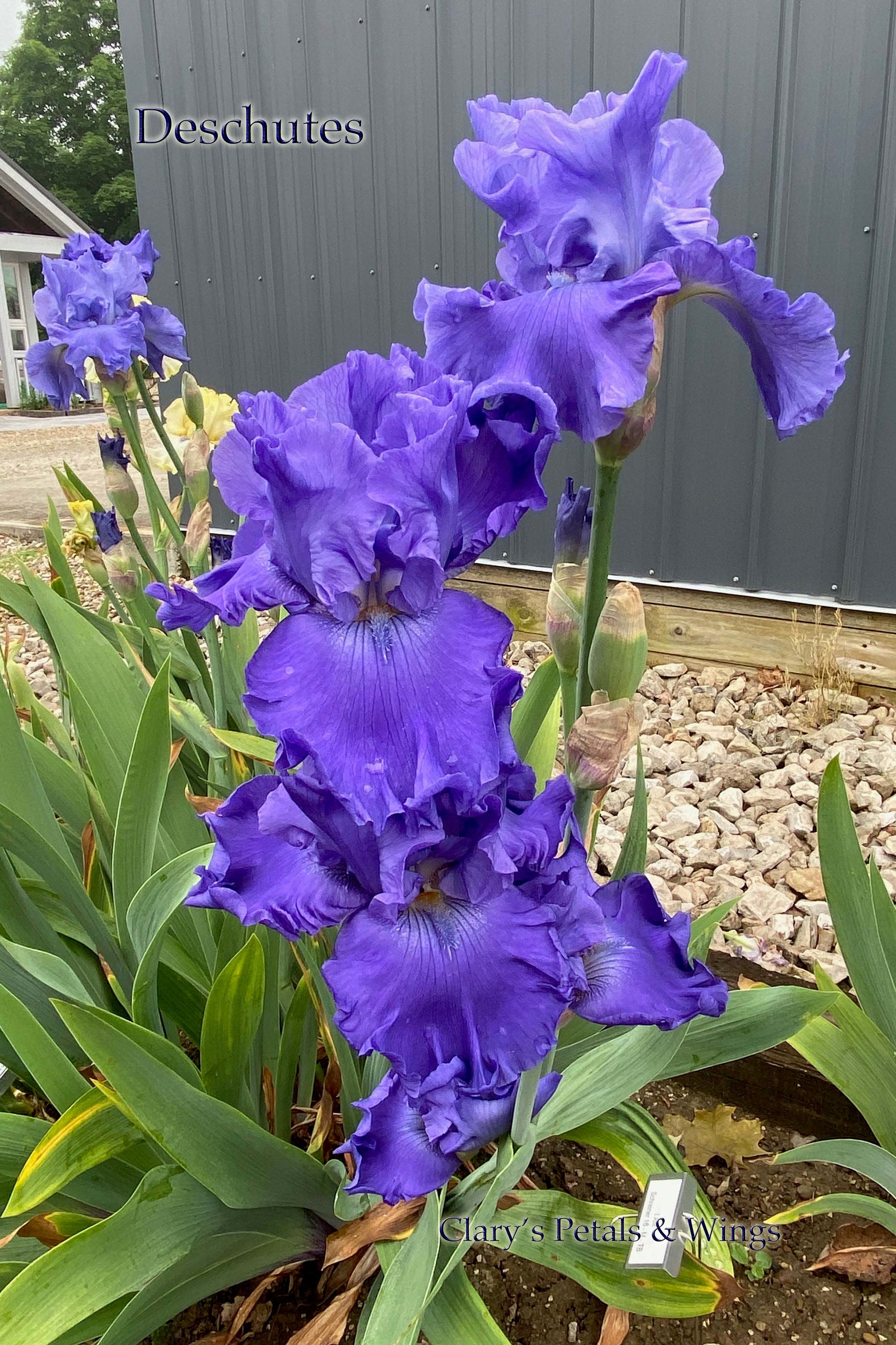 Superb form and ruffling with royal blue-purple in coloration, the broad falls are darker toned than the statuesque standards. The lighter perimeter of the falls matches the standards, and surrounding everything are delightfully bouncy ripples. Deschutes sports 2 double-socketed branches with 7 buds per sturdy stem. A faint saffron tips the blue beards. Grows to 38" inches tall and blooms late season.