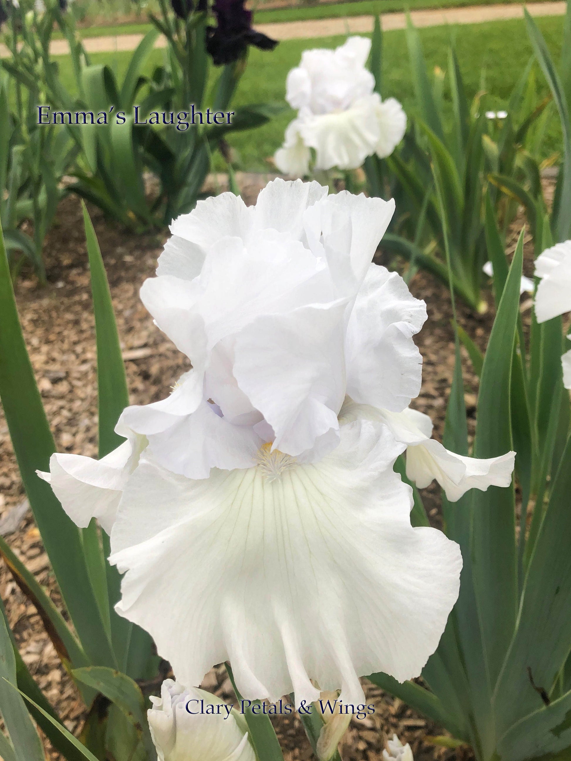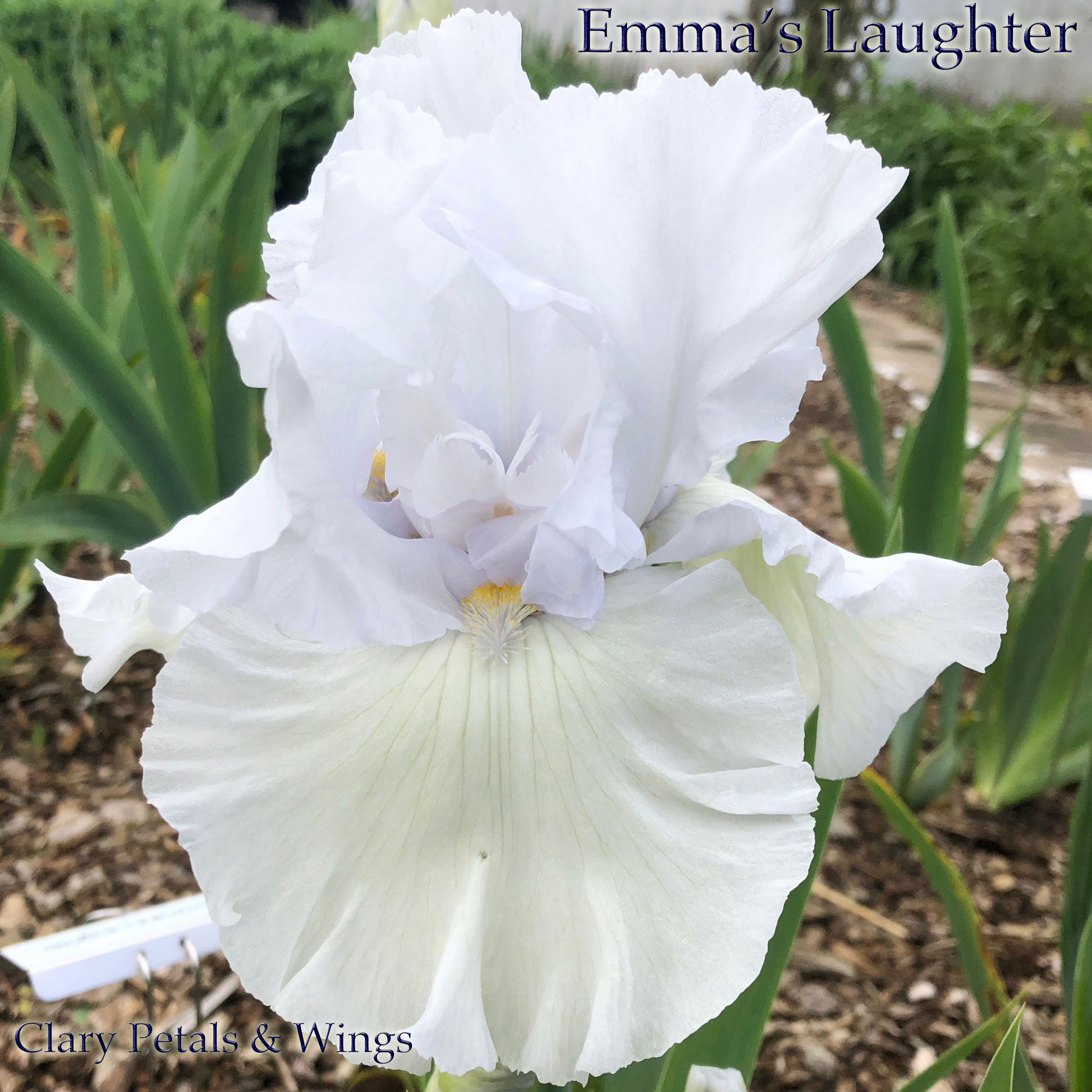 Pleated ruffled standards cool white with cool blue hints at midrib bases. Pleated falls same with very faint haft marks. Beards blue white tipped yellow in throat. Grows to 33" and blooms very early season.