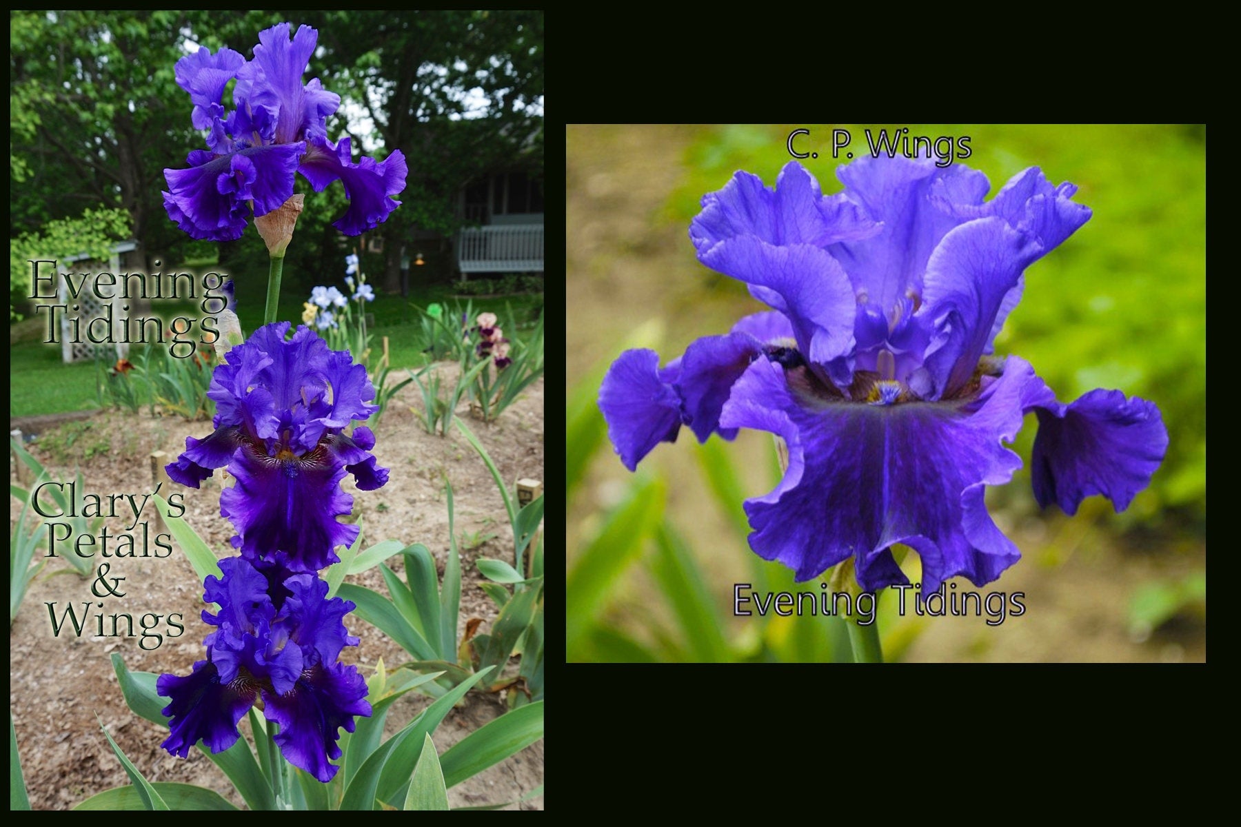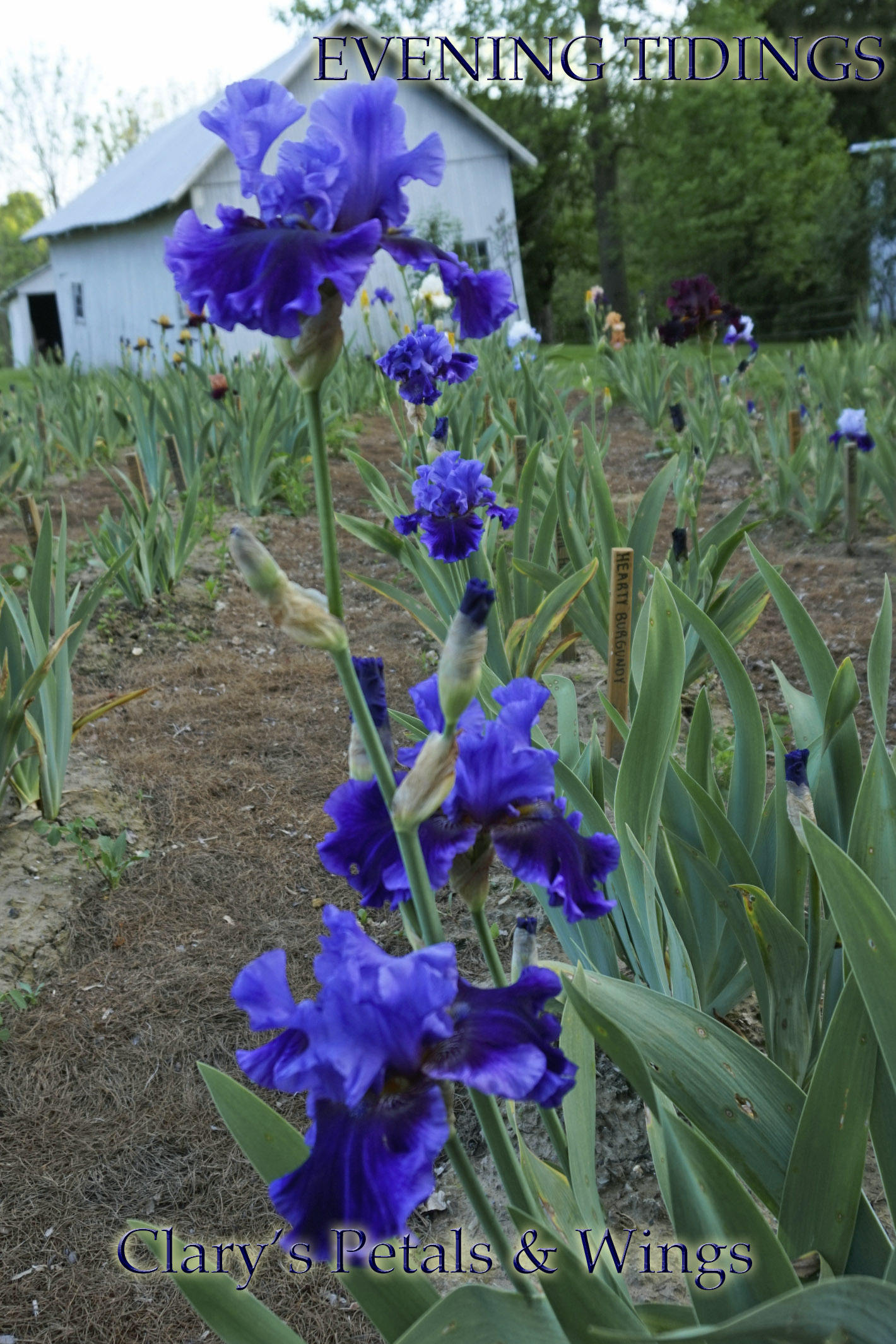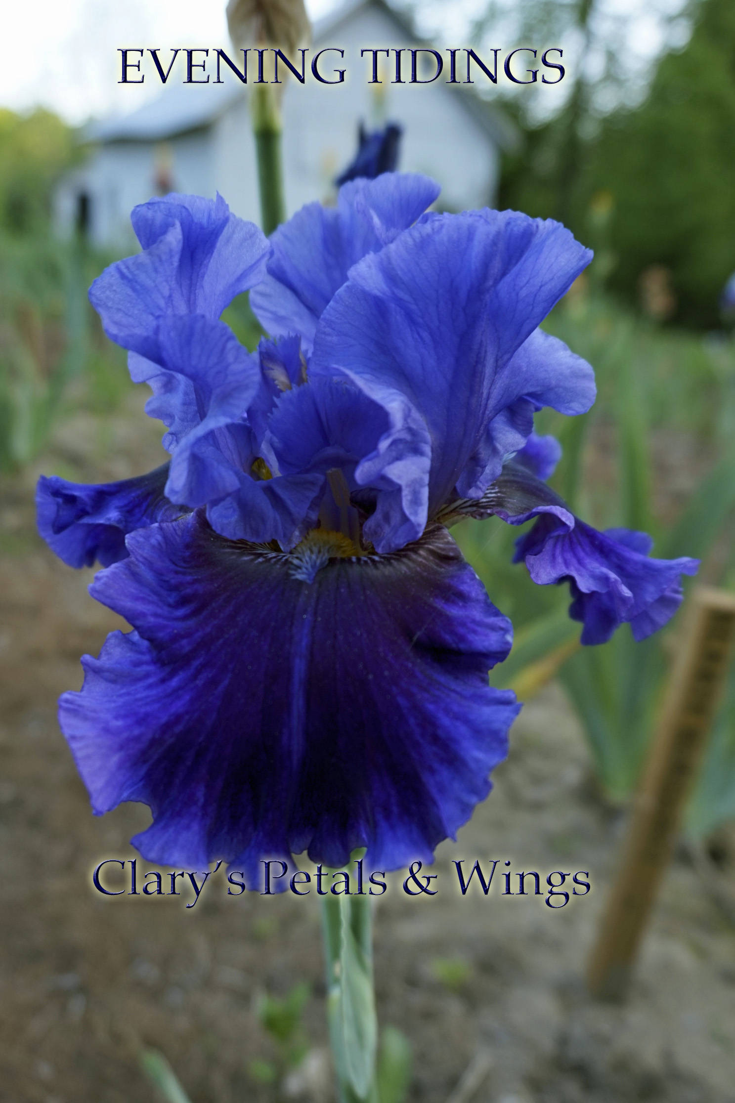 Evening Tidings features a blue-violet bi tone that is highlighted by a tawny blending of brown in its shoulders. This iris is a strong grower and very ruffled. In addition this stunning iris consistently offers three branches with 8-9 blossoms on each of its sturdy stiff stems and holds up to the inclement weather. Day time it looks more purple and evenings it looks more blue. Pictures are of same plant at different times. STUNNING!