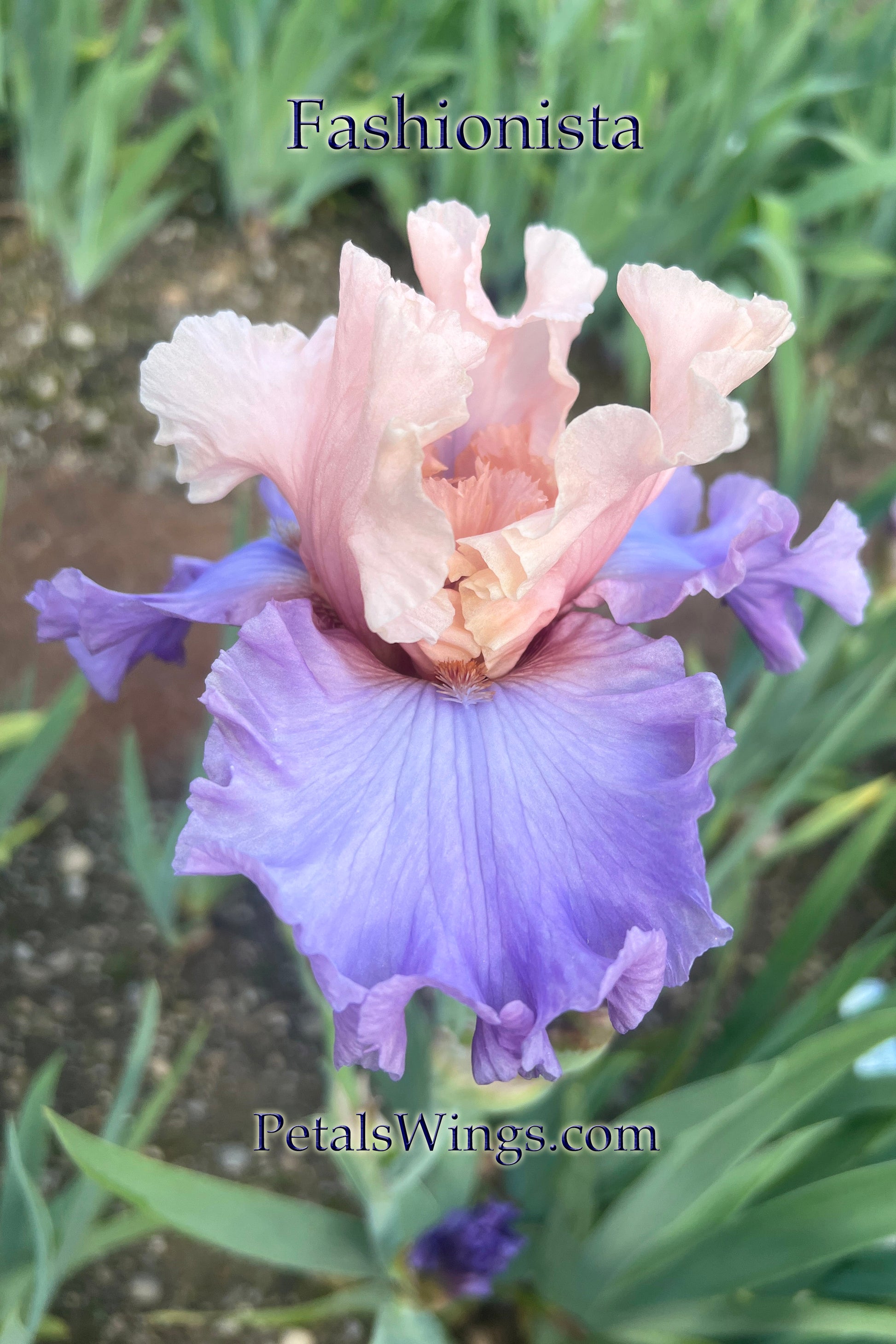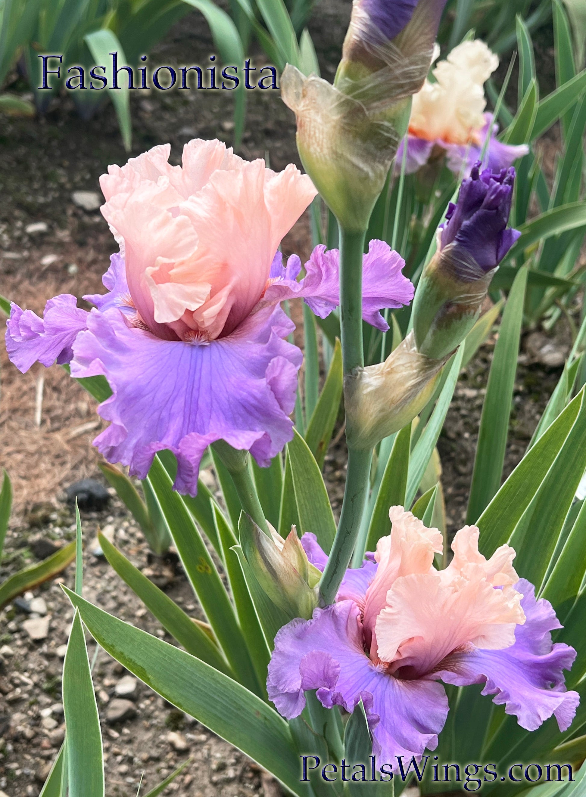 Gorgeous coral pink standards, full and ruffled. Falls are soft pastel blended lavender with apricot hafts. Beards are muted orange. Pronounced sweet fragrance. Wide and ruffled with good branching. It reblooms sporadically in autumn.