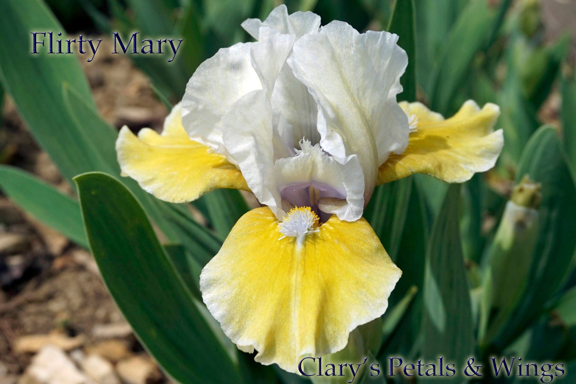 Flirty Mary Iris has masses of beautiful greyed white standards, yellow falls with greyed white edges. The beards are yellow orange, tipped in pale violet. Masses of blooms very early in the season. Grows to just 12 inches and makes a nice clump in no time at all.