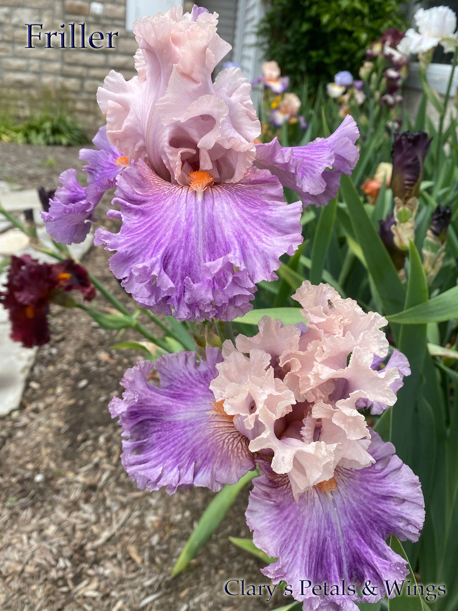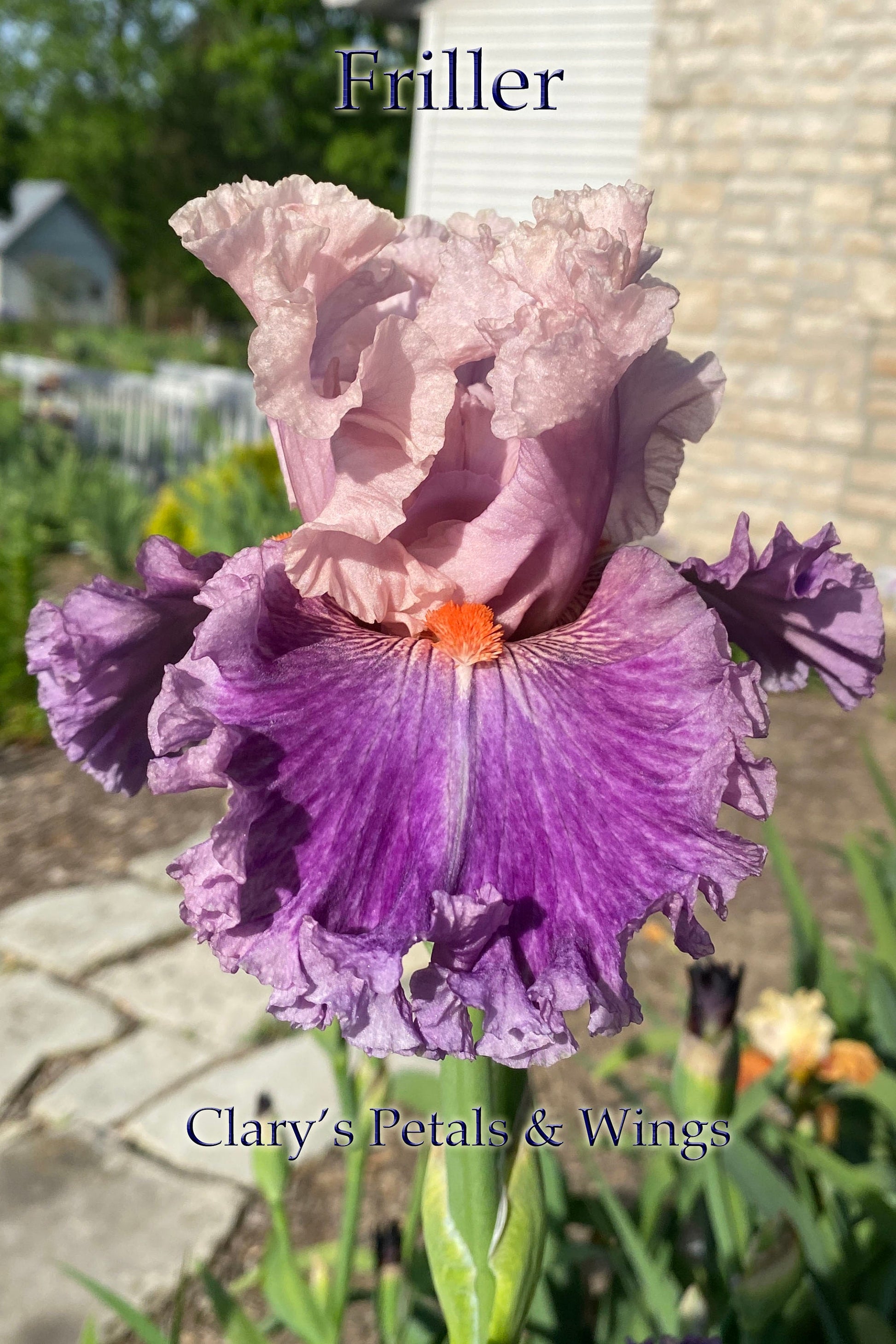 Amazing ruffles! Soft rose purple standards are veined slightly darker and carry heavy ruffling. Violet falls are lighter at edges, sometimes appearing as a rim. Tall and sturdy stalks carry 7 to 9 buds, slight spicy scent. Orange beards provide a pop of color and contrast in the middle of the flower. Very ruffled all over with a touch of lacing to boot. Great flower! Slight spicy fragrance. Grows to 40 inches tall and blooms mid to late season.