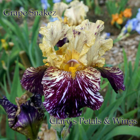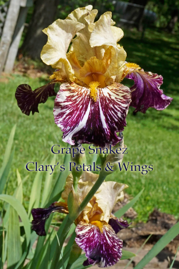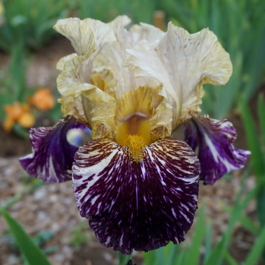 This iris is a riot of broken color. The tannish standards are streaked in silvery white and are flecked with purple. The rich purple falls are streaked with creamy white. Subtle tempting fragrance. Mid season bloom 37"