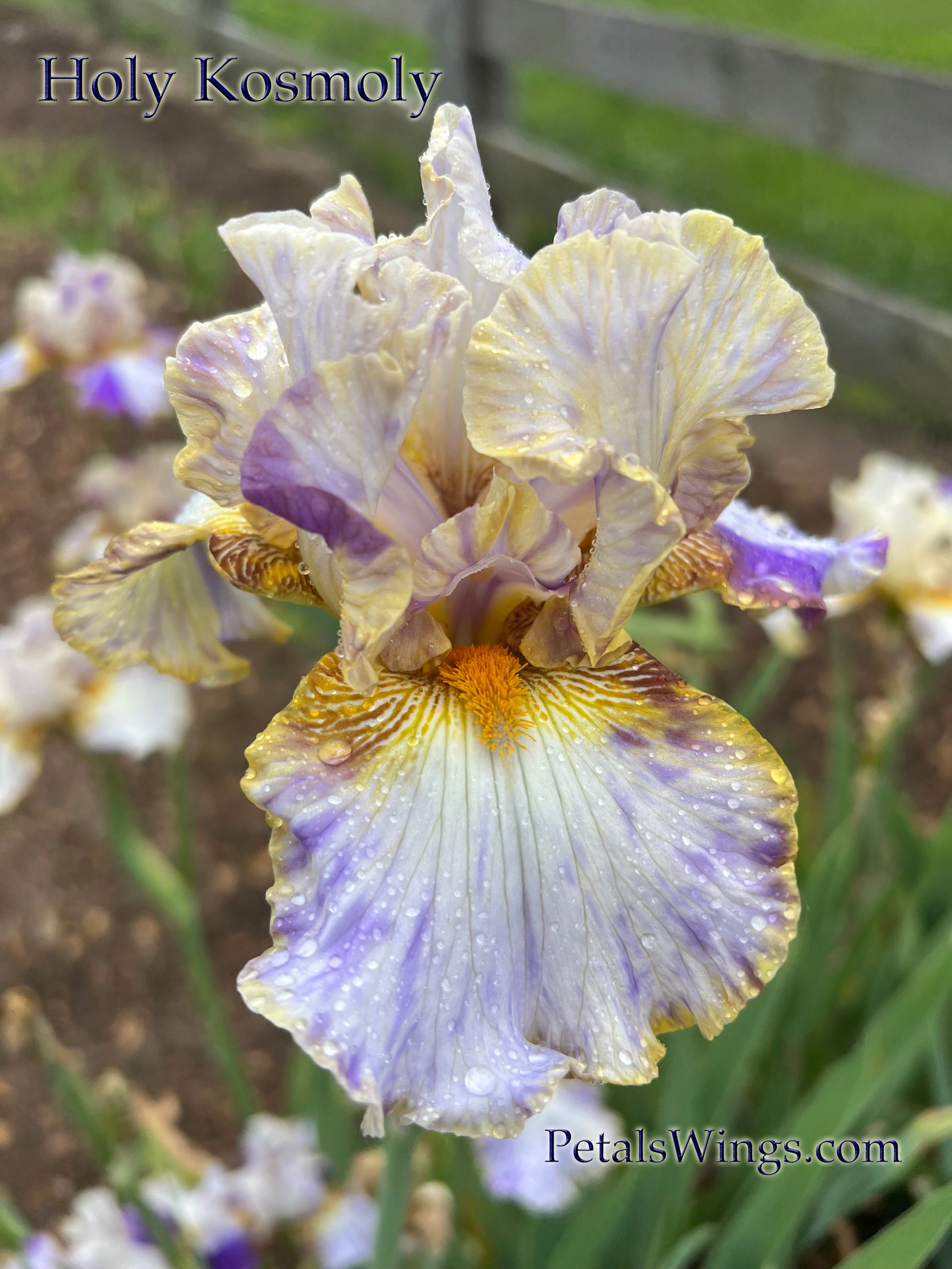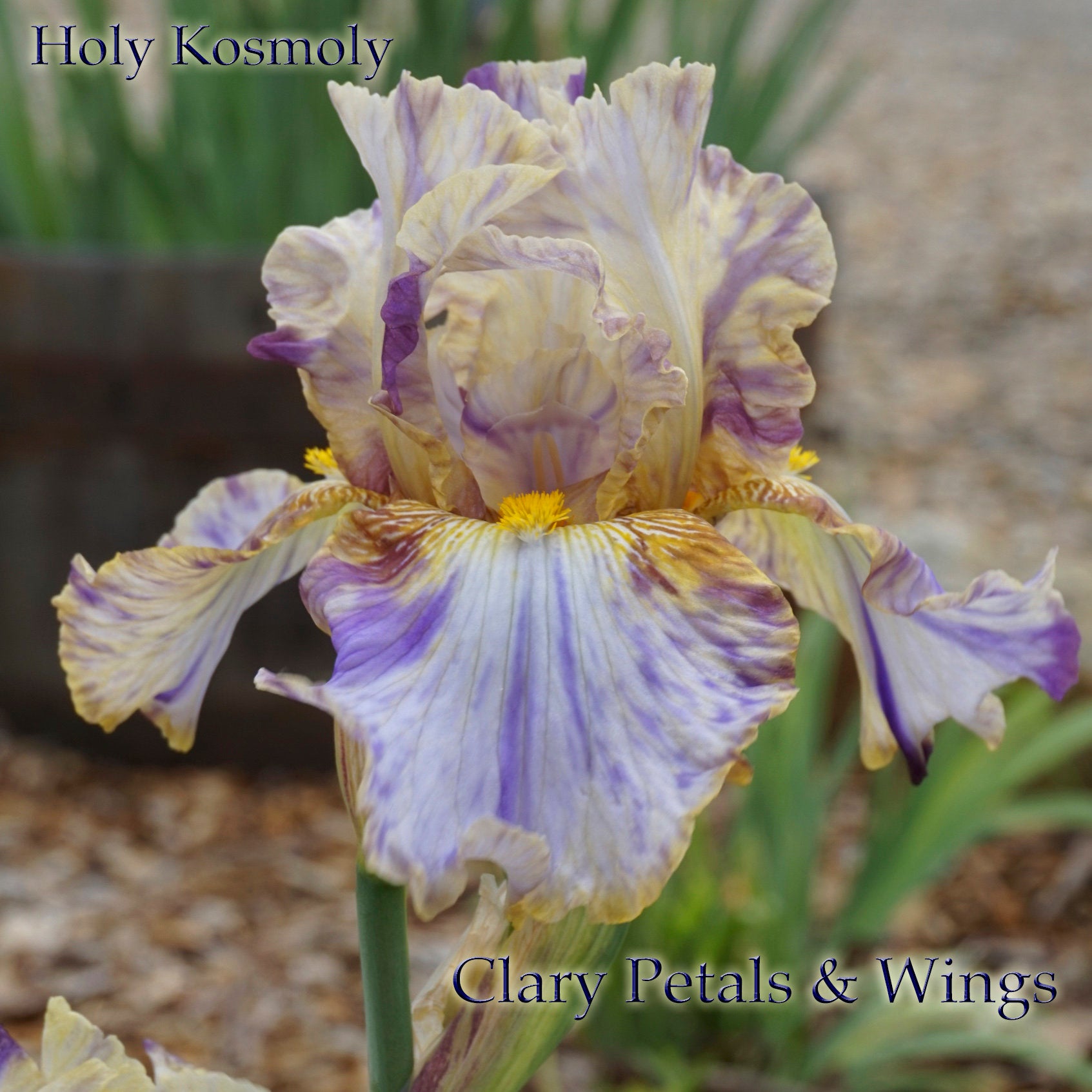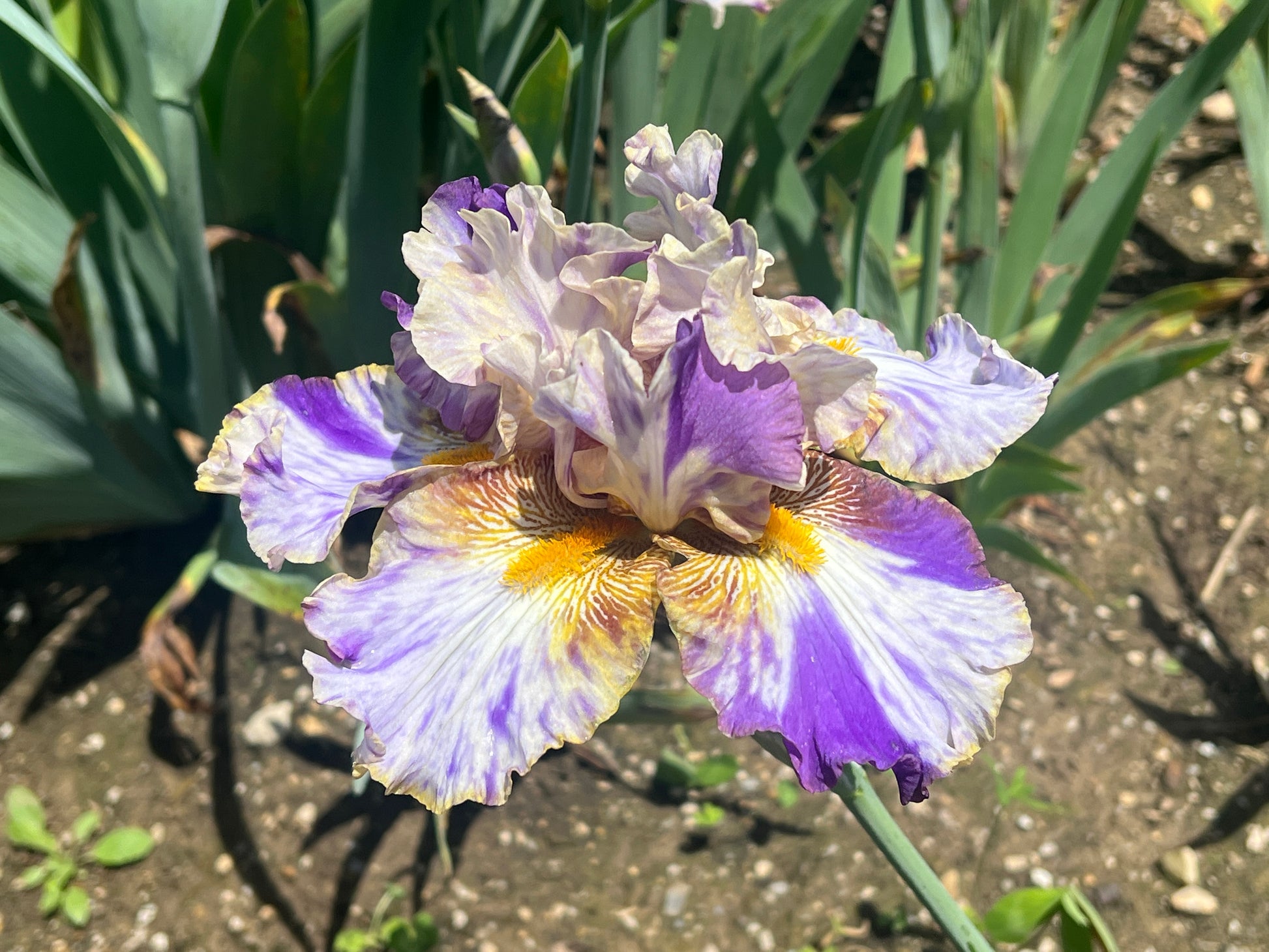 Ruffled and Flared cream randomly splashed reddish purple with golden orange beards. Grows to 35 inches tall and blooms mid to late season.