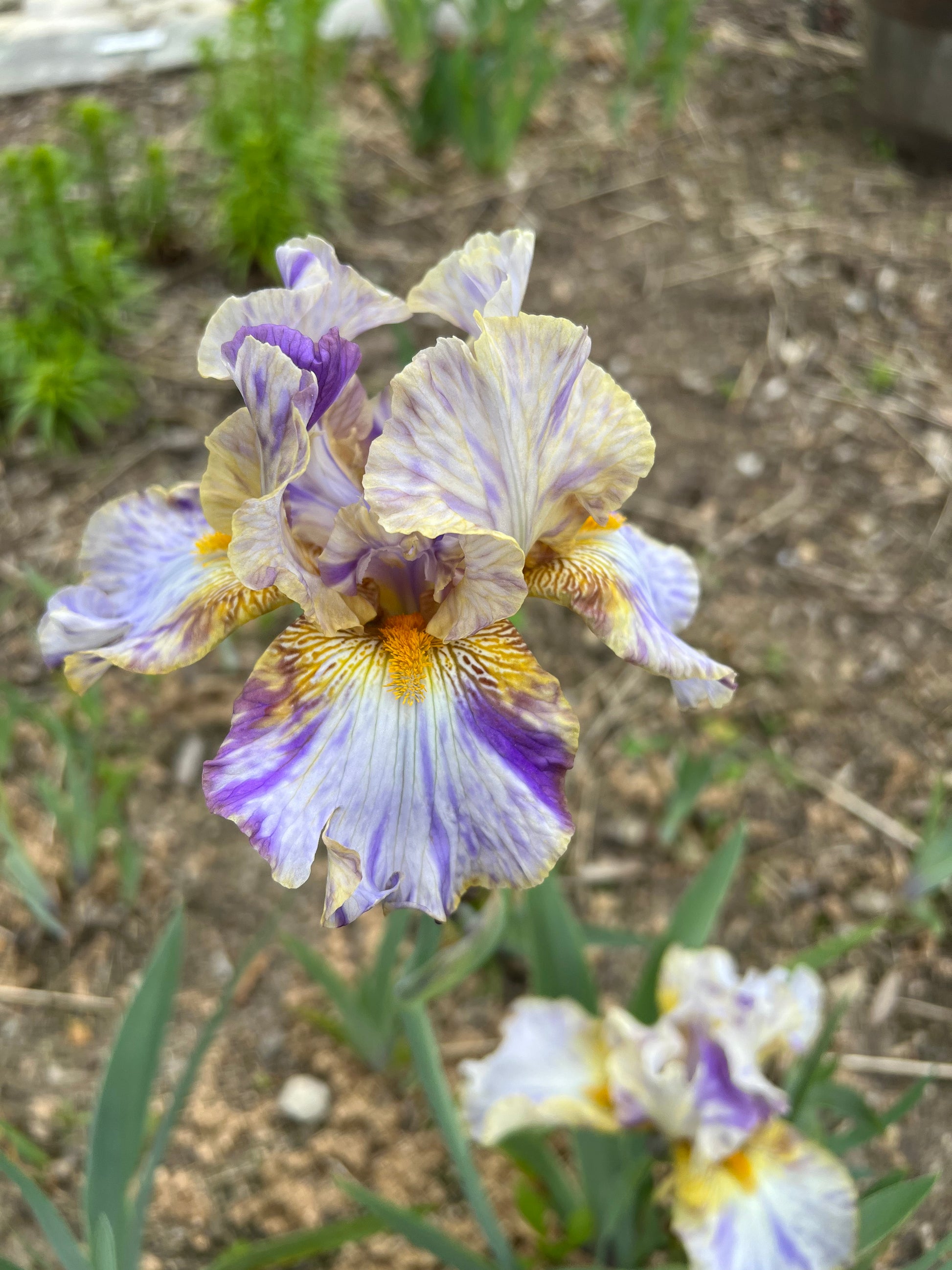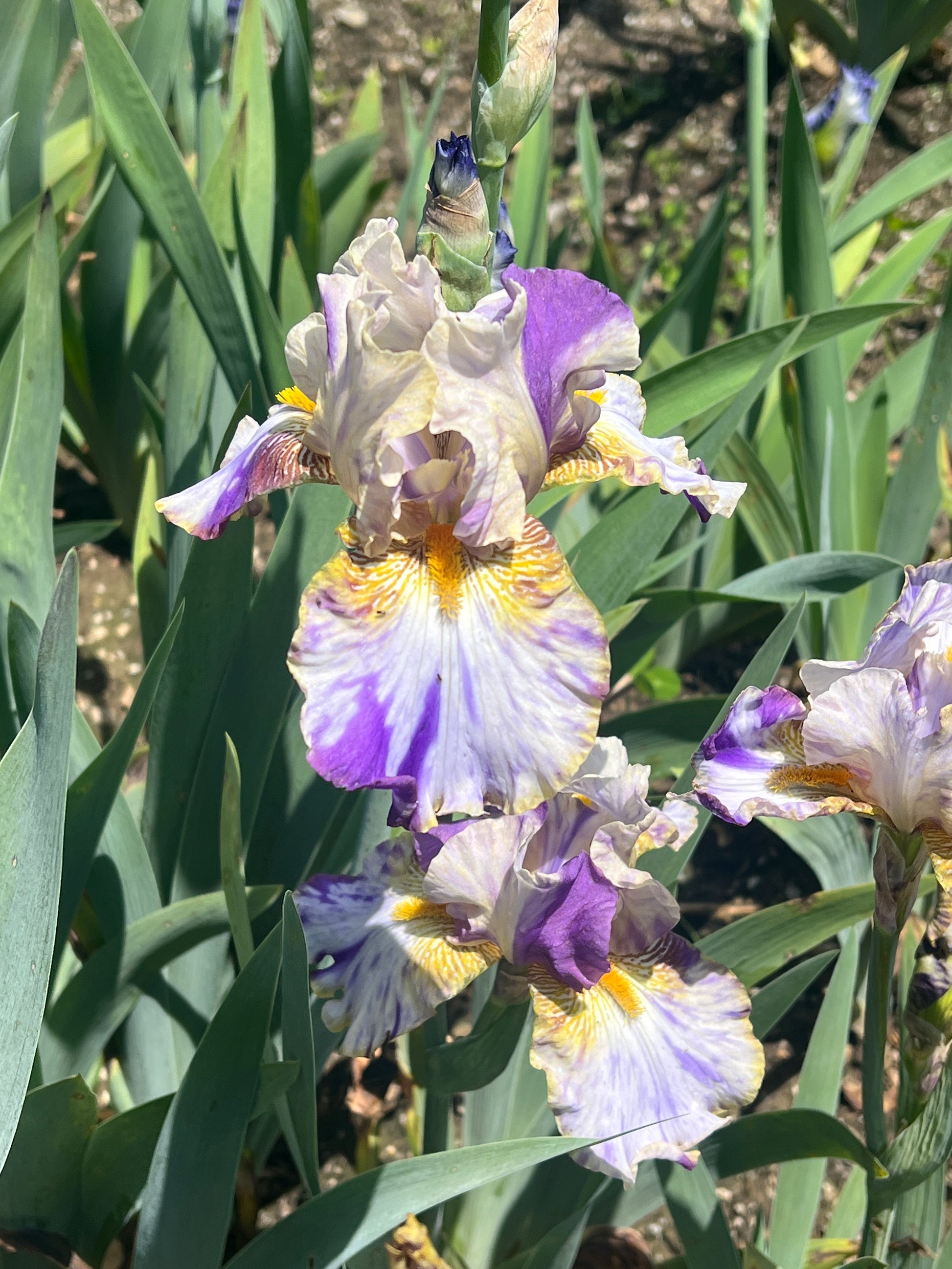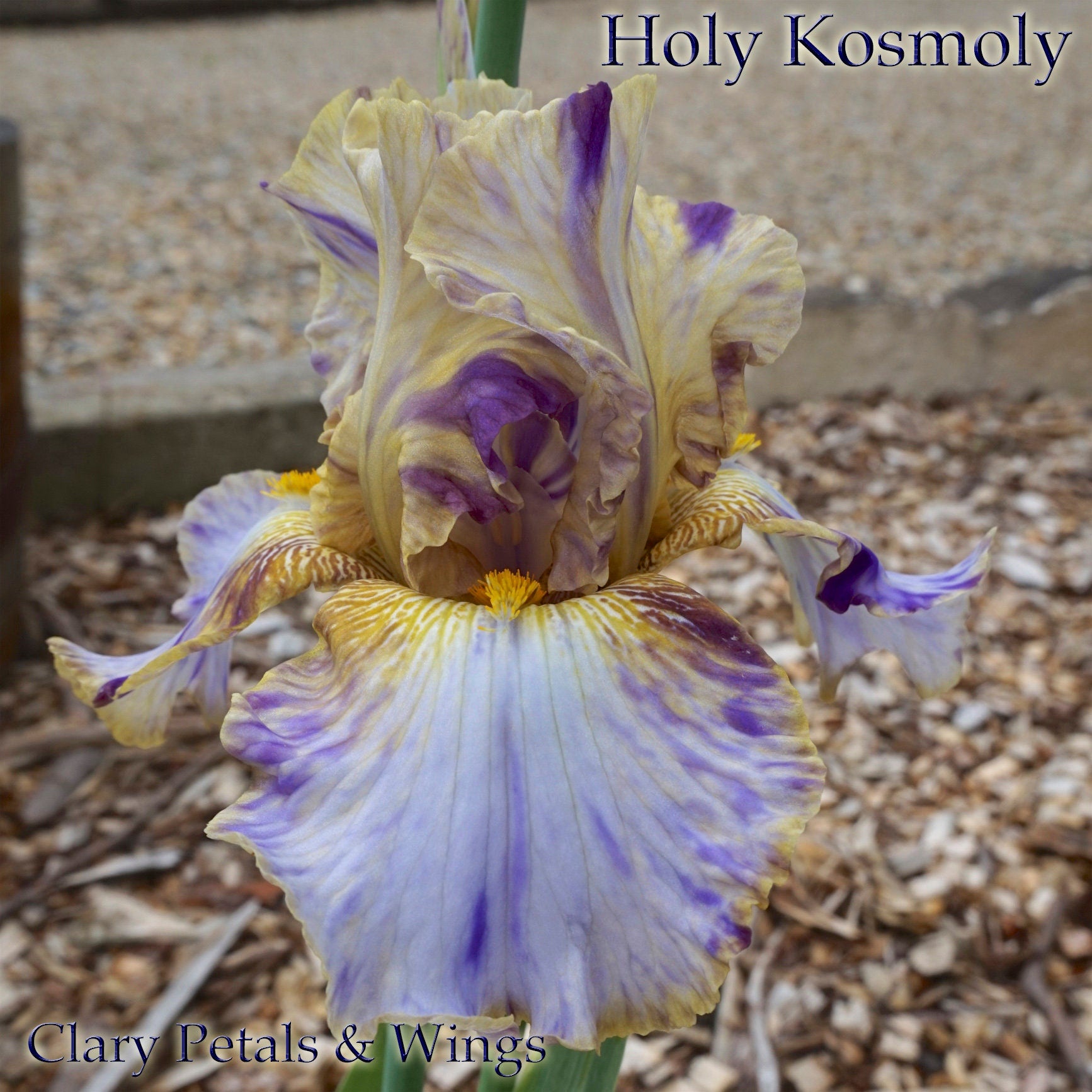 Ruffled and Flared cream randomly splashed reddish purple with golden orange beards. Grows to 35 inches tall and blooms mid to late season.
