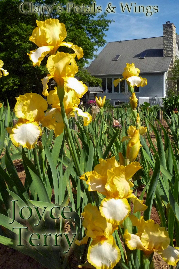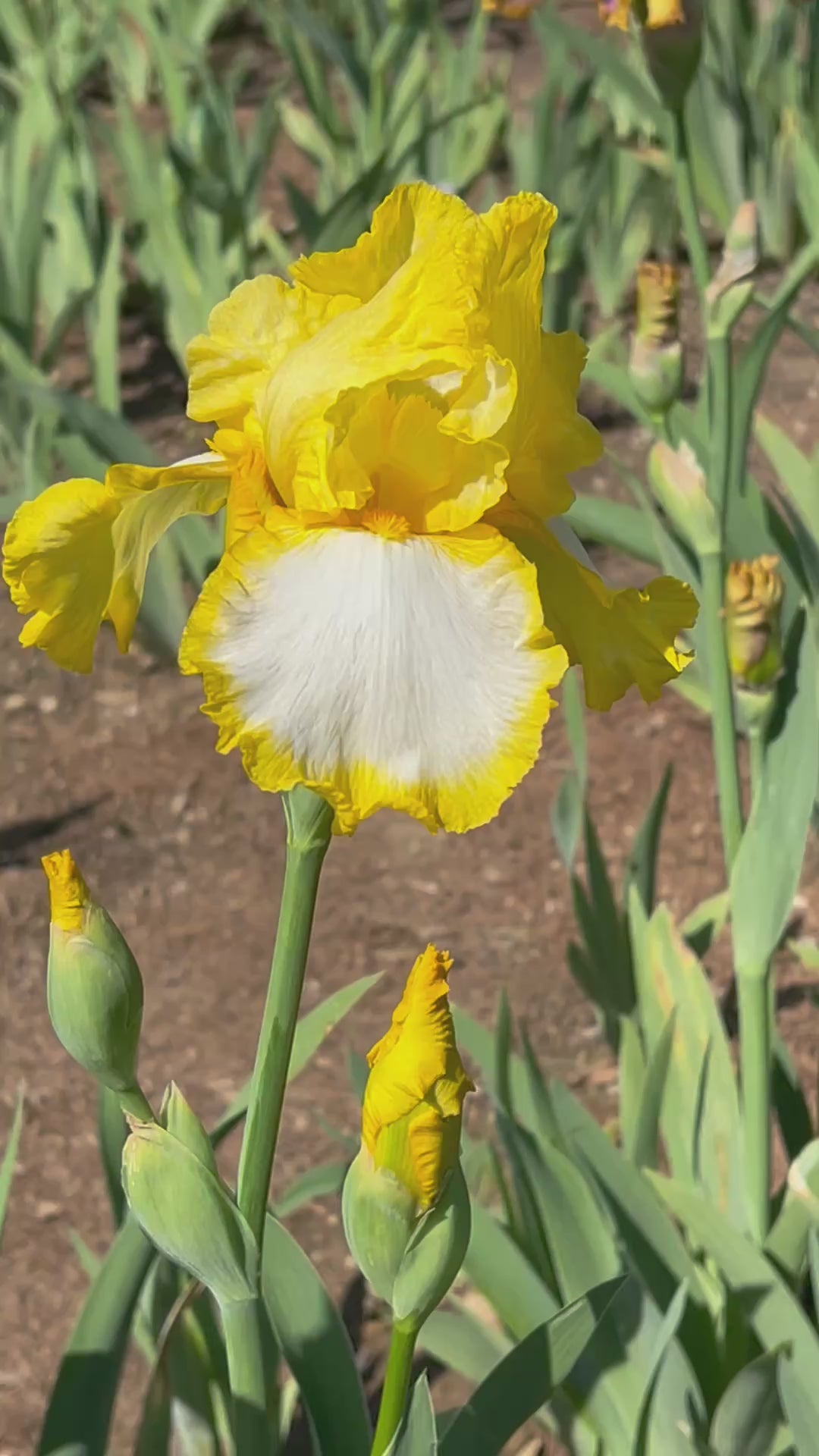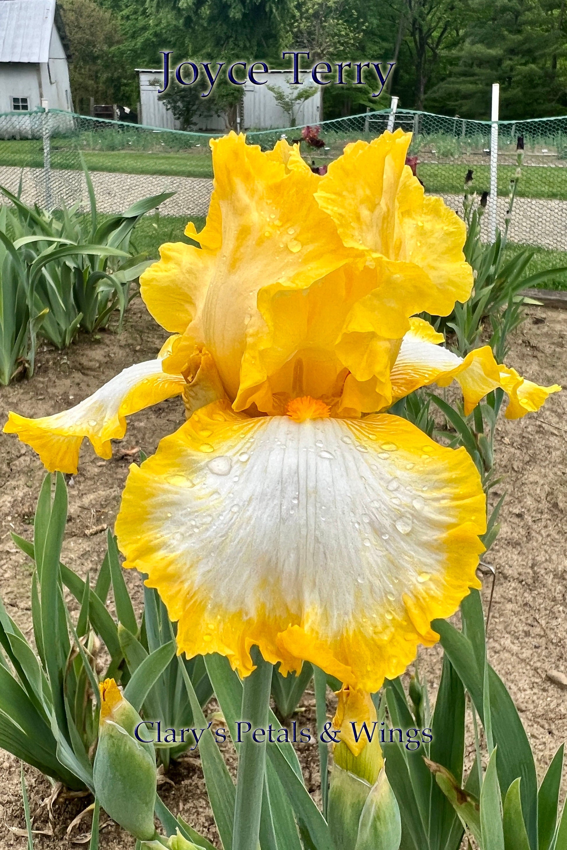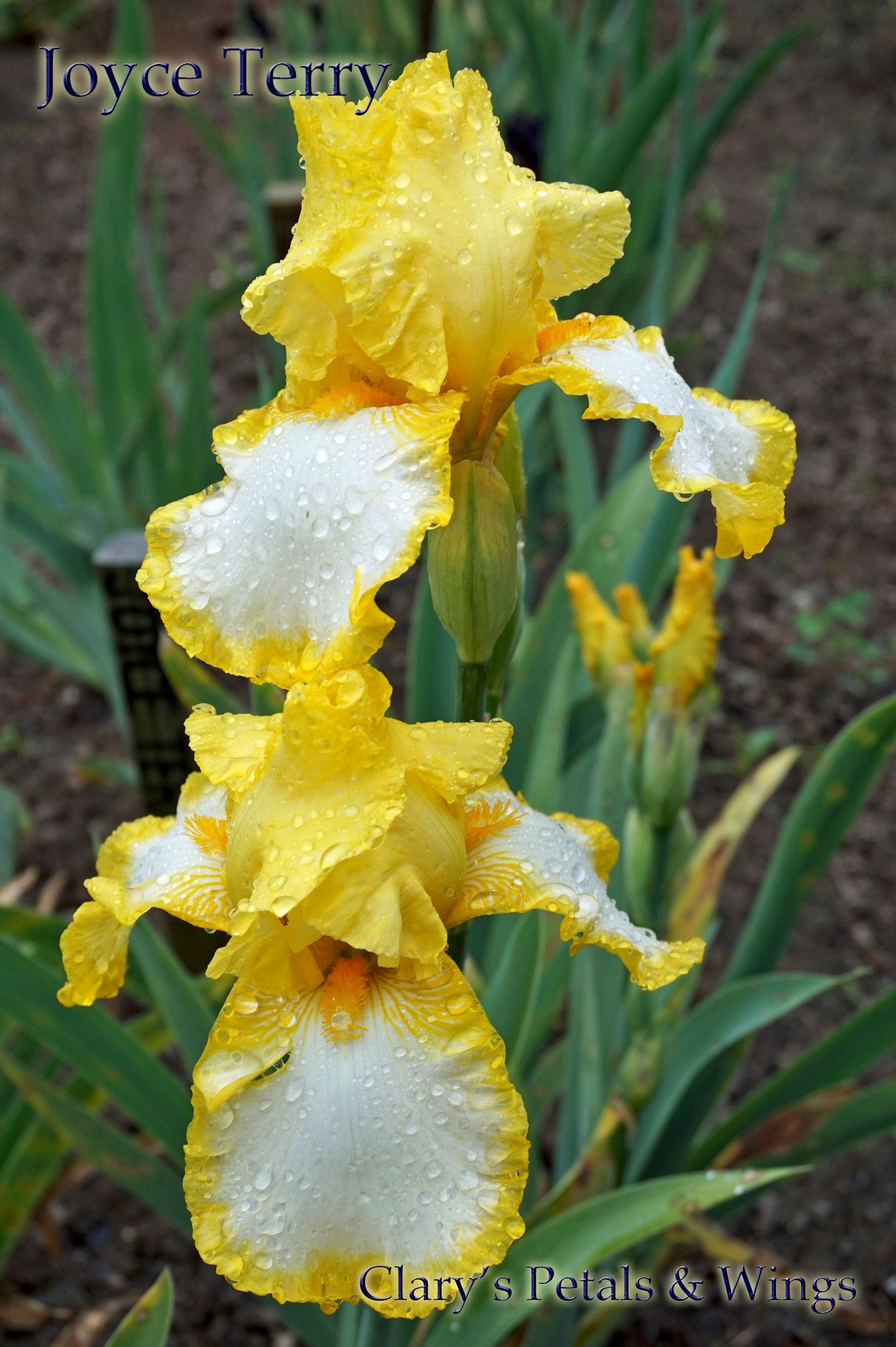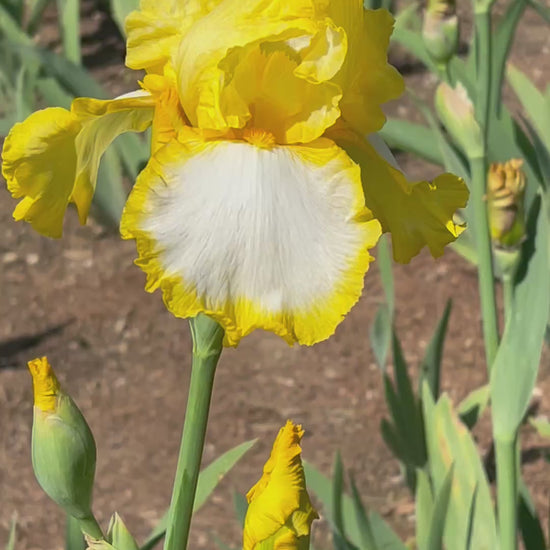 Standards are sunny yellow with falls of white edged in yellow with a yellow beard. Bold, bright and very cheerful. Excellent vigor, hardiness and bloom consistency. Late mid season bloom. 38" tall