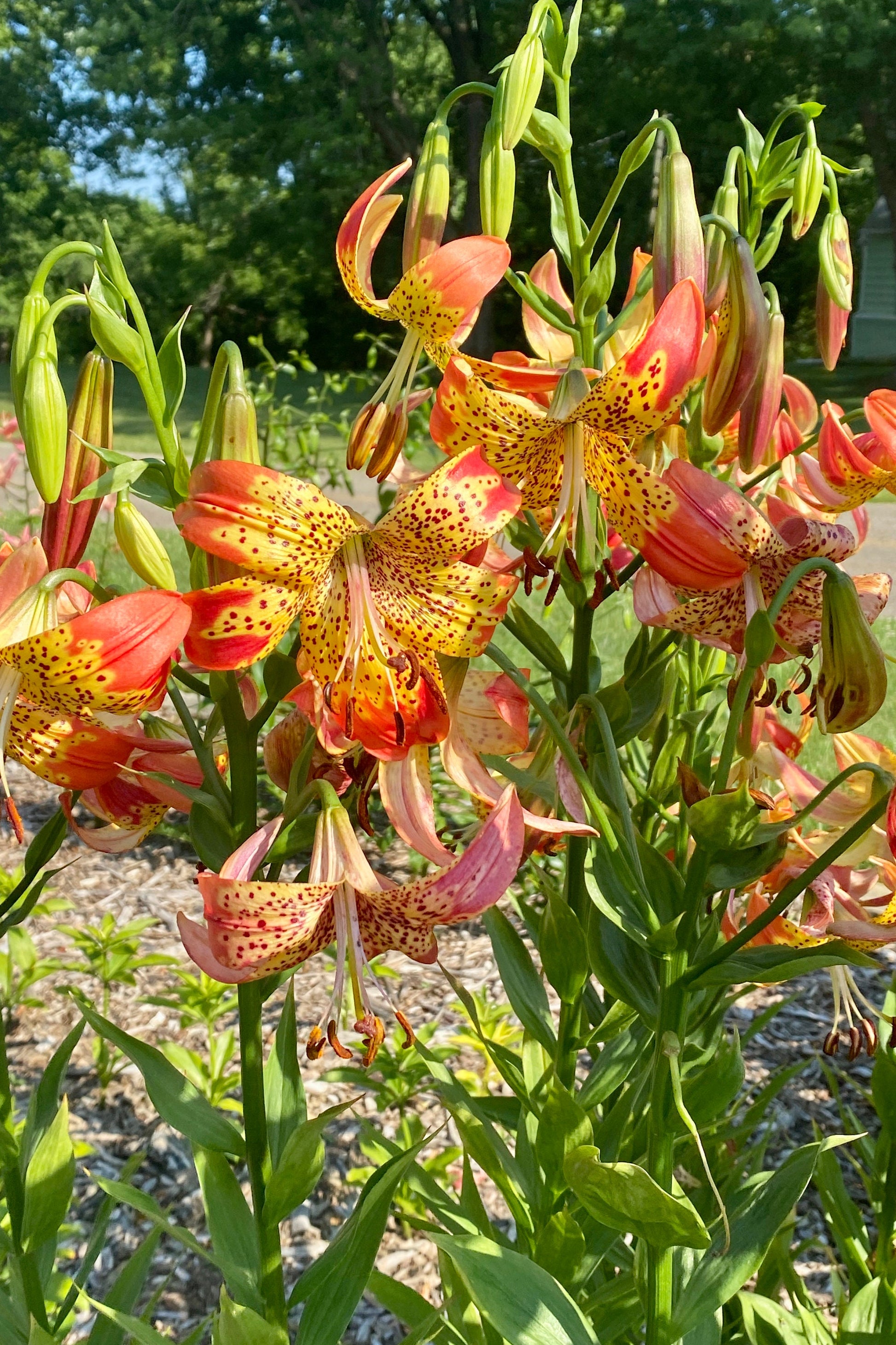 A result from an unusual cross between Lilium Longiflorum (Easter lily) which is native to Japan and Lilium Pardalinum, which is a Californian native. Outward-facing, 6" blooms of rich red are generously speckled in black with large, vibrant yellow centres. Strong stalks that easily bear the weight of the abundant lilies grow to 3' in the first year and up to 5' thereafter. A lovely focal point planting, it also attracts butterflies and makes a great cut flower.  A true show-stopper! It's a 'must have' for any lily enthusiast or the avid gardener who is always looking for something unusual.