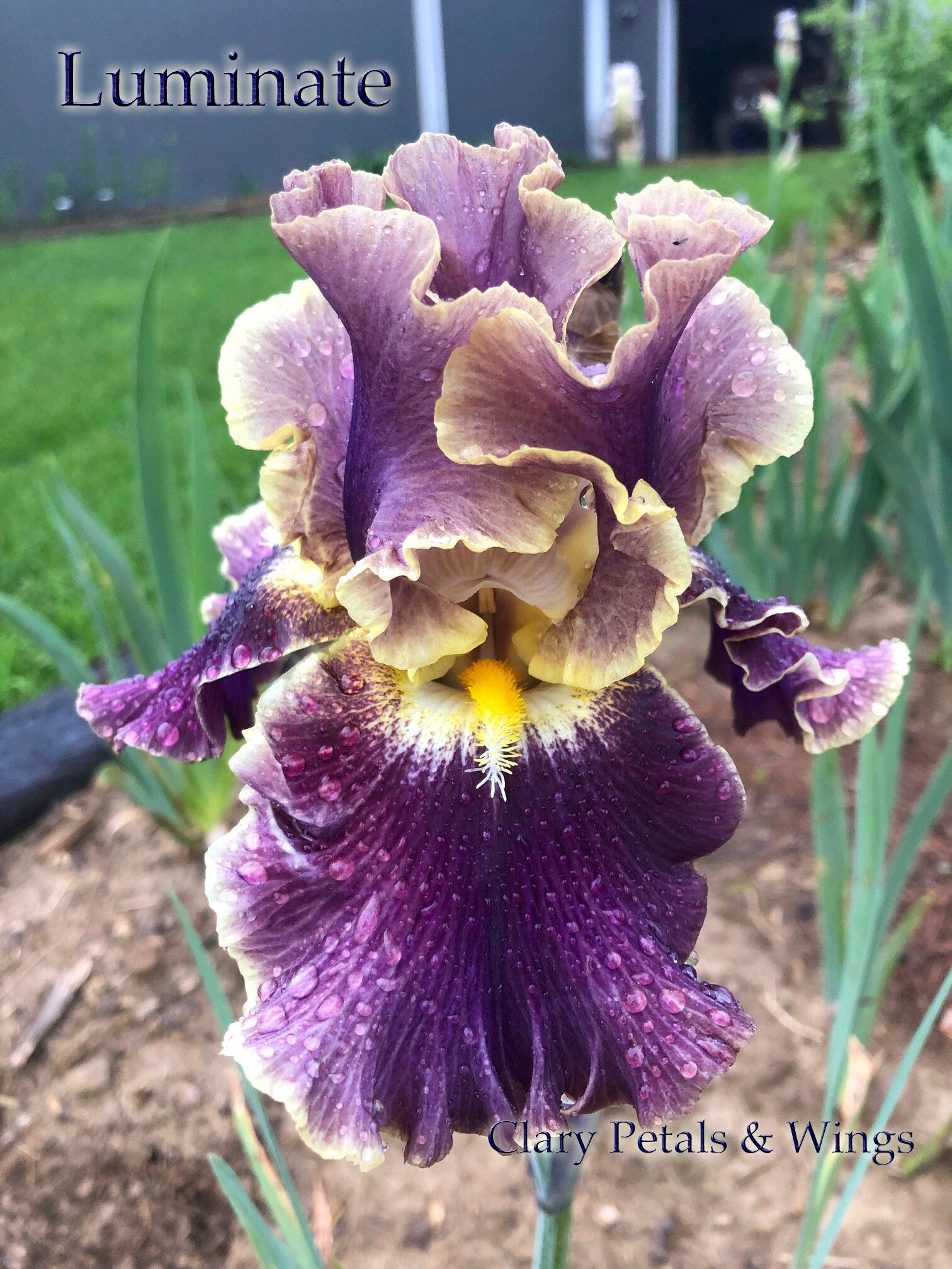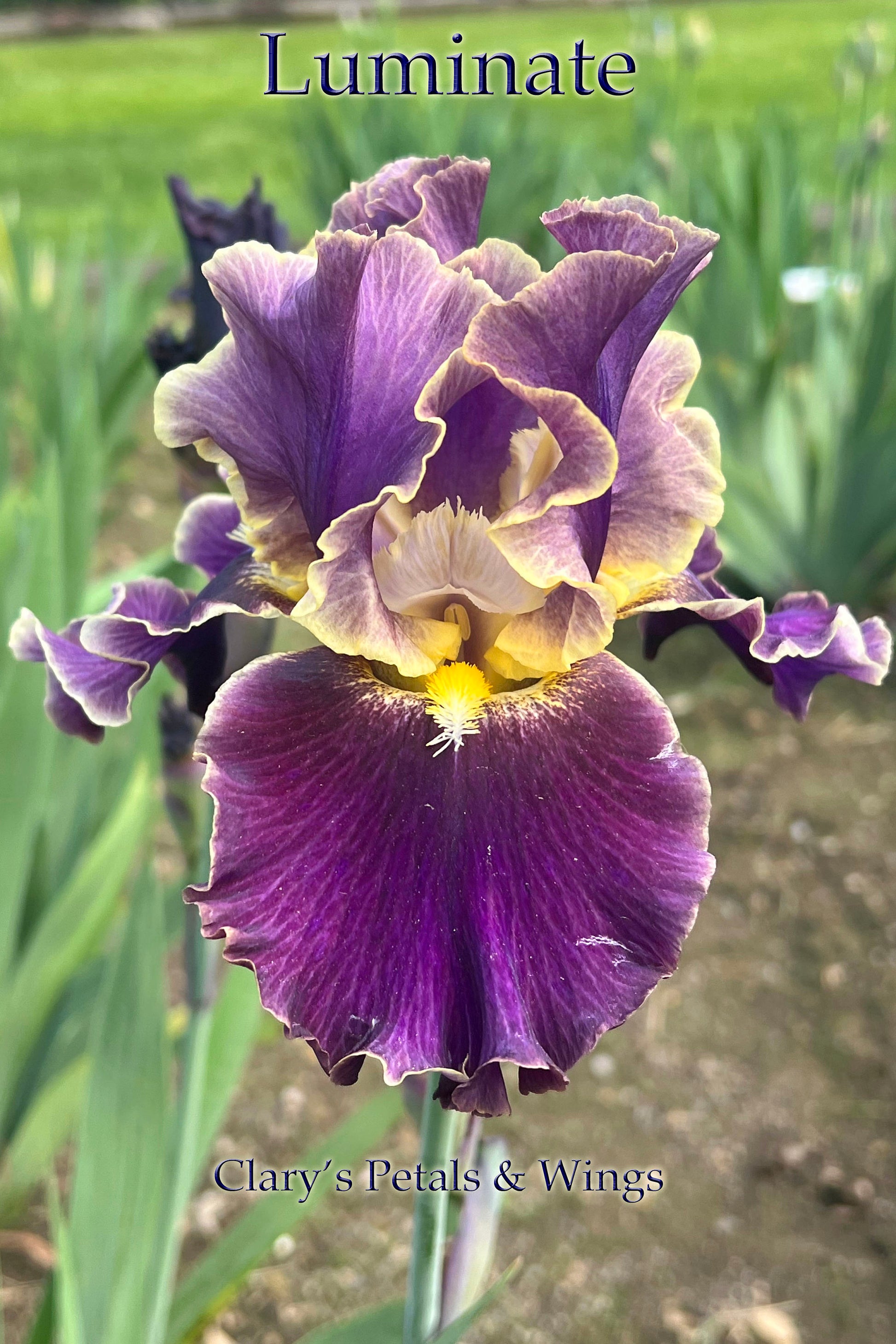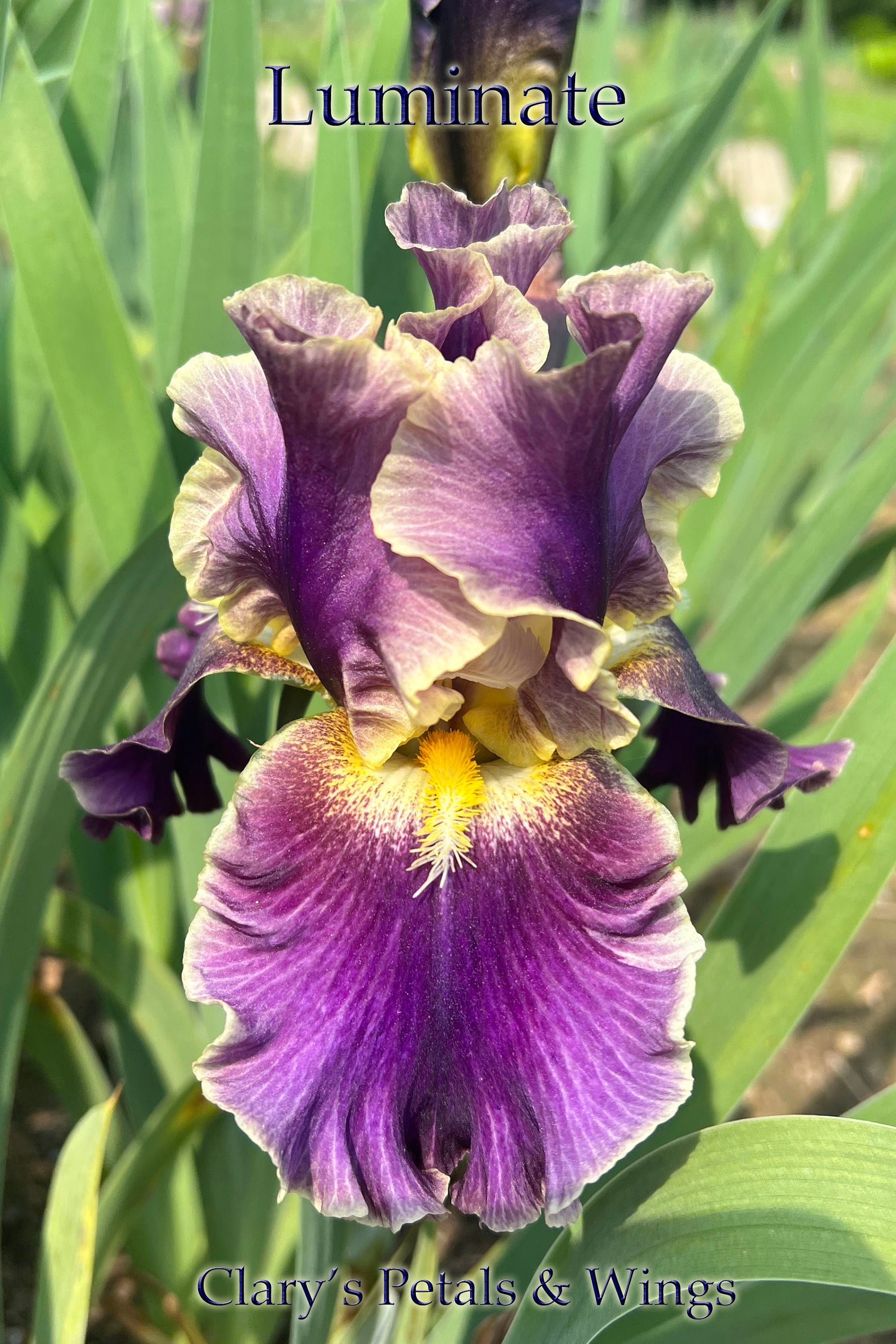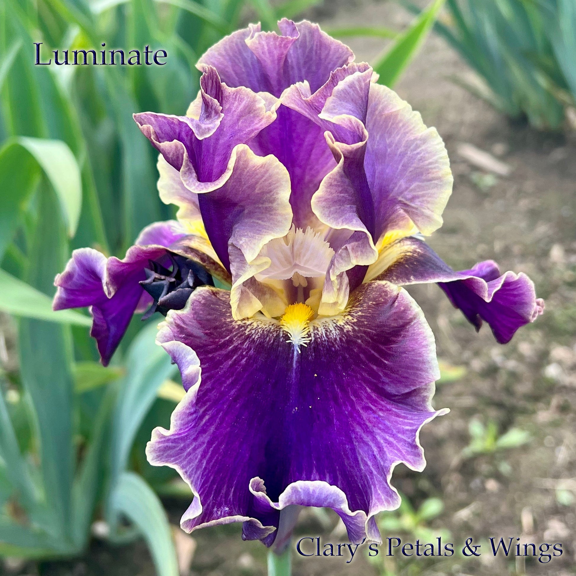 Amazing vigor! Violet standards have pale grayed orange veining and edges. Dark violet falls are veined pale empire yellow with a near cream colored edge. Lemon yellow beards are nestled in the pure white throat. Muted colors but great garden effect! Grows to 36" and blooms early to mid season with all his buds it's a very long lasting bloom.