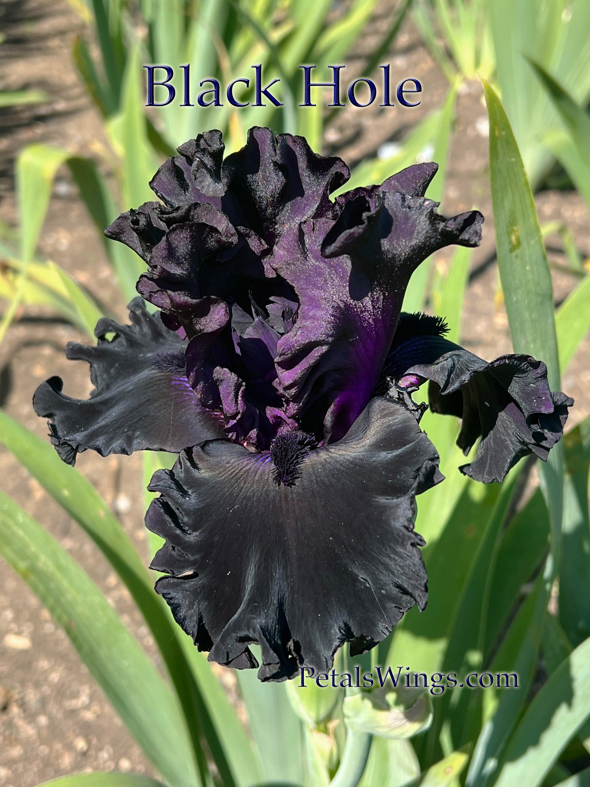 Standards purple-black; style arms black; falls black, slightly lighter haft beside beards; beards purple-black; pronounced sweet fragrance.