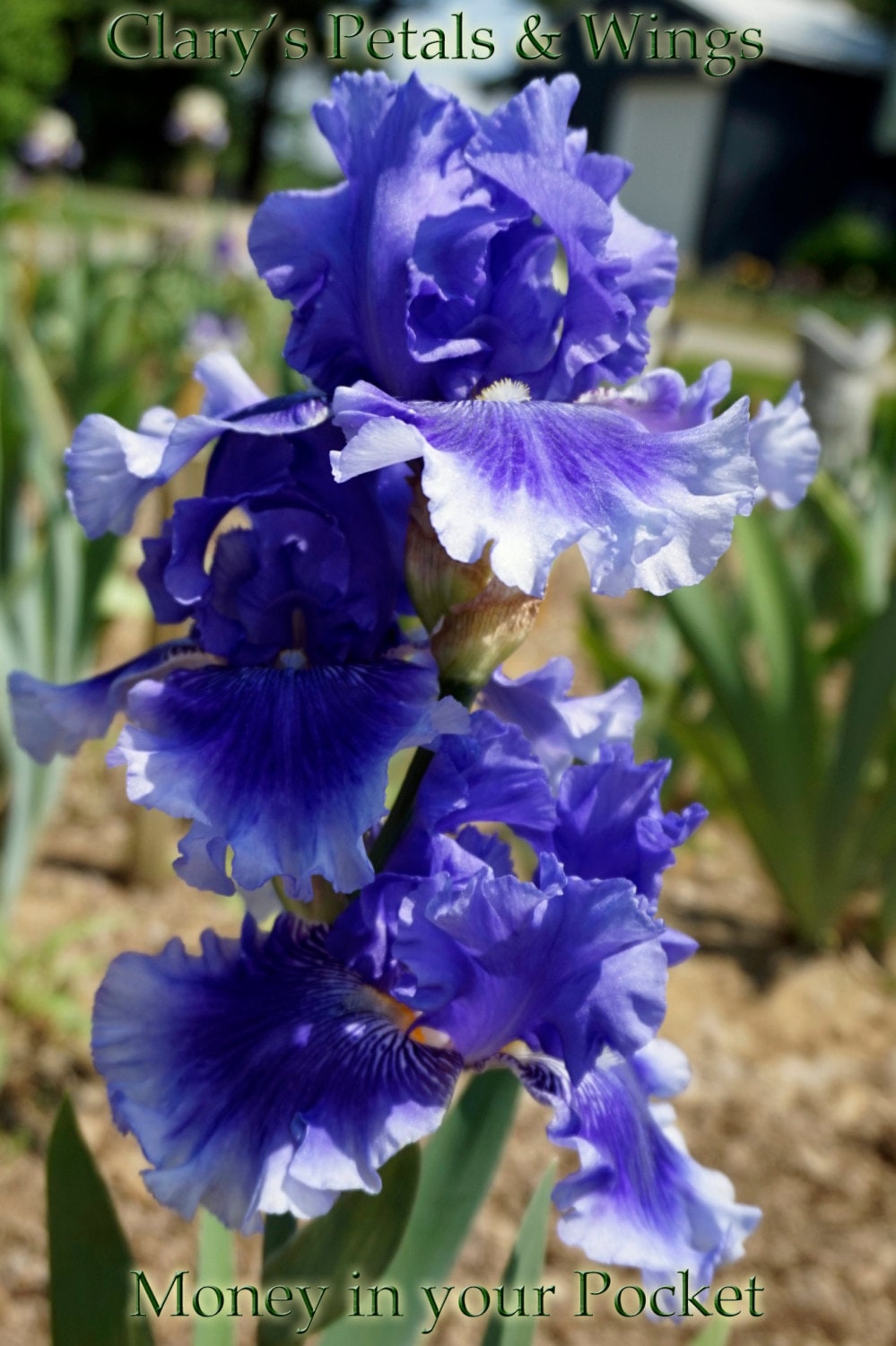 Beautiful medium cornflower blue with white areas around beards sanded with blue rays. Falls are darker in centers blending to blue-white margins giving great depth and dimension to them. Blooms mid/late season. 36 to 44 inch stalks.