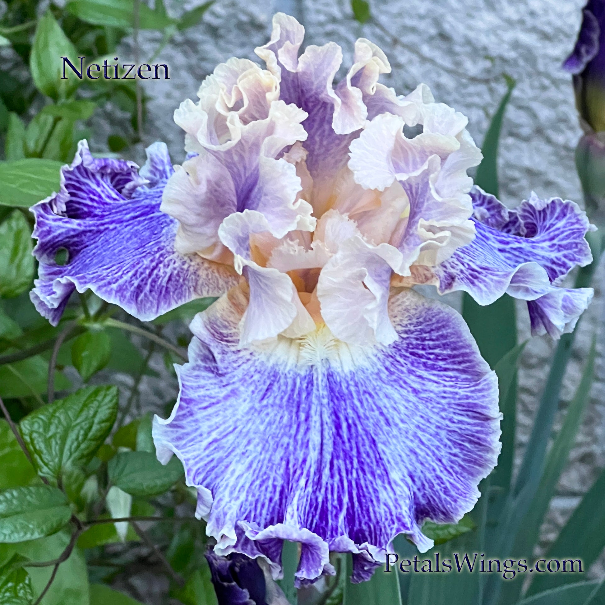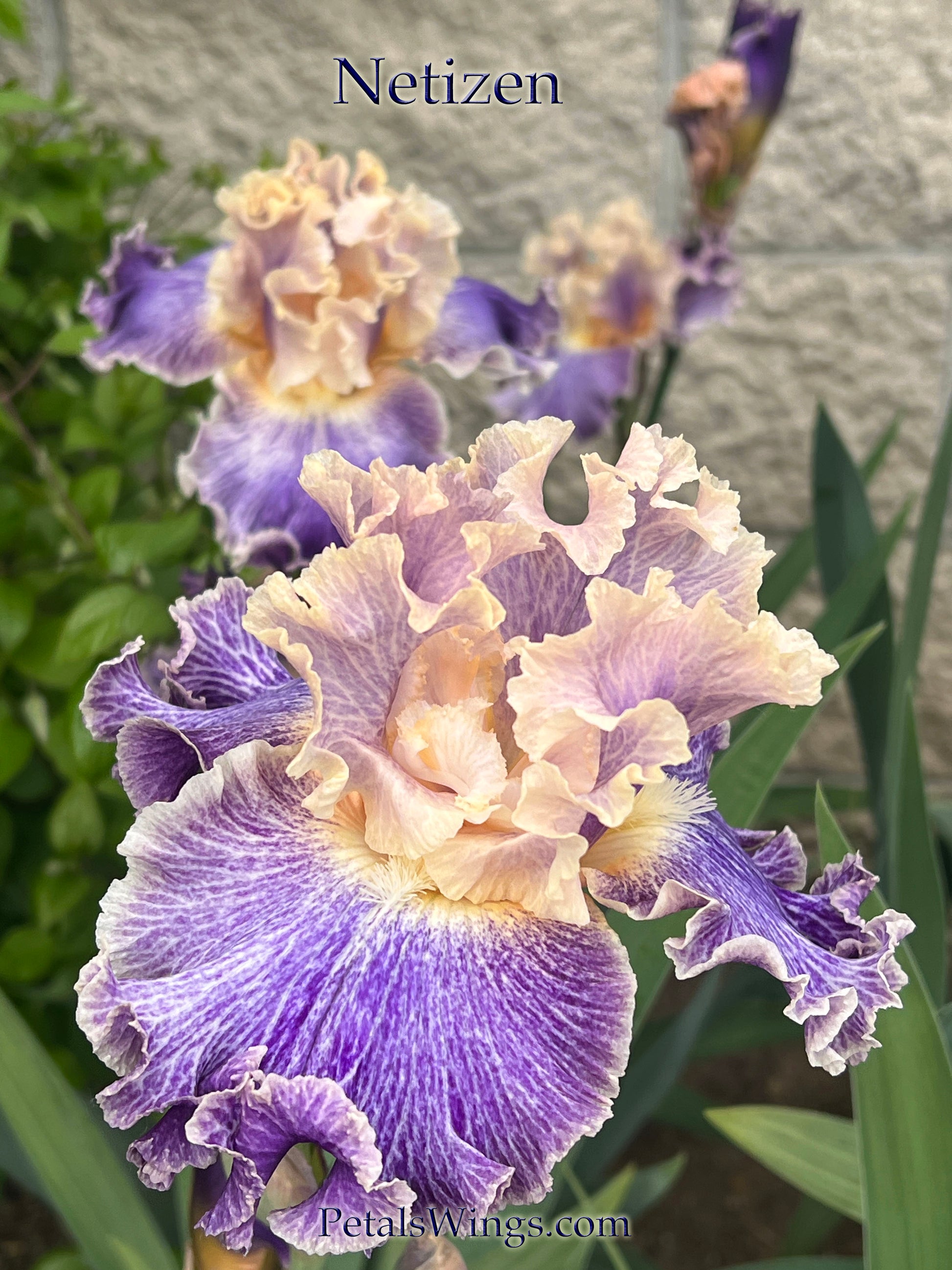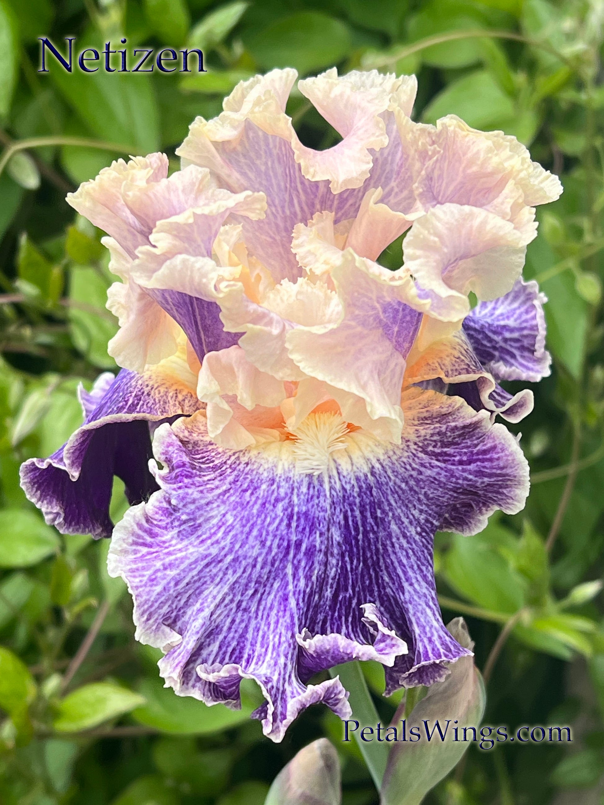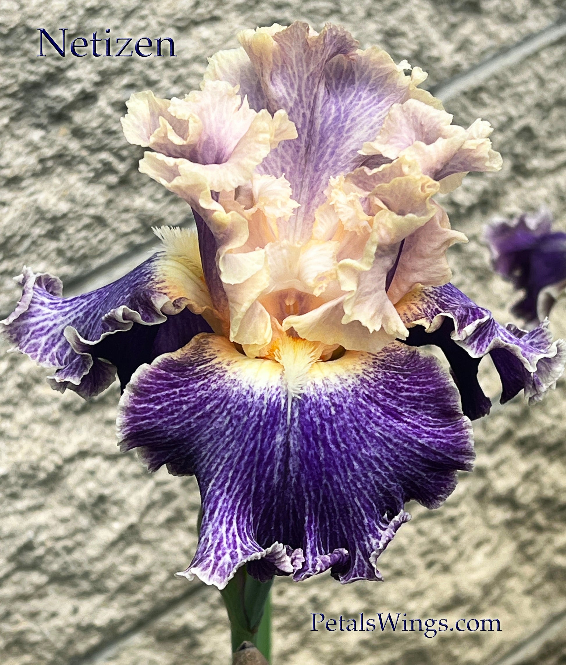 Like the world wide web, the luminata realm keeps expanding, as both new color and pattern applications are appearing. Netizen’s color is a more restrained version, with violet standards, veined and edged cream, over similar falls that also carry an apricot glow on the hafts. The white luminata patch holds the beard which transitions from white to yellow to scarlet in the throat. The pale fall veining is so overall it gives the violet color a netted appearance. Ruffled standards, stalks with about seven buds Grows to 40 inches tall and blooms early to mid season.