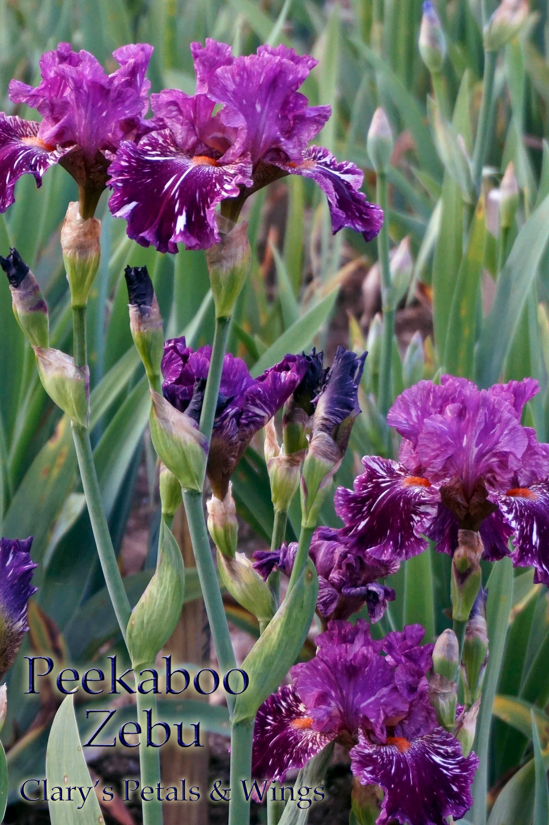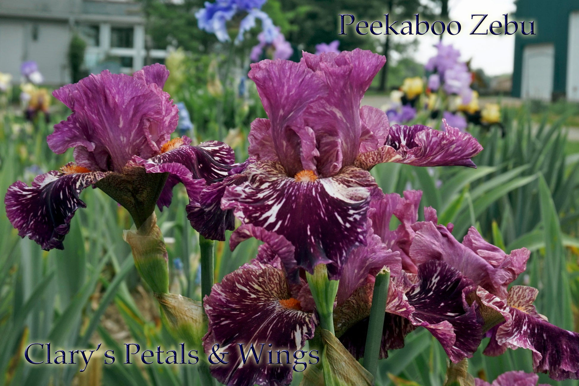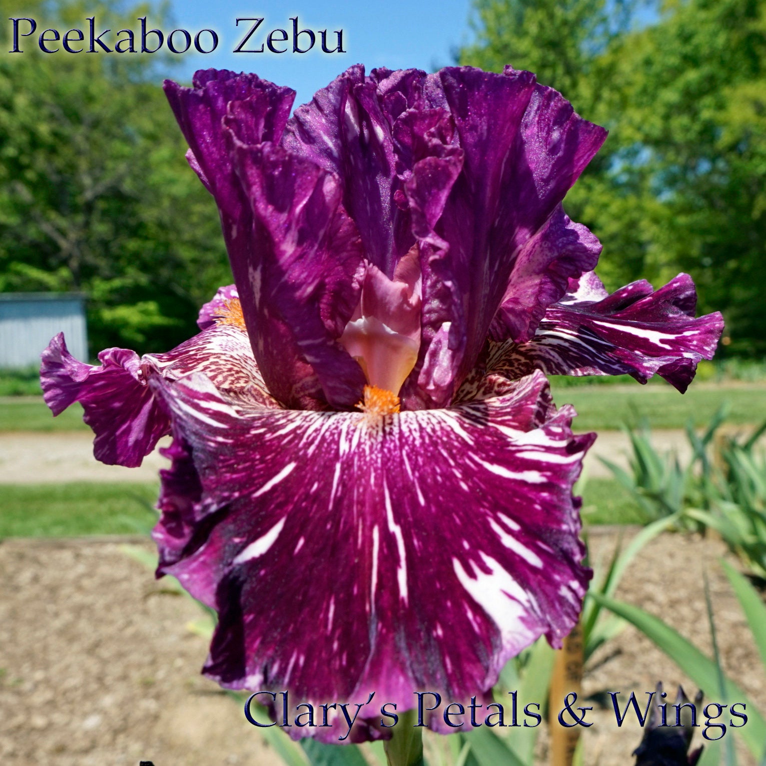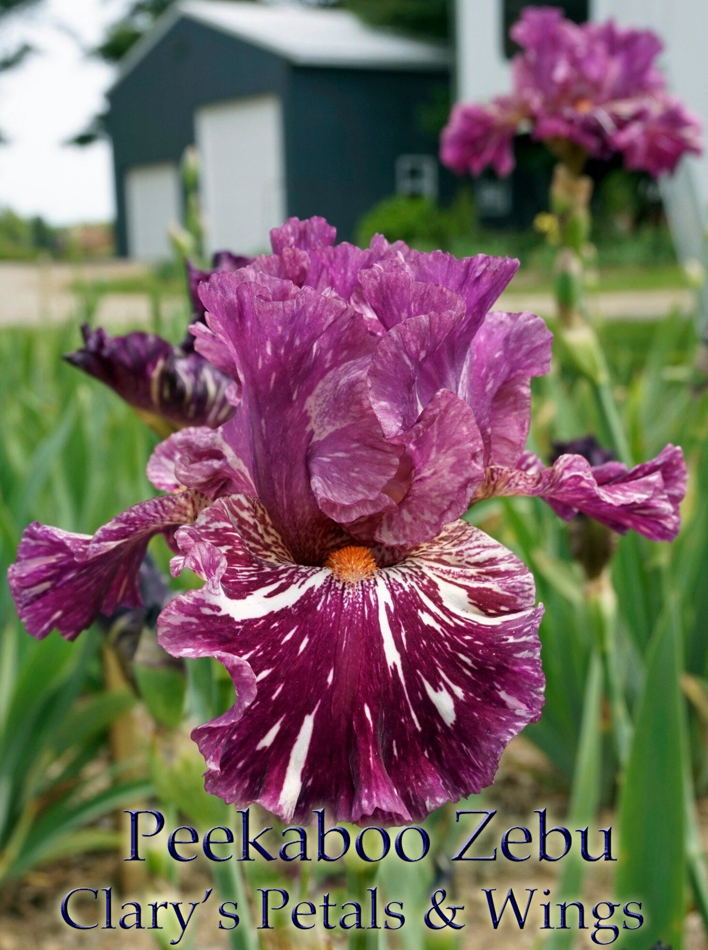 Nothing shy about this broken color iris! Standard are a beautiful plum wine color with streaks of white.   Ruffled, semi flaring and streaked with Tangerine beards. Blooms mid to late season at 35" tall