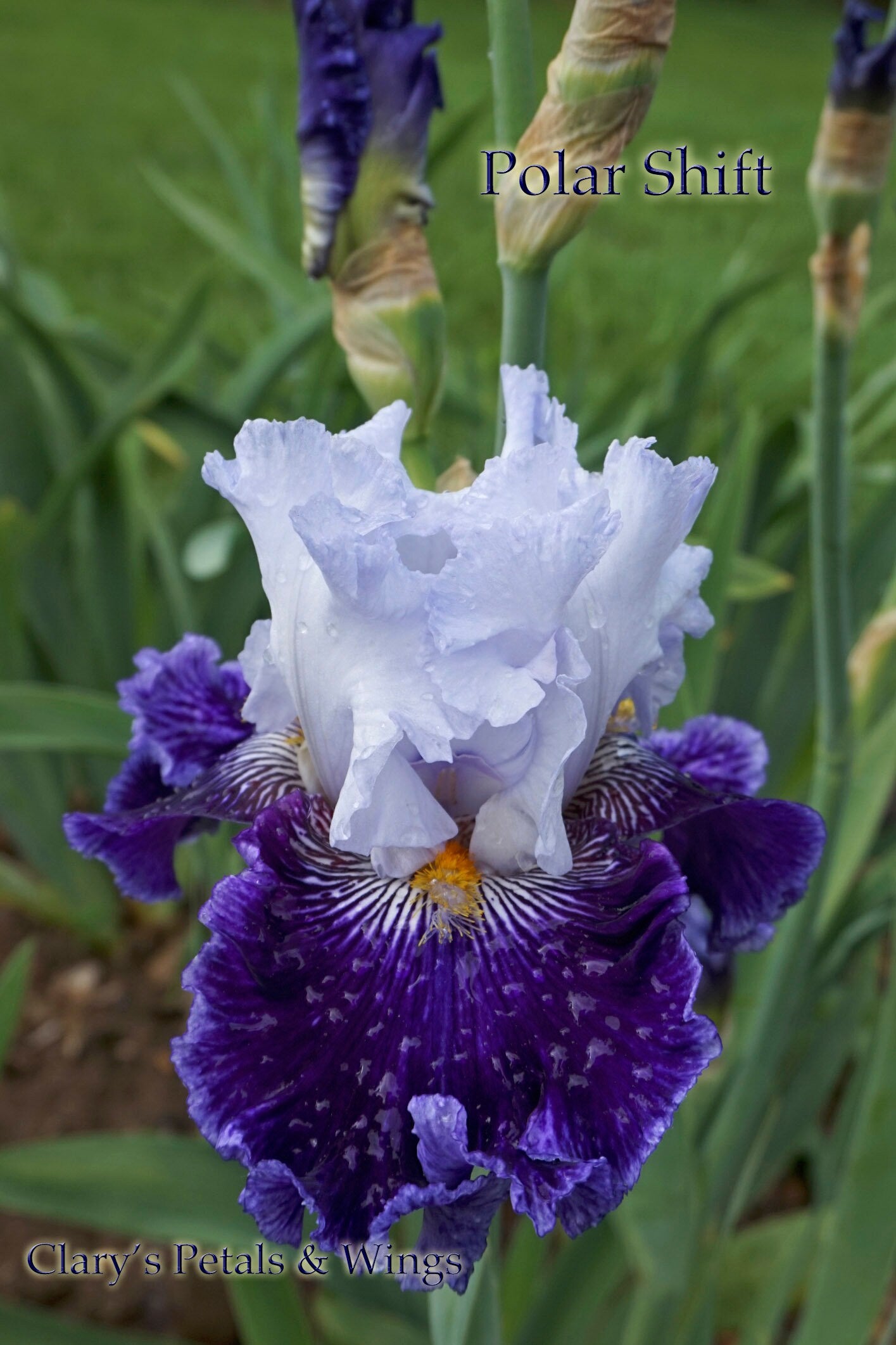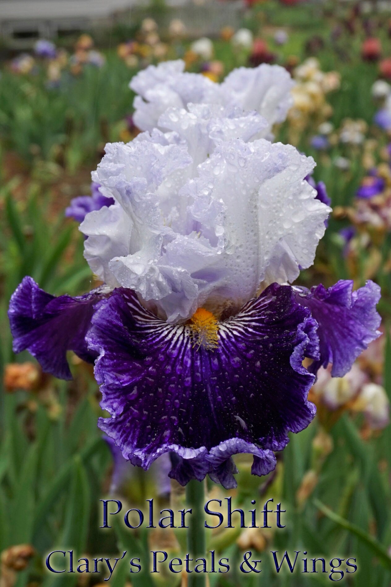 Strong growth and bloom! Great ruffling to the ice white standards. Deep cornflower blue falls have slight white markings around the beards and a contrasting 1/4” ice white edge. Orange beards add good color. 8 to 10 buds on perfectly branched stalks.