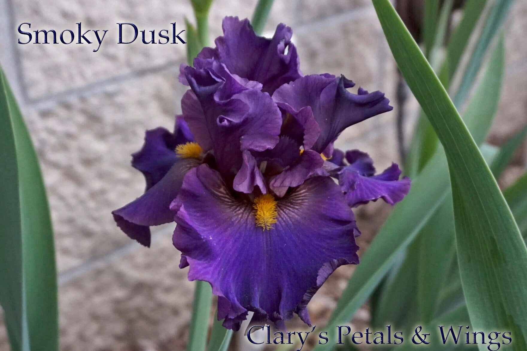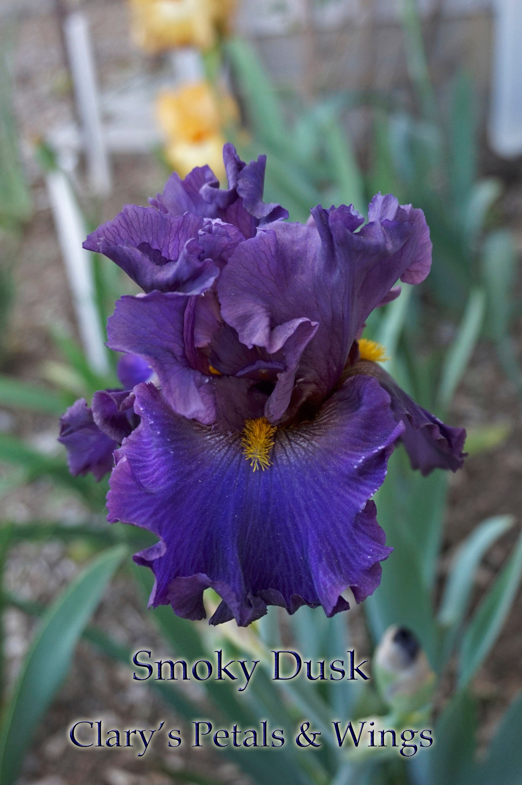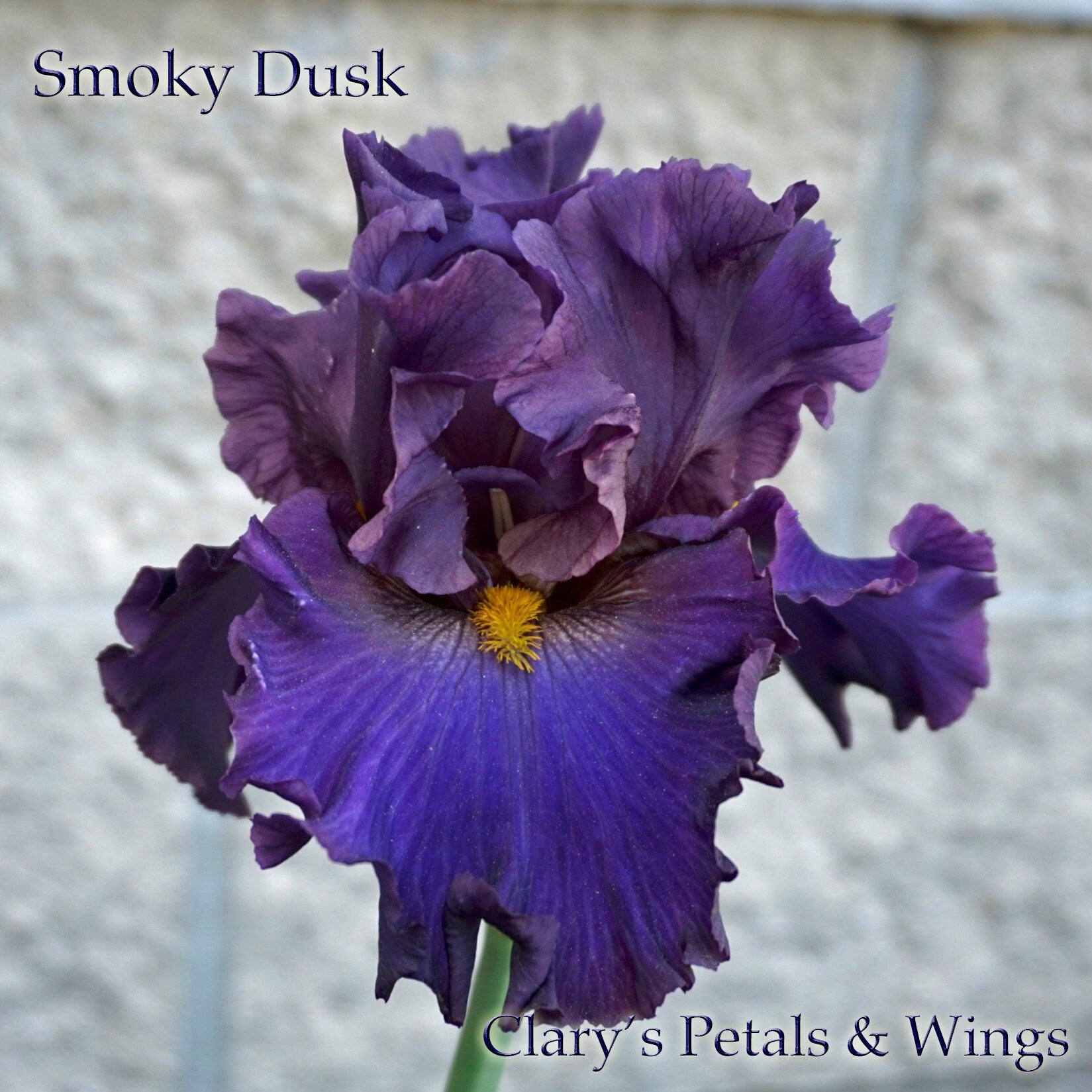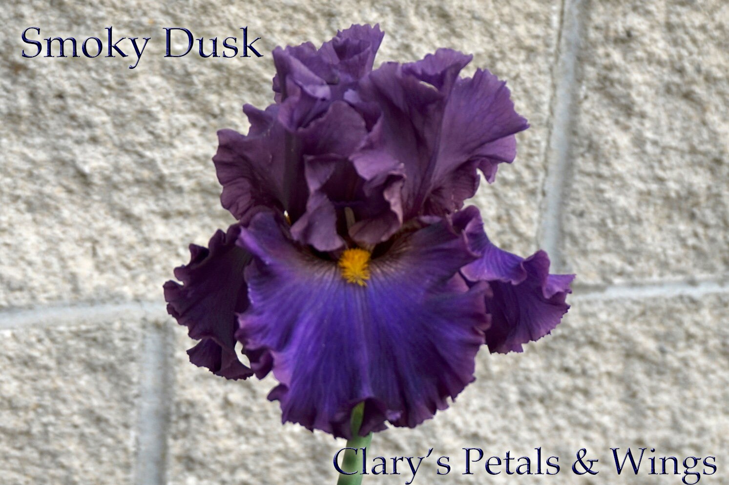 Smoky plum wine standards, falls just a shade darker and bluer. Beards, an odd greenish lime yellow, sit on a small haft area with white, brown, and grape reticulations. Form is wide and somewhat blocky, but nicely ruffled. Growth and performance excellent, with stalks averaging 7-9 buds. Grows to 39" and blooms mid season.