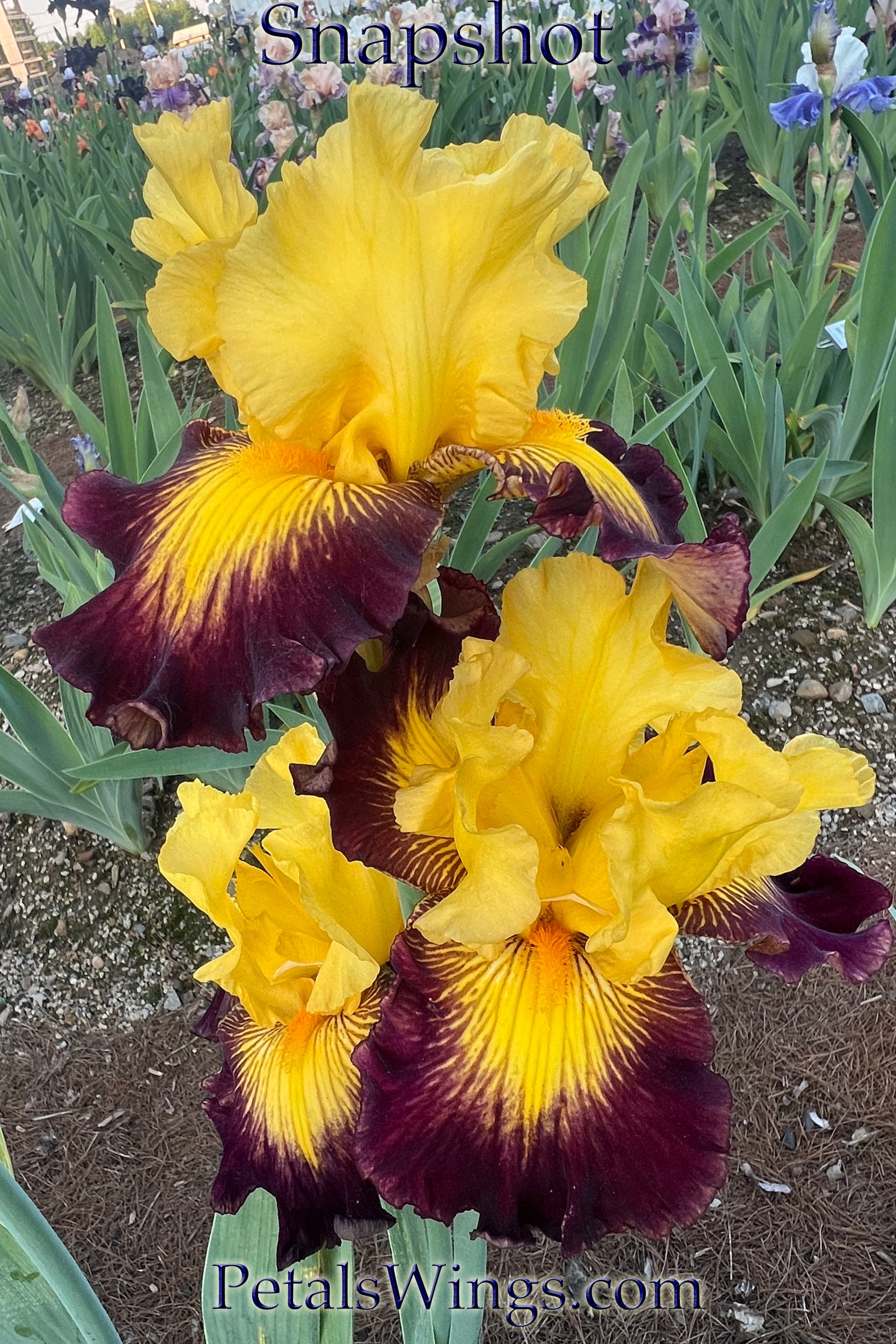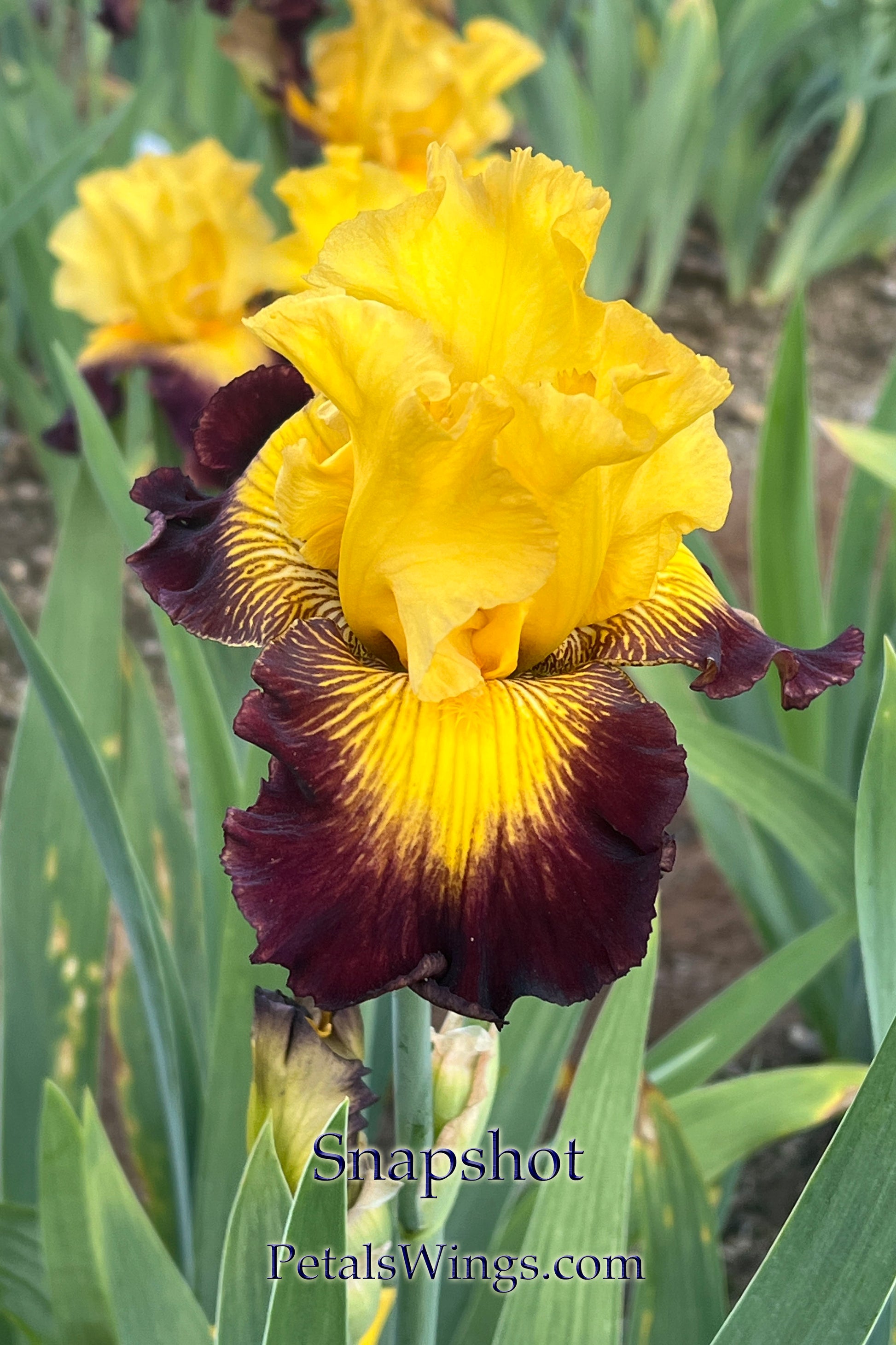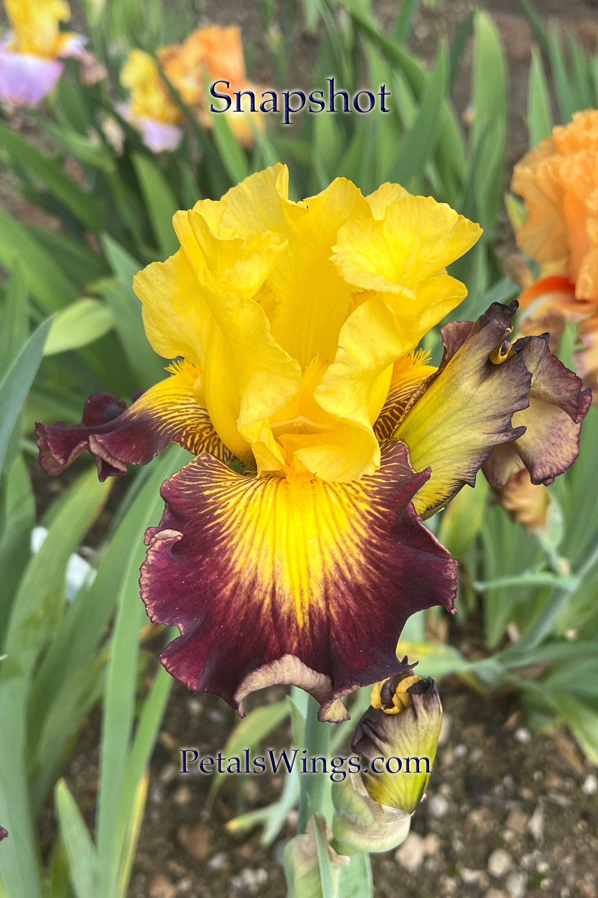 Standards are yellow with red dots at the base; style arms are also yellow; falls are mahogany red with a huge yellow center region around a yellow-orange beard; delicious smell. 32" , Midseason bloom.
