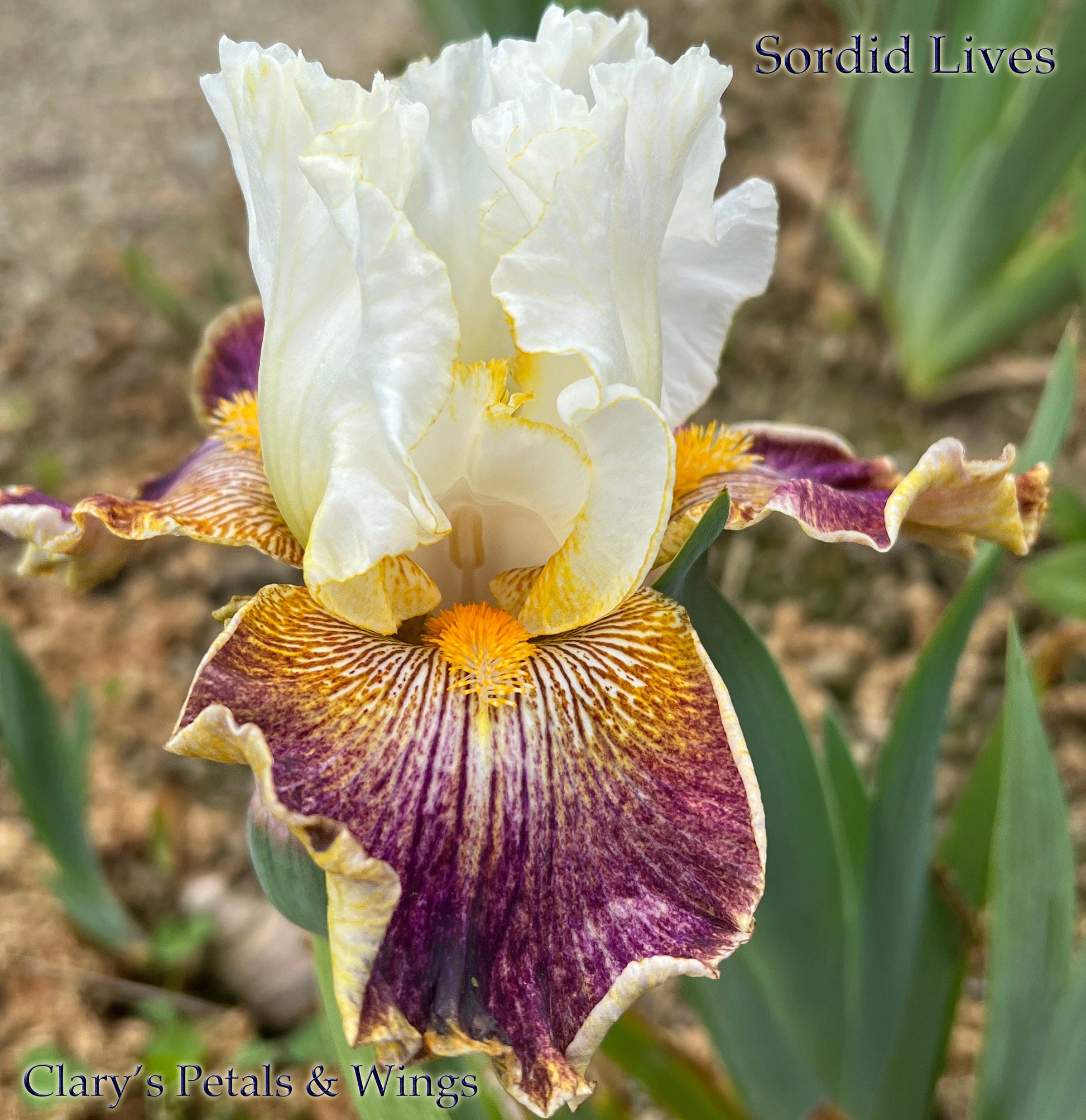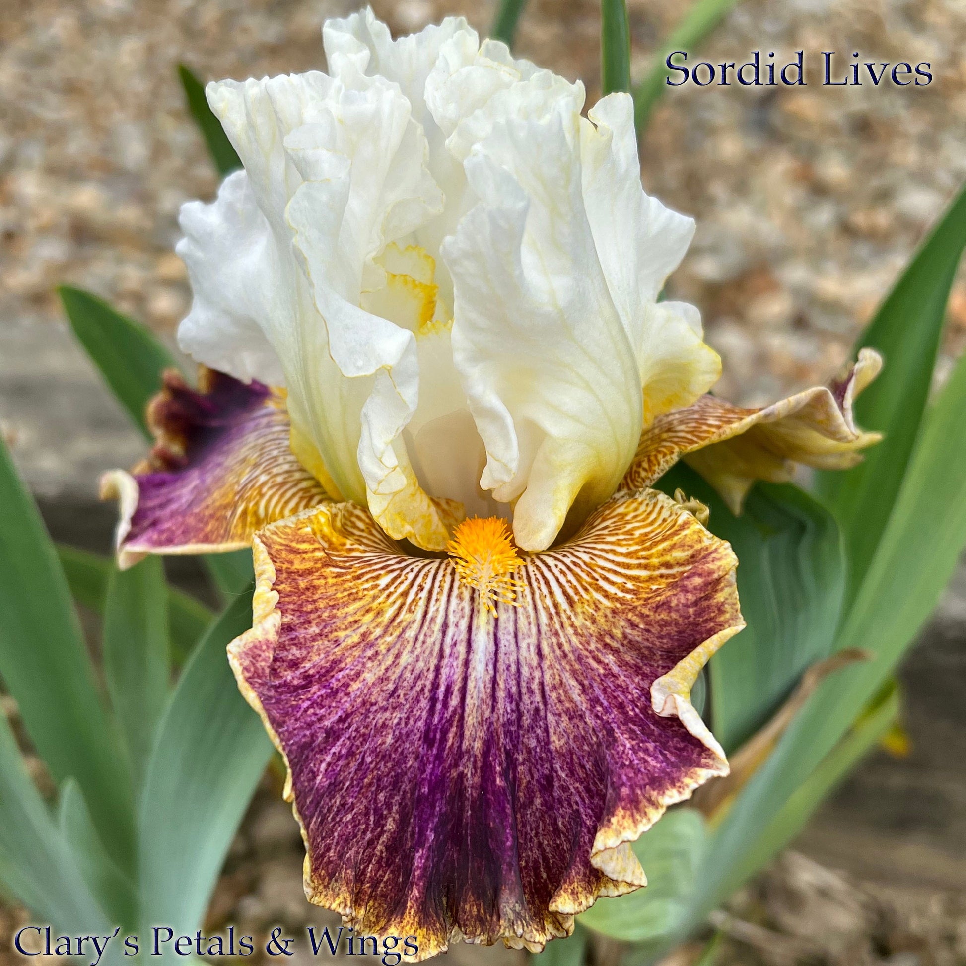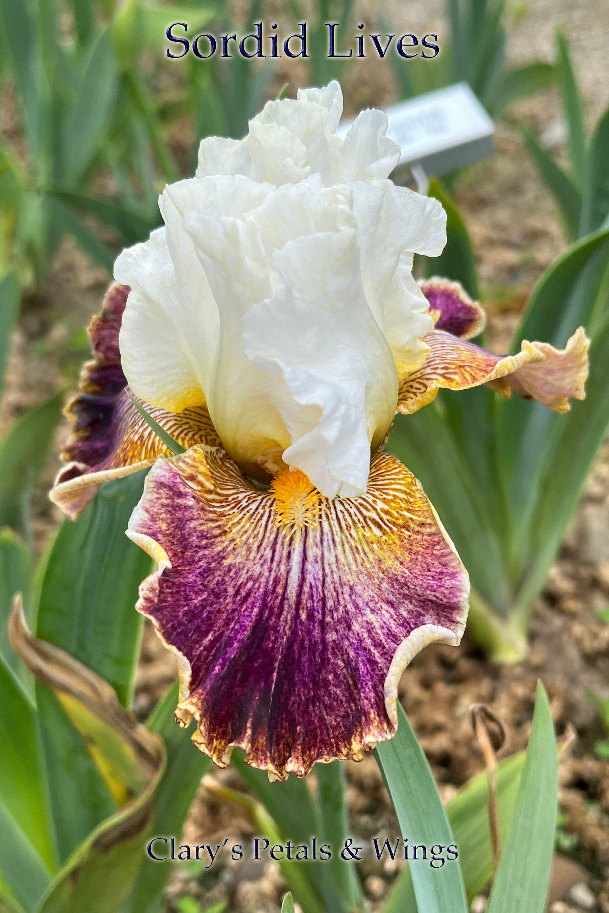 Pure-hearted white standards haloed in gold are in divine contrast to the raucously colored and blatantly ruffled falls. Falls blend from white to light yellow with centers wildly washed, mottled, and dotted rose magenta to darker rose over centers leaving wide blended bands of off-white to yellow. Hafts are veined and sanded plum. Add to it zany yellow gold beards and you have an unforgettable experience. Strong show stalks with 3-4 branches and 8-11 buds arise from clean, healthy purple base foliage.