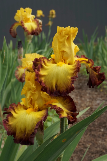 Hybridizer comment: Sunny chrome lemon to aureolin yellow standards and falls, the latter shaded with a fairly wide marginal band of warm, rusty brownish-rose color. Sunny bright beards of deep golden glow. Terminal plus three branches, seven buds. Good ruffled form, good branching, good garden presence . A most welcome mix of sunshine and shade.