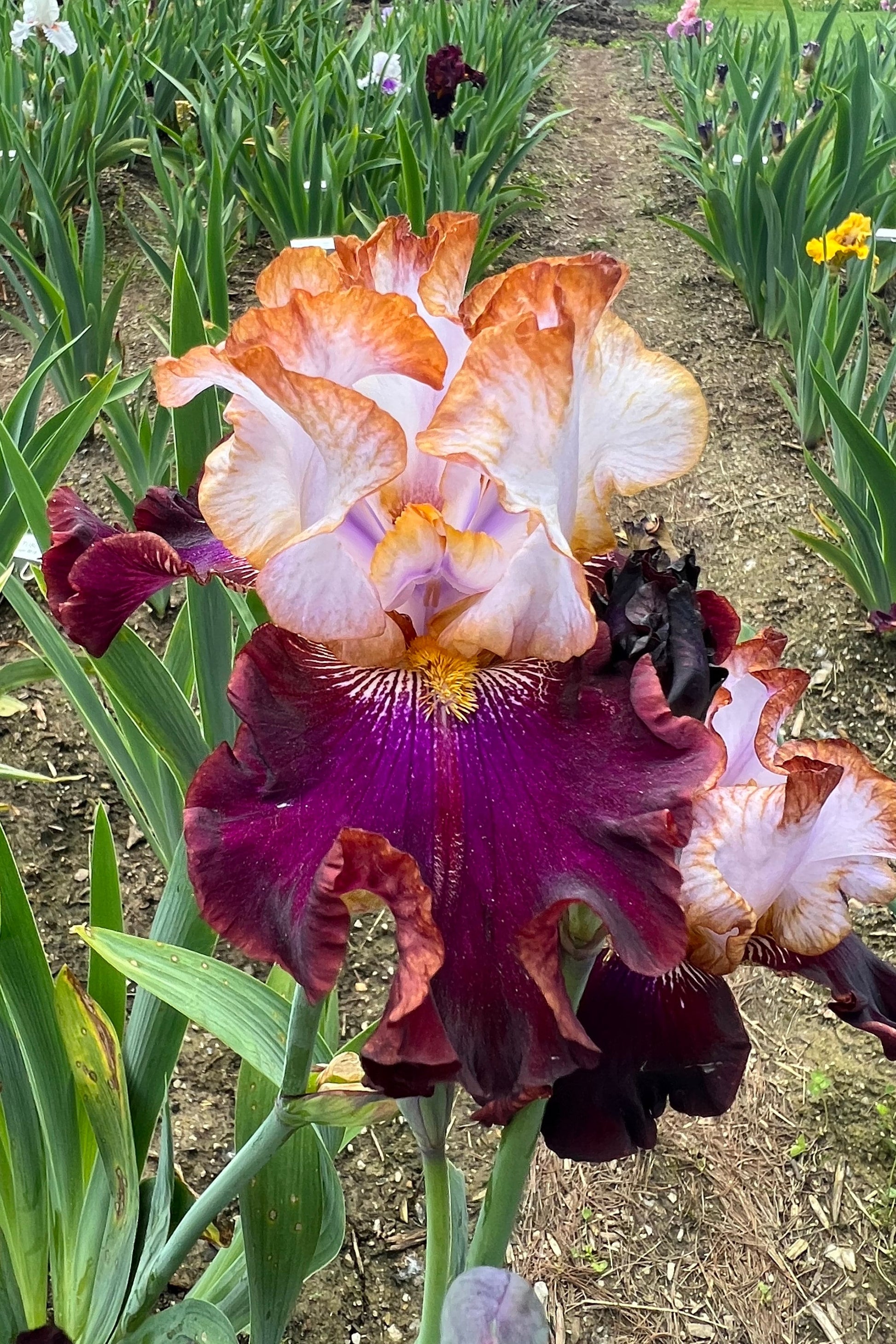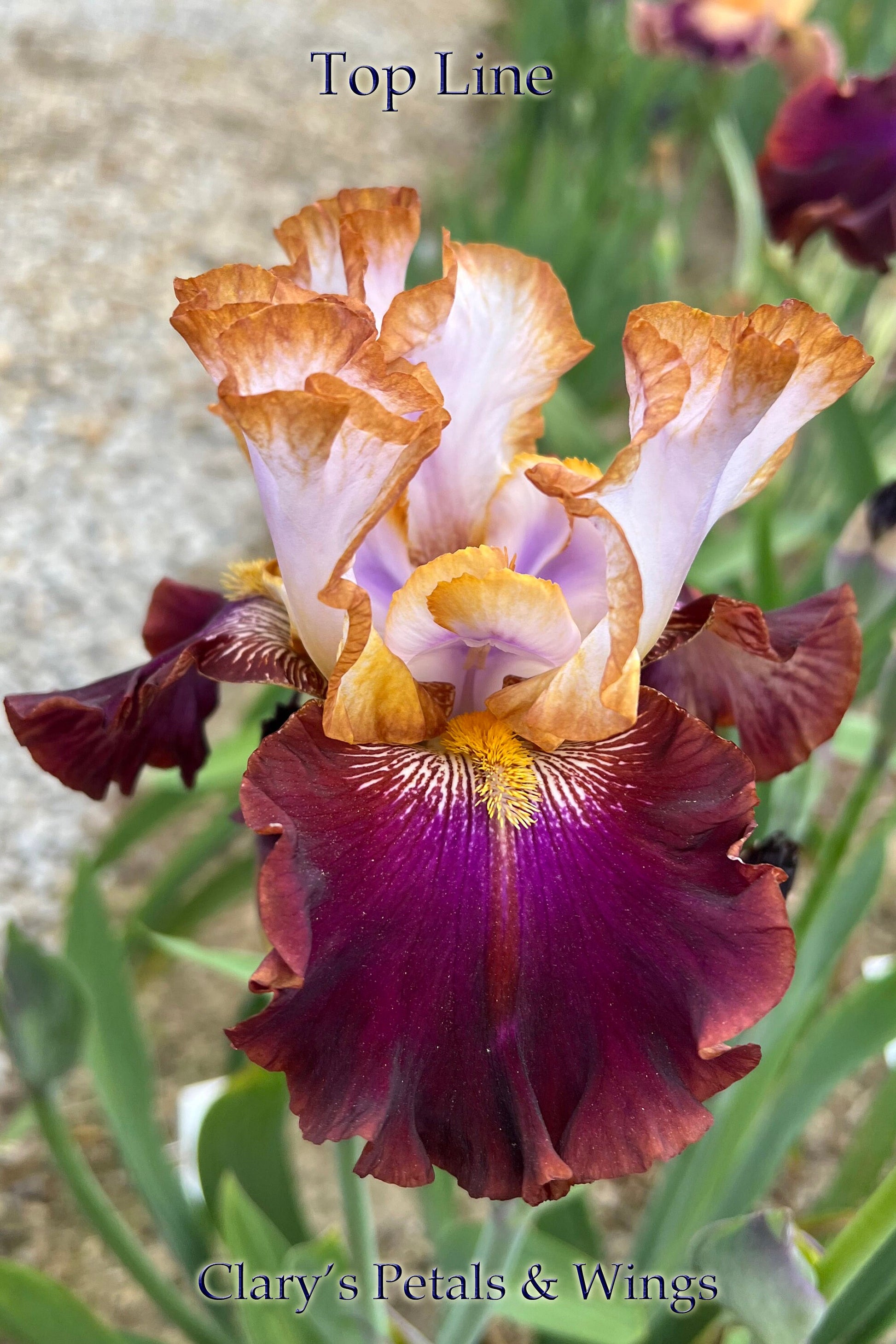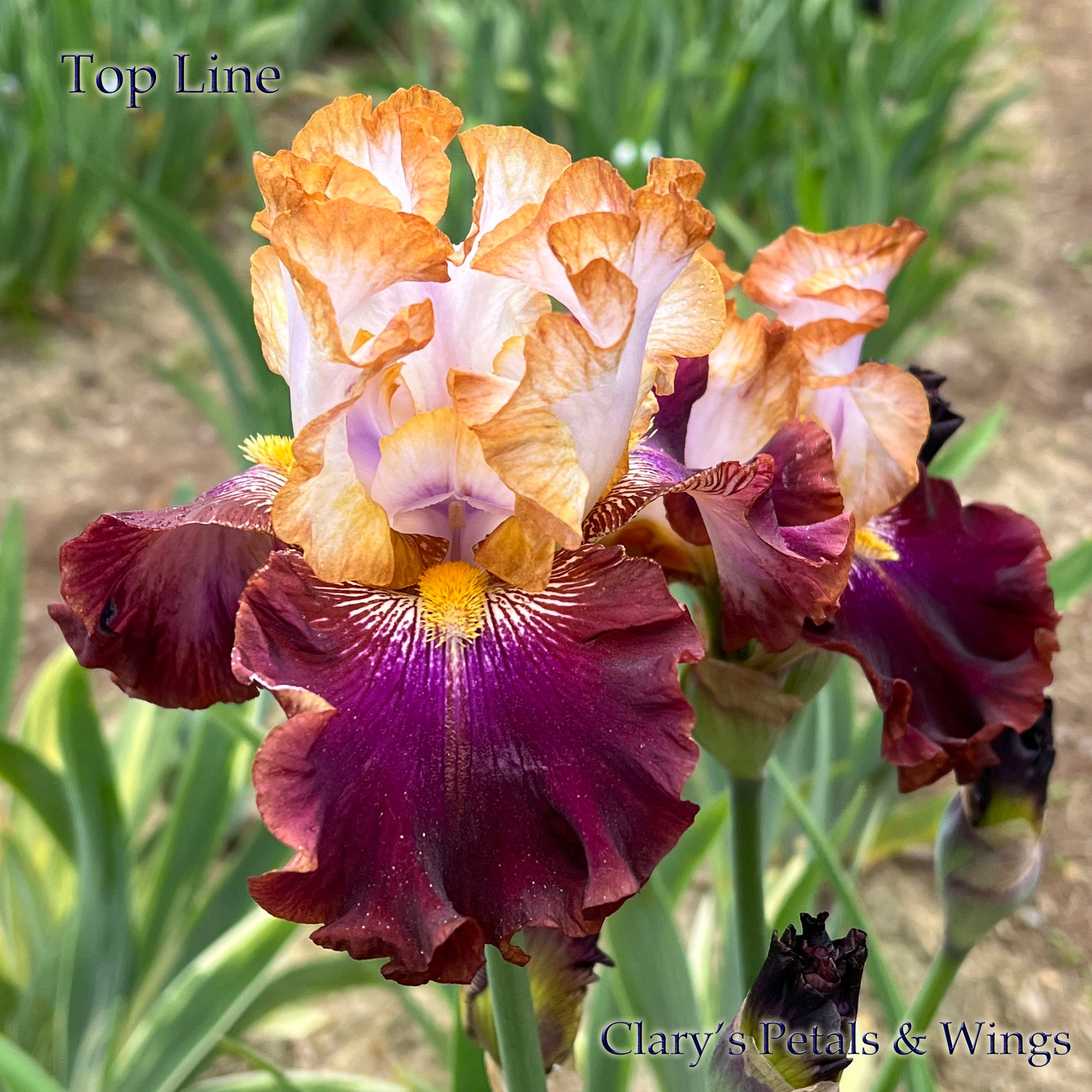 Striking 1” golden brown rim edges the white standards. Ruby red falls have some slight white markings around the old gold beards. Extremely vigorous and floriferous with 7 buds on nice stalks and a nice sweet scent Grows to 35 inches tall and blooms mid/late season.