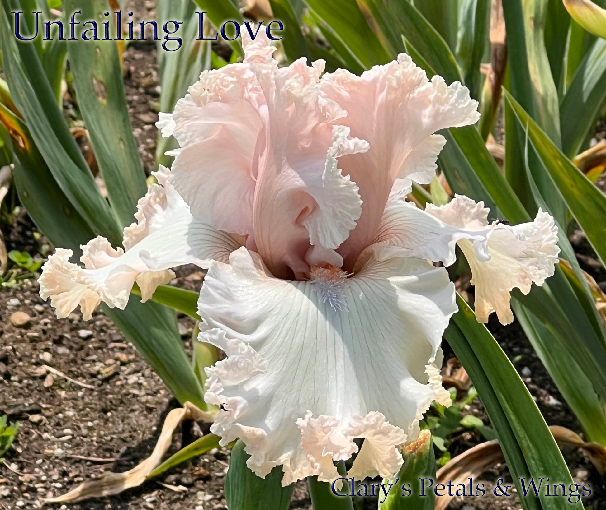 Soft and pleasing pale pink standards have slight verdigris veining up mid ribs. White falls are pink in throat and at edge. Heavily laced and strongly ruffled flowers are carried on perfectly spaced branching with 7 to 9 buds. Tangerine beards and a heavenly sweet scent add to an already amazing flower! Grows to 35 inches tall and blooms mid to late season.
