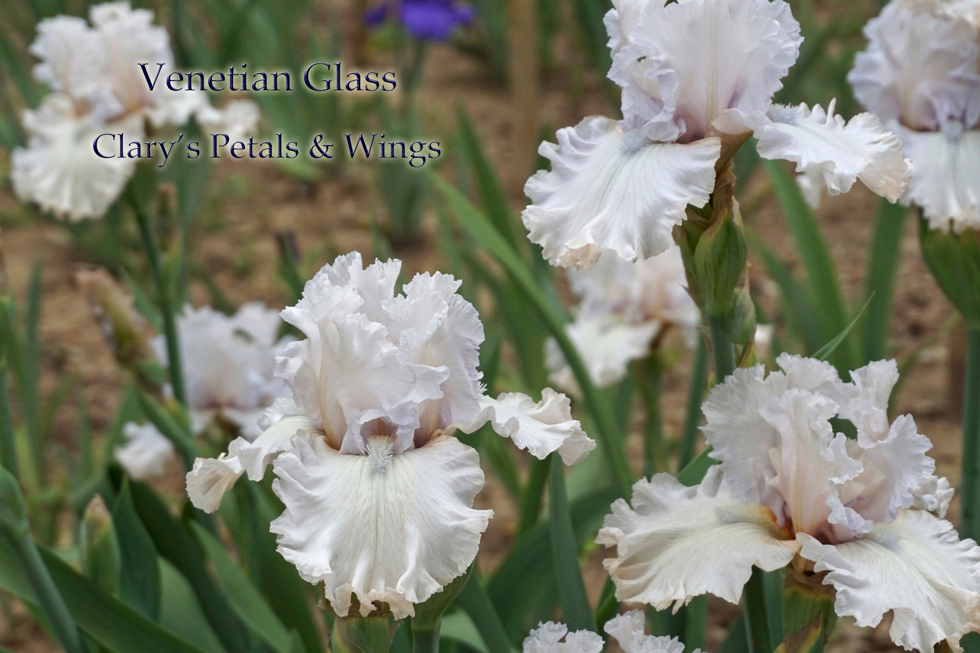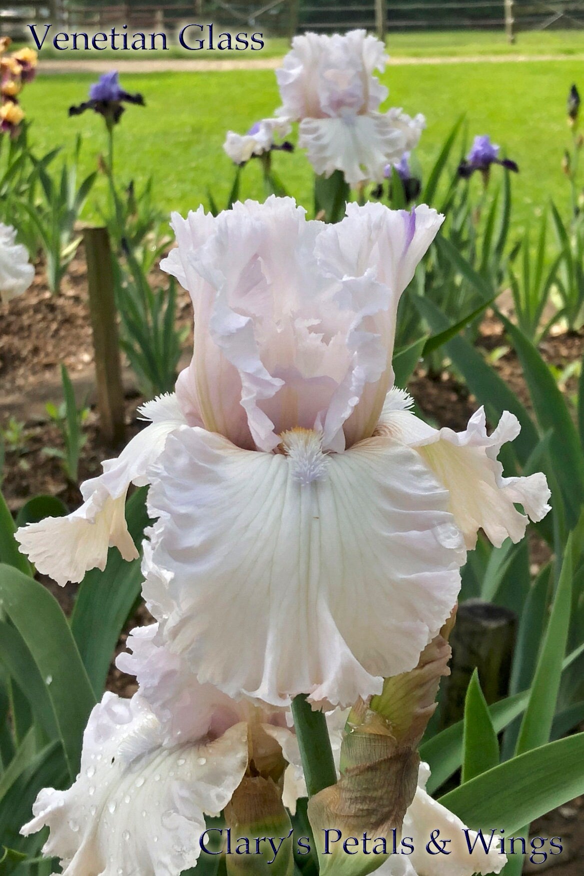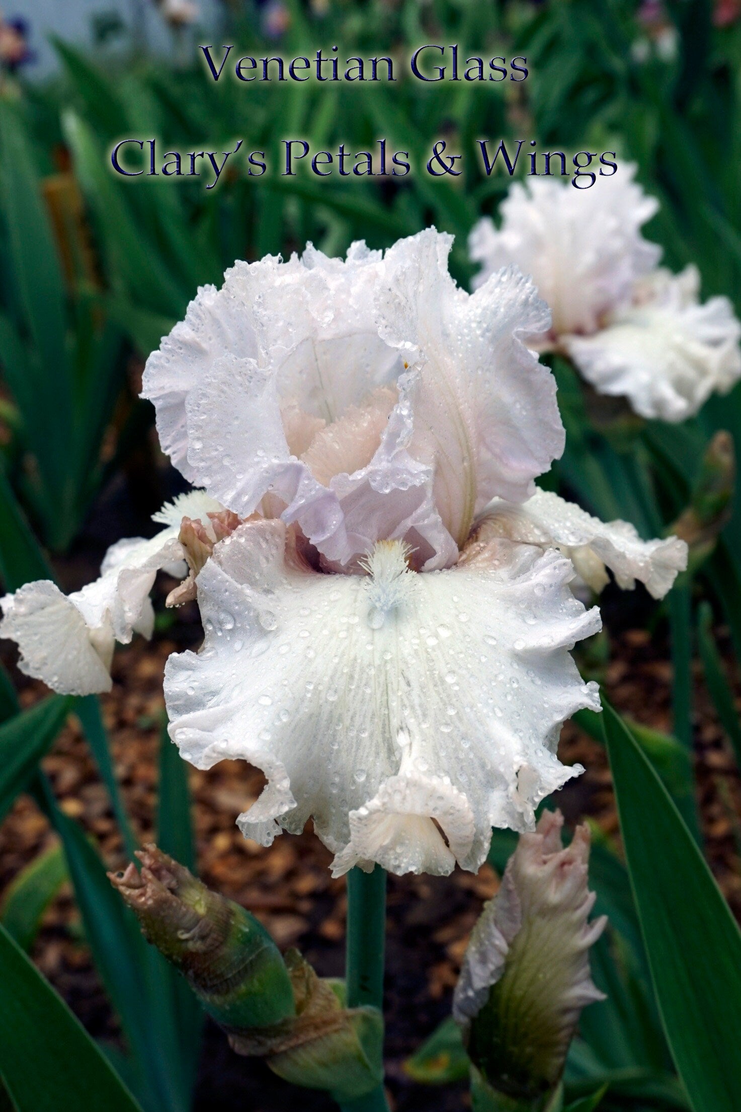 Ruffled and lightly laced milky palest pink undertoned faint blue with an art glass quality. Cool white beards, tipped red in heart. Blooms mid season 33 inches tall.