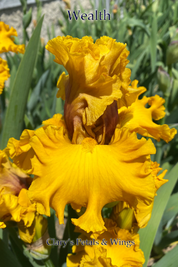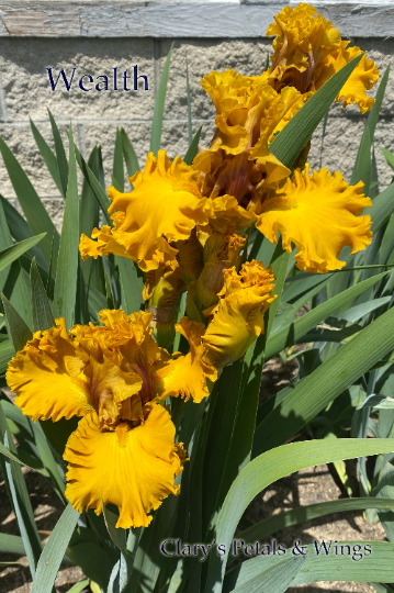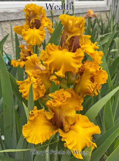 Rich quince yellow standards, with base and center lightly suffused slate violet. Falls heavily ruffled with shirred sides, and a color of which Midas would have approved: an intense, dark golden yellow with edges shaded brass and with matching dark golden beards. Seven to nine or more buds, heavy substance, and as a bonus: purple-based foliage. Vigorous growth makes this a good investment. Grows to 36 inches tall and blooms early to mid season.