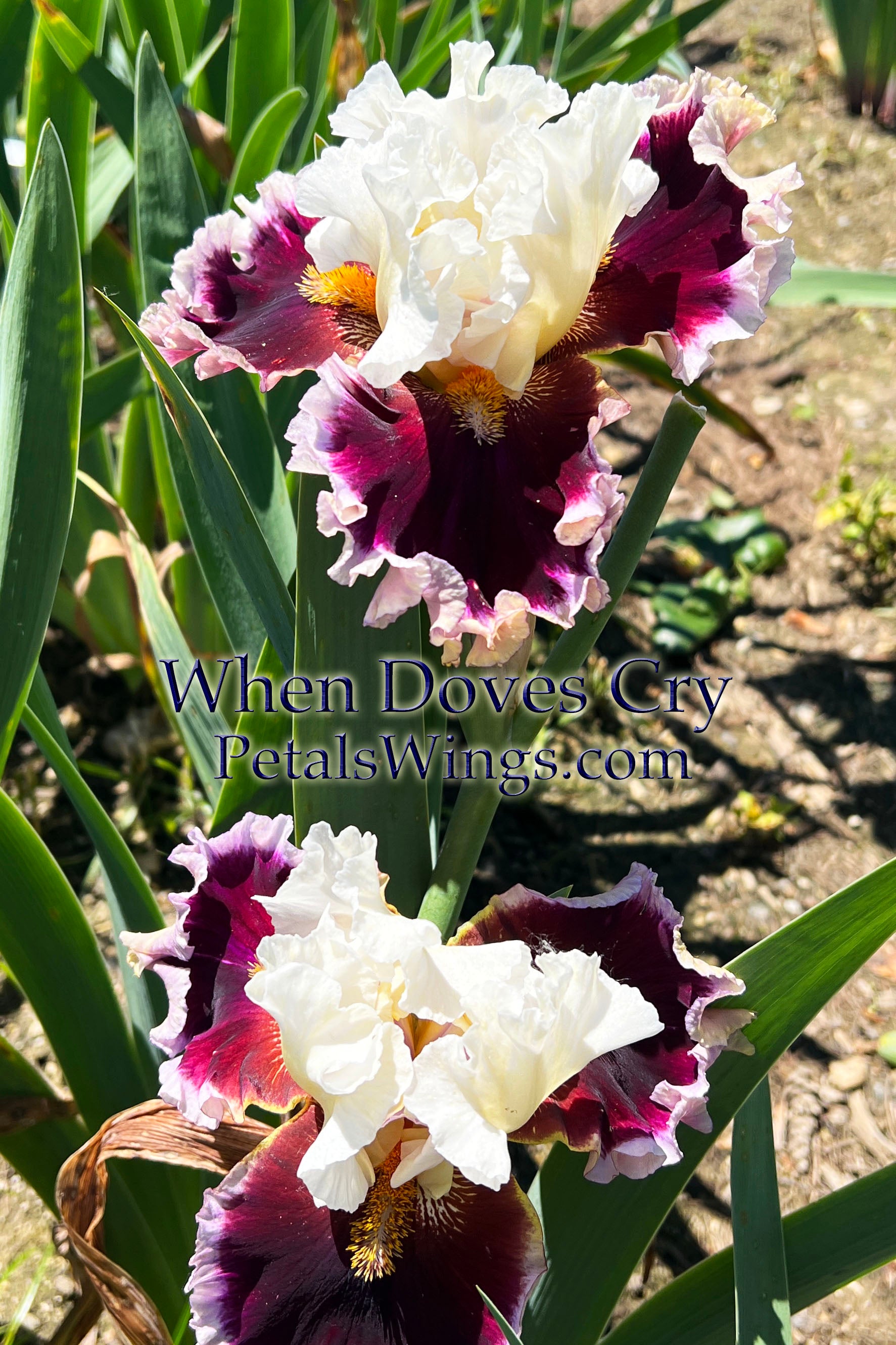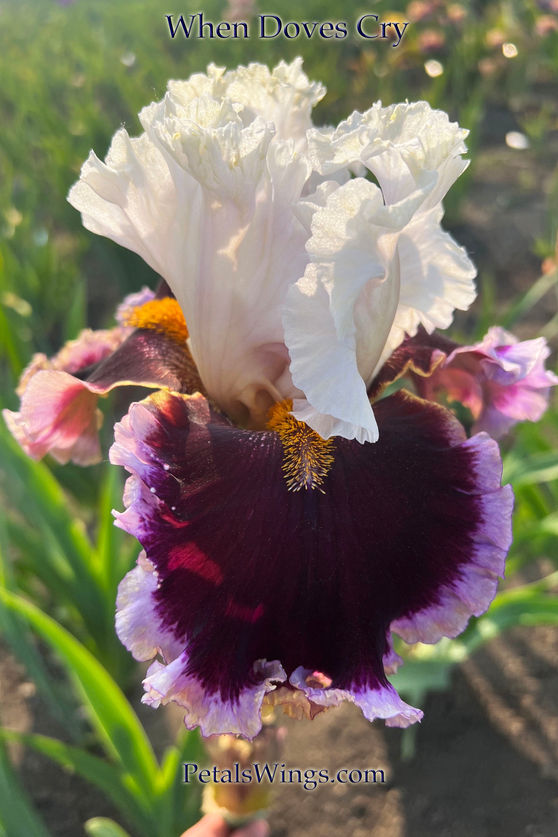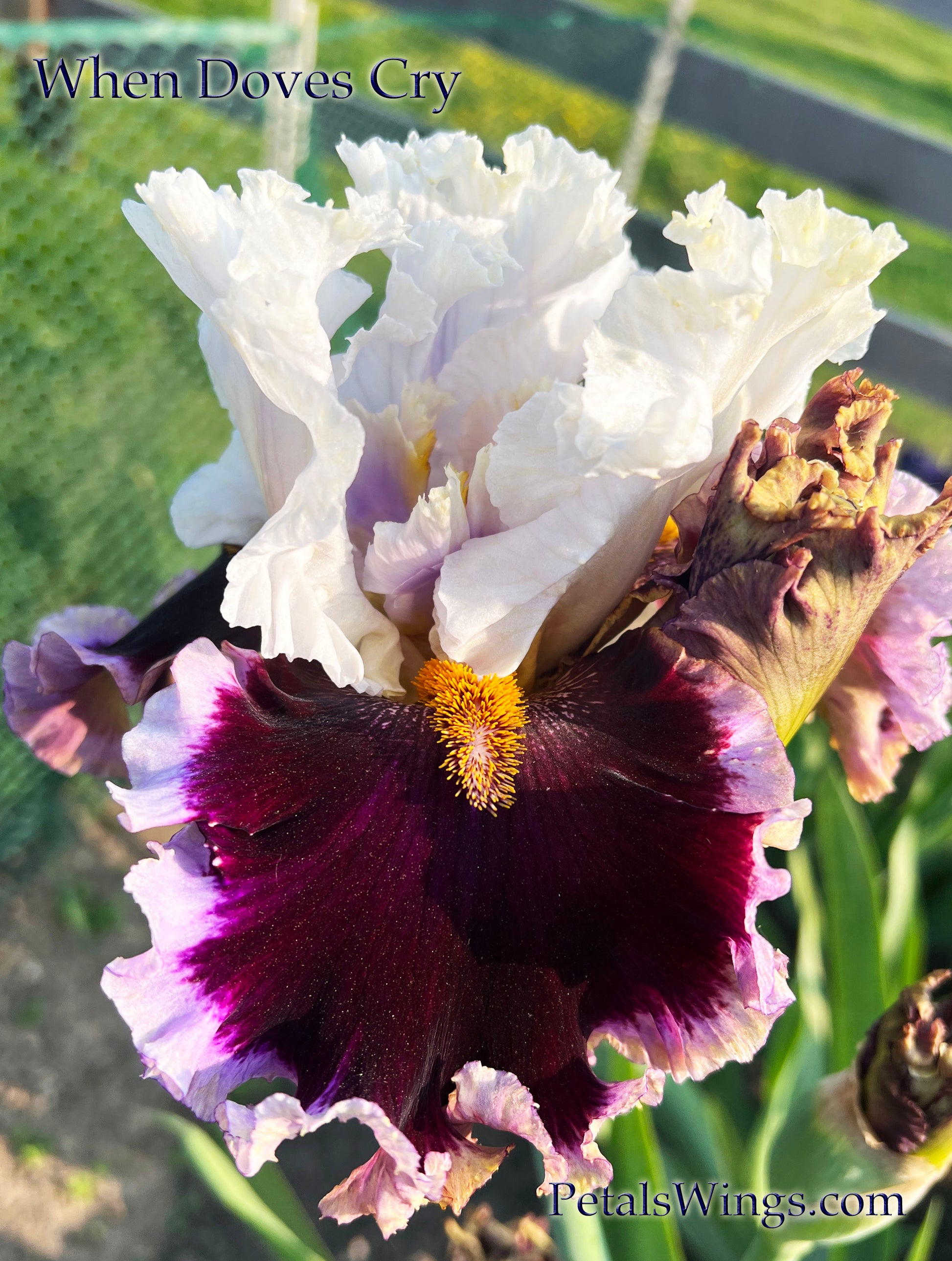 A lovely clean and ruffled bicolor iris. Standards are icy white with light lemon highlights especially shot up the midrib. Falls are a plush burgundy with nice wide and precise lavender bands and a darker wire rim. Nice orange beards contrast nicely with the plush burgundy falls. Grows to 36 inches tall and blooms mid season.