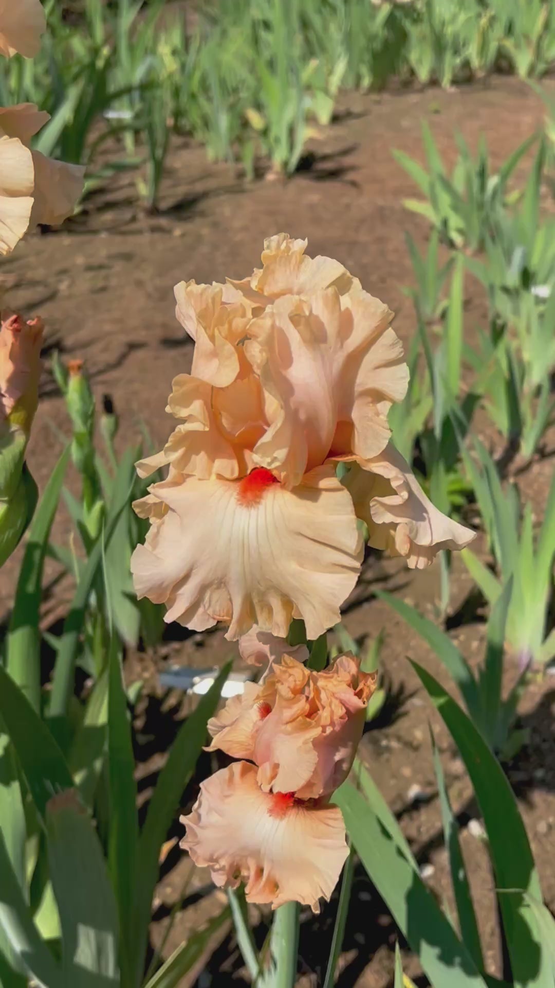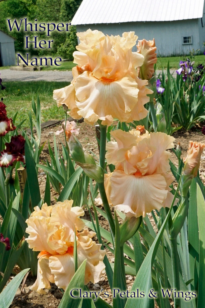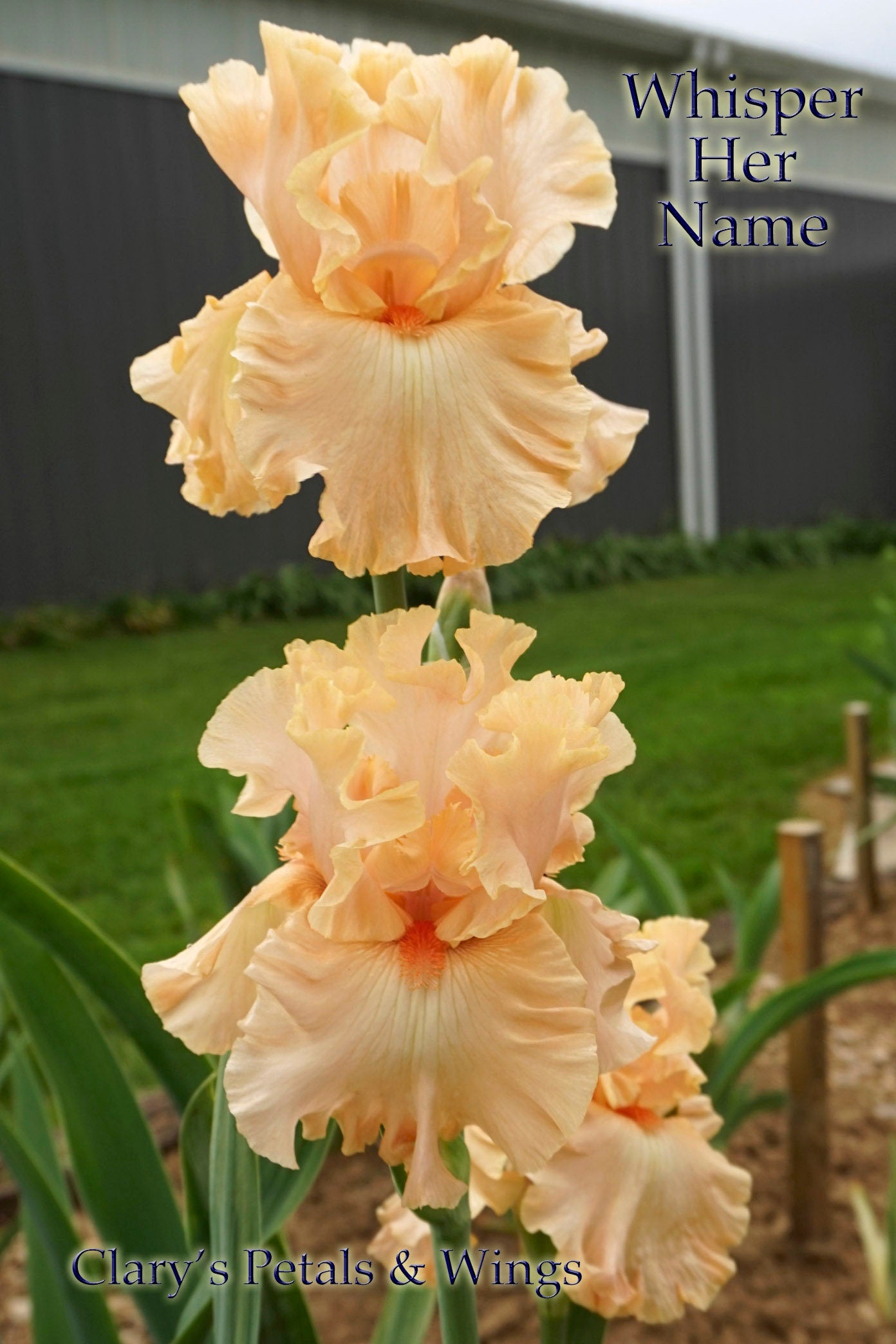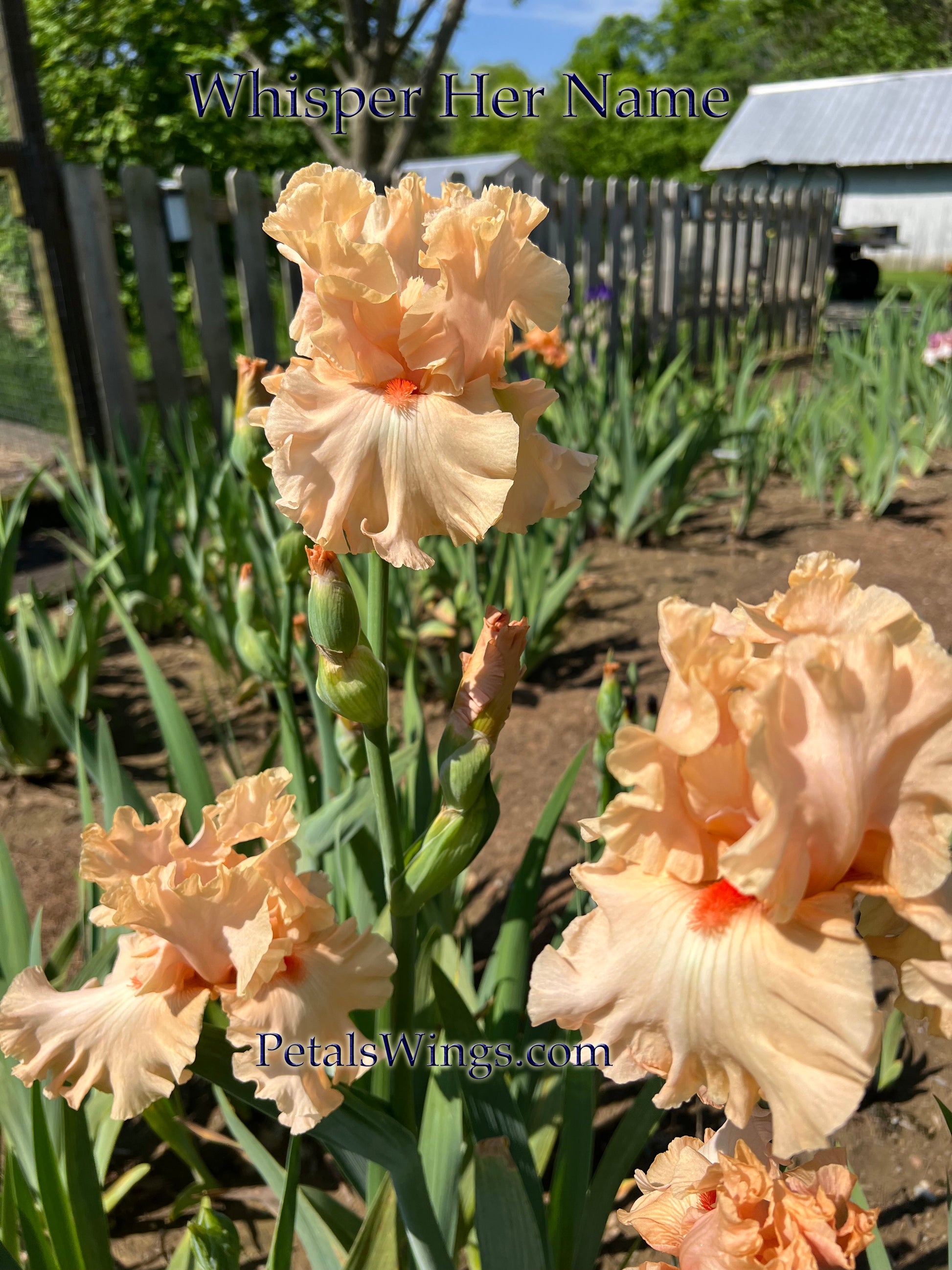 Clear light peach salmon self with coral tangerine beards. Huge flowers stand very tall and strong with a pronounced fragrance. Lots of buds on this beauty makes for a very long bloomtime. Grows to 38" and blooms early to mid season.